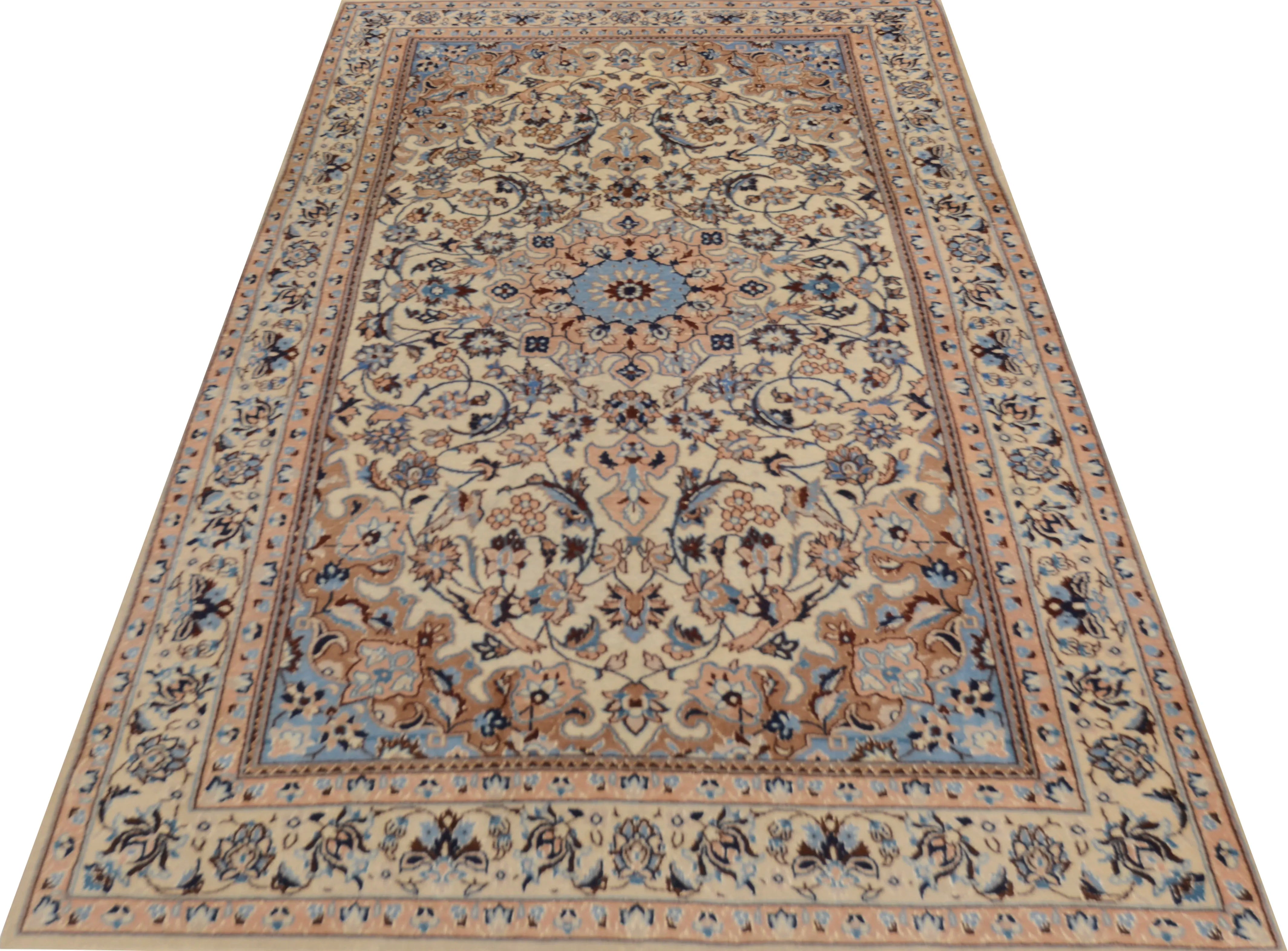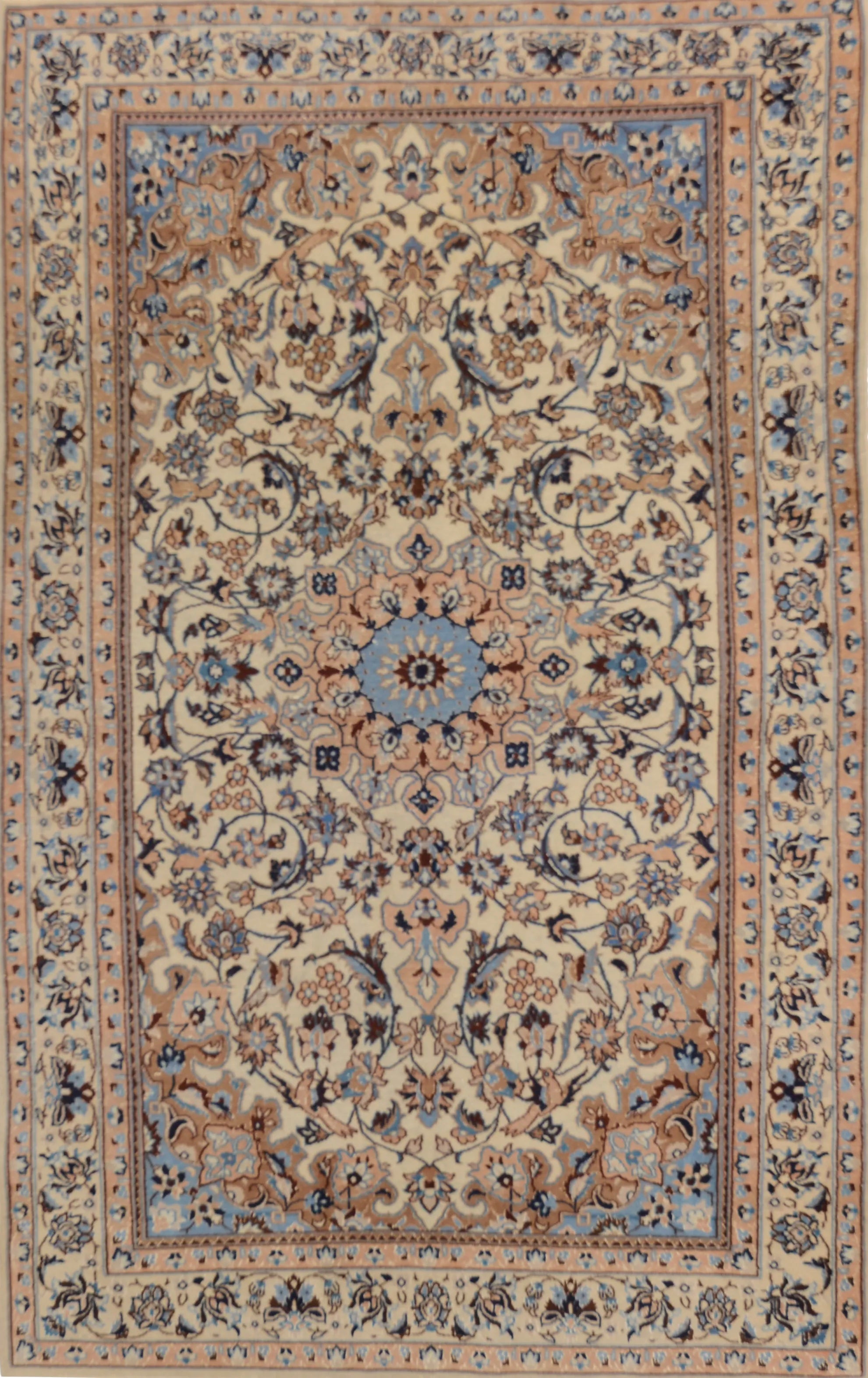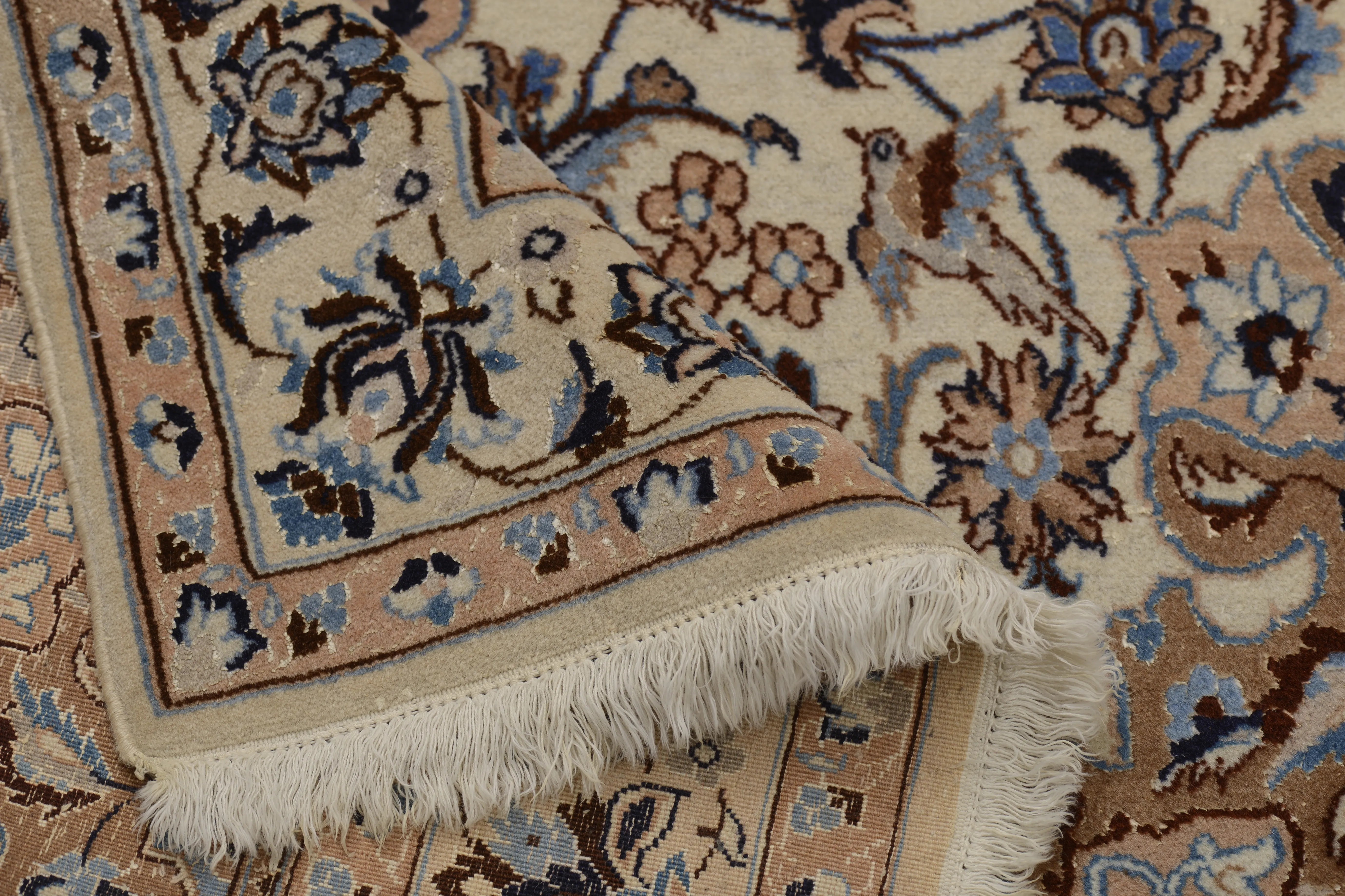 Nain rugs are hand-knotted rugs made in the city of Nain (or Na'in) and its surrounding areas in the central Persian province of Isfahan. These rugs are celebrated for their high quality, fine craftsmanship, and elegant design. Typically made from the finest wool yarn, Nain rugs feature a soft and lint-free surface. Some may also contain silk threads, especially in the pattern details or to add e x tra sheen to the rug. The production of Nain rugs is a slow and detailed process carried out by skilled artisans. The hand-knotting technique is central to creating the rugs’ comple x patterns and high quality. Typical patterns include flowers, arabesques, medallions, and geometric shapes. The design is often intricate and symmetrical, giving the rugs a distinct aesthetic character. The color palette for Nain rugs is usually subtle and sophisticated, with shades of ivory, blue, gray, and beige. The light and bright colors contribute to creating a sense of elegance and airiness in the rugs. Nain rugs are known for their elegance and classic Oriental style. Their fine craftsmanship and subtle patterns make them a popular choice for both traditional and modern home environments. These rugs are usually medium to small in size and suitable for various uses, including living rooms, bedrooms, and dining areas. On the international rug market, Nain rugs are highly sought after for their high quality, skilled craftsmanship, and elegant design.
