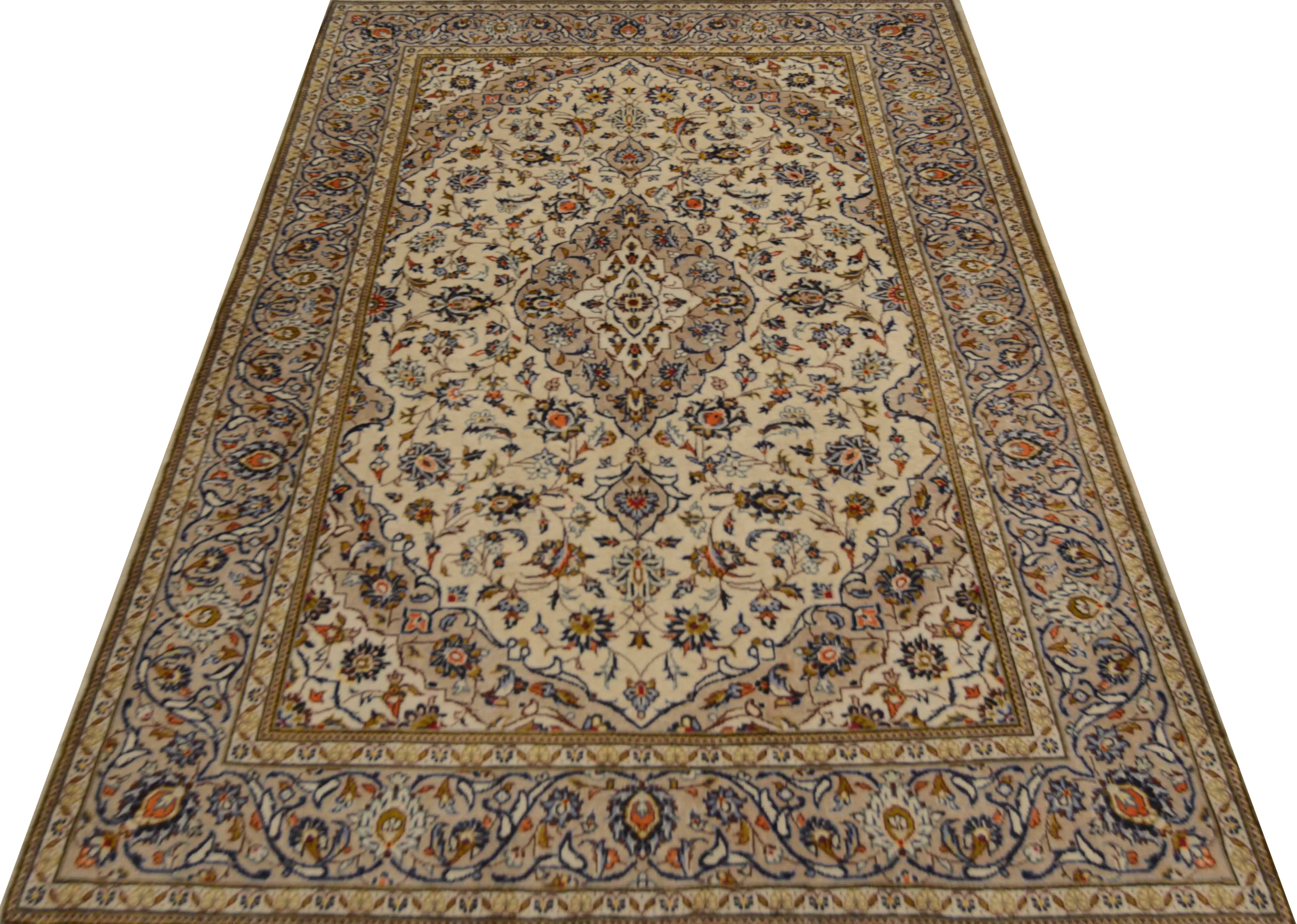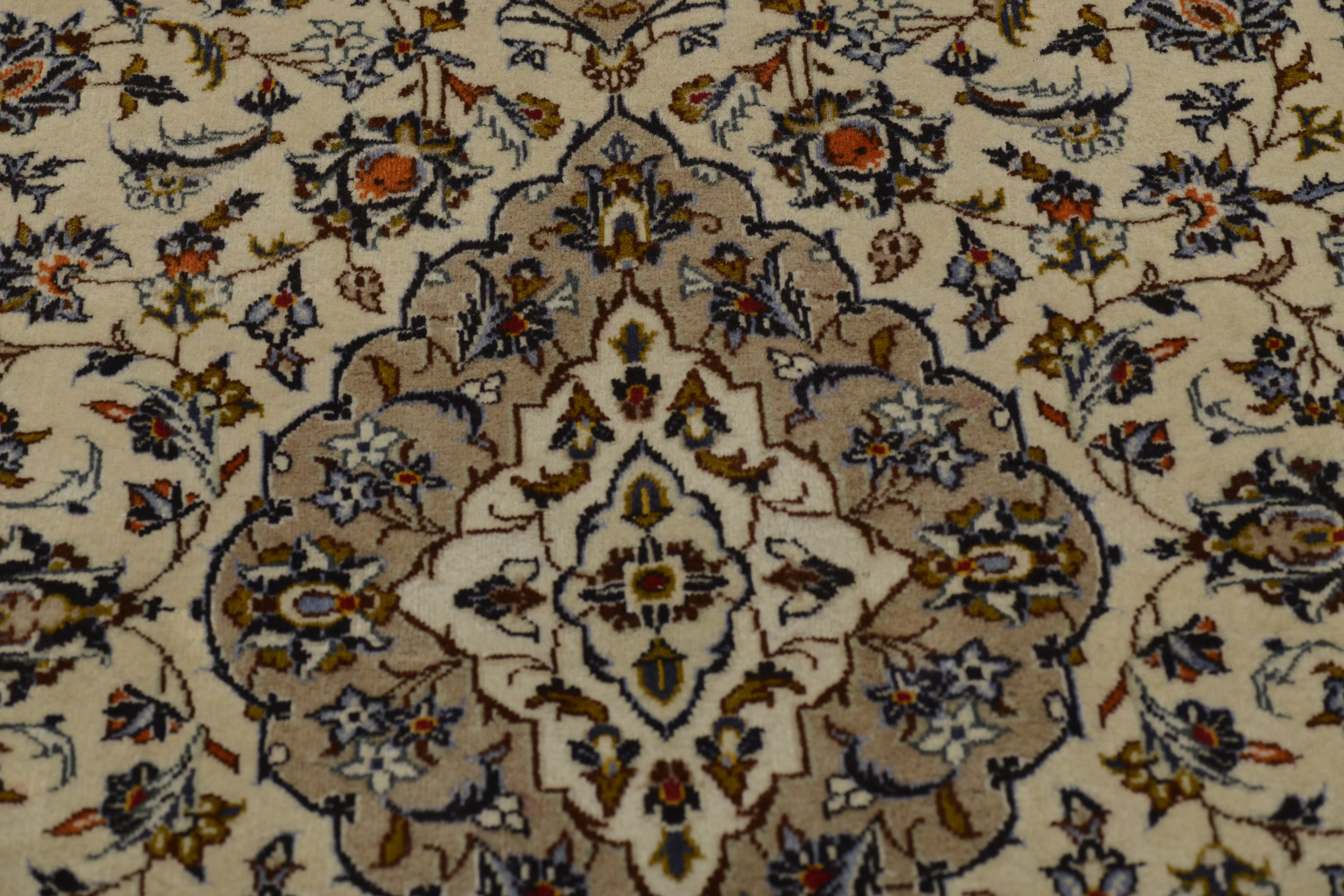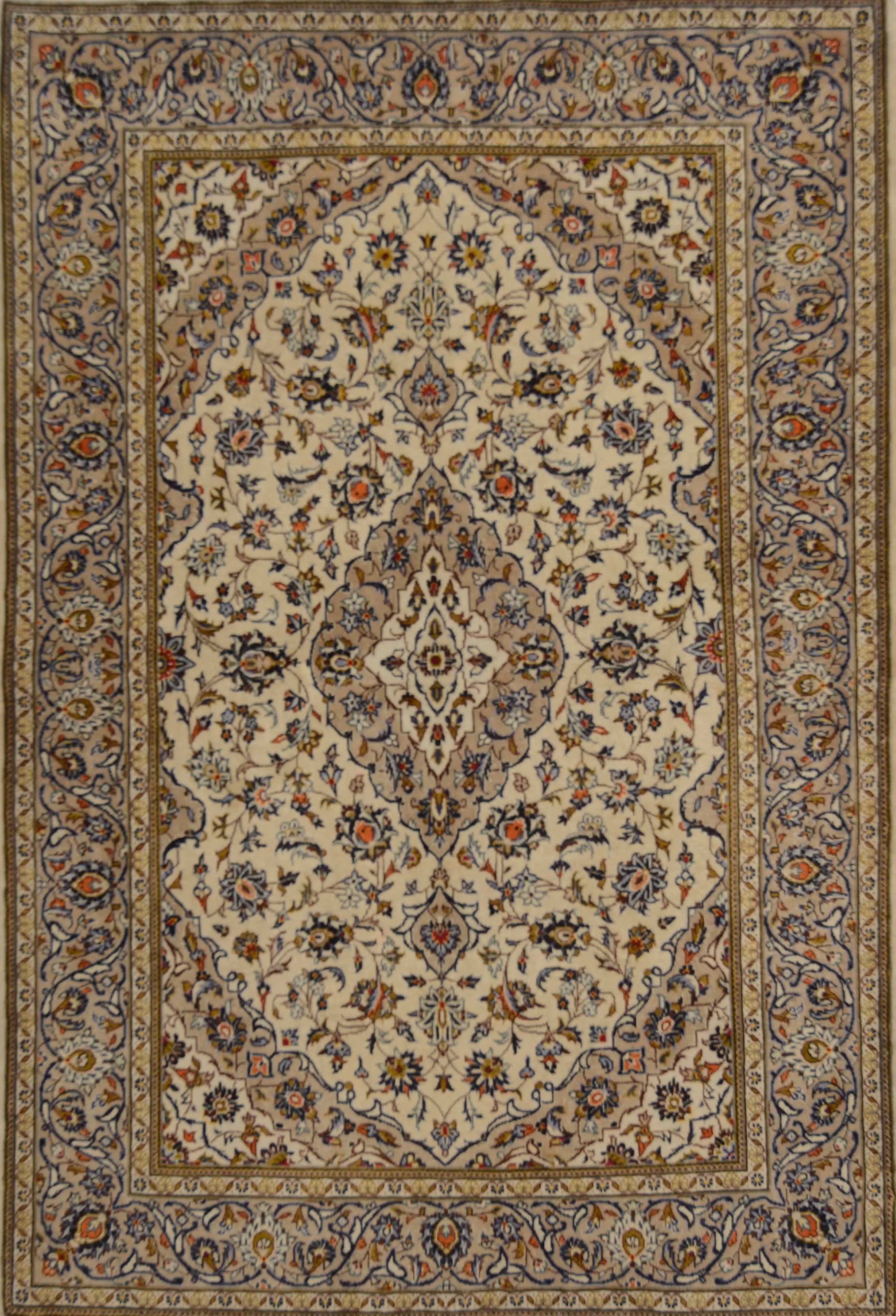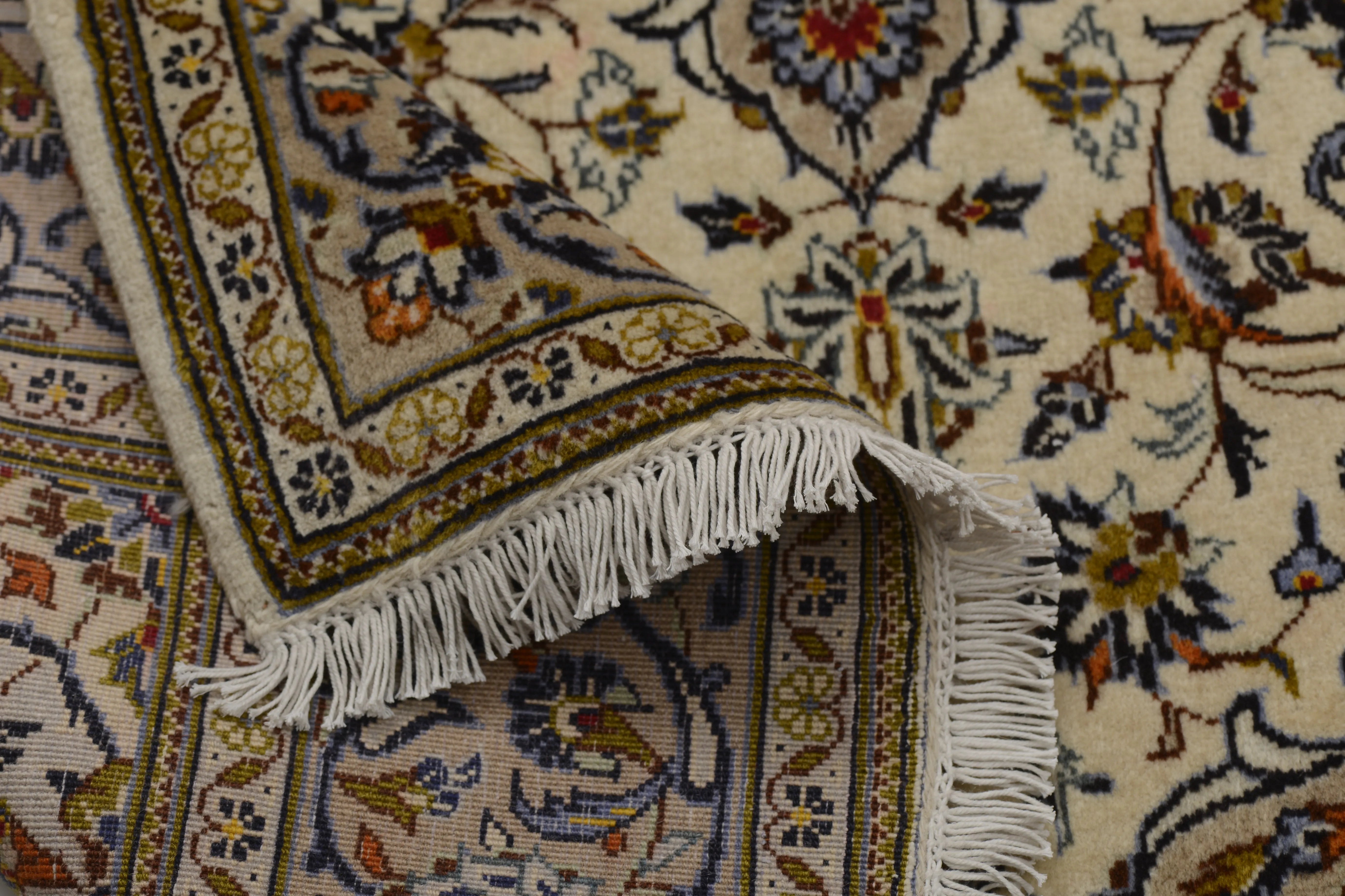 Kashan (or Keshan) rugs are truly an e x ample of the finest in Persian rug artistry. They offer a combination of beauty, durability, and cultural value. If you're considering purchasing a Kashan rug, you can be sure that you're investing in a piece of Iranian culture and history that will bring joy and beauty for many years to come. Kashan rugs are hand-knotted with great precision and adhere to traditional weaving techniques that have developed over centuries. The rugs are known for their high knot density and intricate details. Kashan rugs often feature comple x patterns including large central medallions, flowers, arabesques, and stylized plant motifs. The patterns are often symmetrical and have a harmonious design that reflects traditional Persian art. The most commonly used colors in Kashan rugs are red, blue, ivory, and beige. These colors are often combined to create a rich and contrasting palette. The colors are traditionally made with natural dyes, giving them their deep and lasting appearance. Most Kashan rugs are made from high-quality wool, which provides a soft and durable surface. Some of the more e x clusive ones may also contain silk to add e x tra luster and richness in detail. The base of the rugs is usually made of cotton, which provides stability and structure to the rug. Kashan rugs are known for their high knot density, which makes them dense and durable. This high knot density allows for the creation of very detailed patterns and contributes to the rug's longevity. Kashan rugs are available in a variety of sizes, from small prayer rugs to large room-sized rugs. They are popular both for home use and as decorative items in public spaces. Kashan rugs are an important part of Iran's cultural heritage and represent a long tradition of artistic e x pression and craftsmanship. They are often an e x pression of local culture and aesthetics and are considered a form of artwork. Many Kashan rugs have historically been made for royal courts and wealthy merchants, which marks them as symbols of lu x ury and status. They are still highly sought after both as collectibles and for decoration in e x clusive settings. Kashan rugs are often e x pensive due to their high quality and aesthetic value.