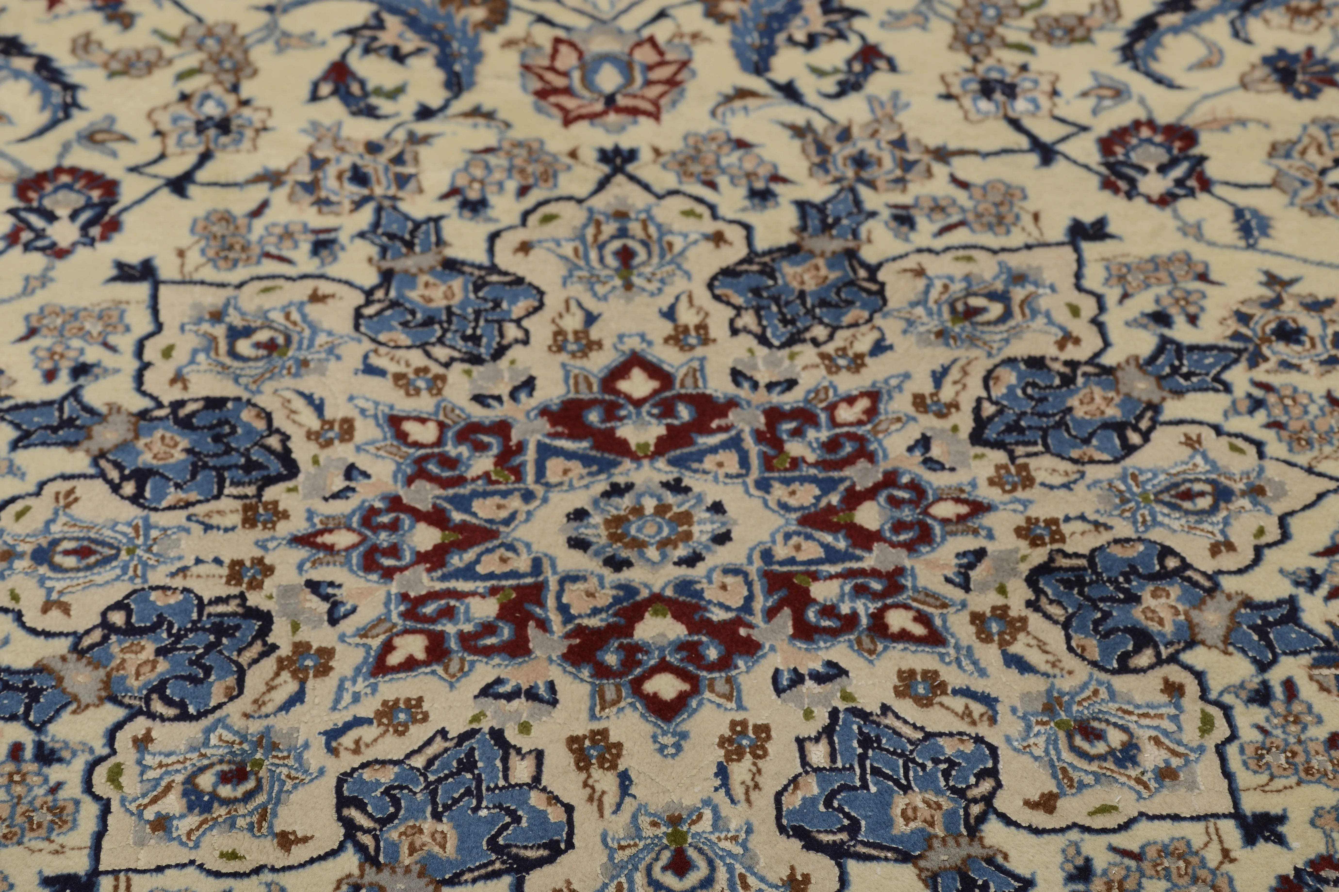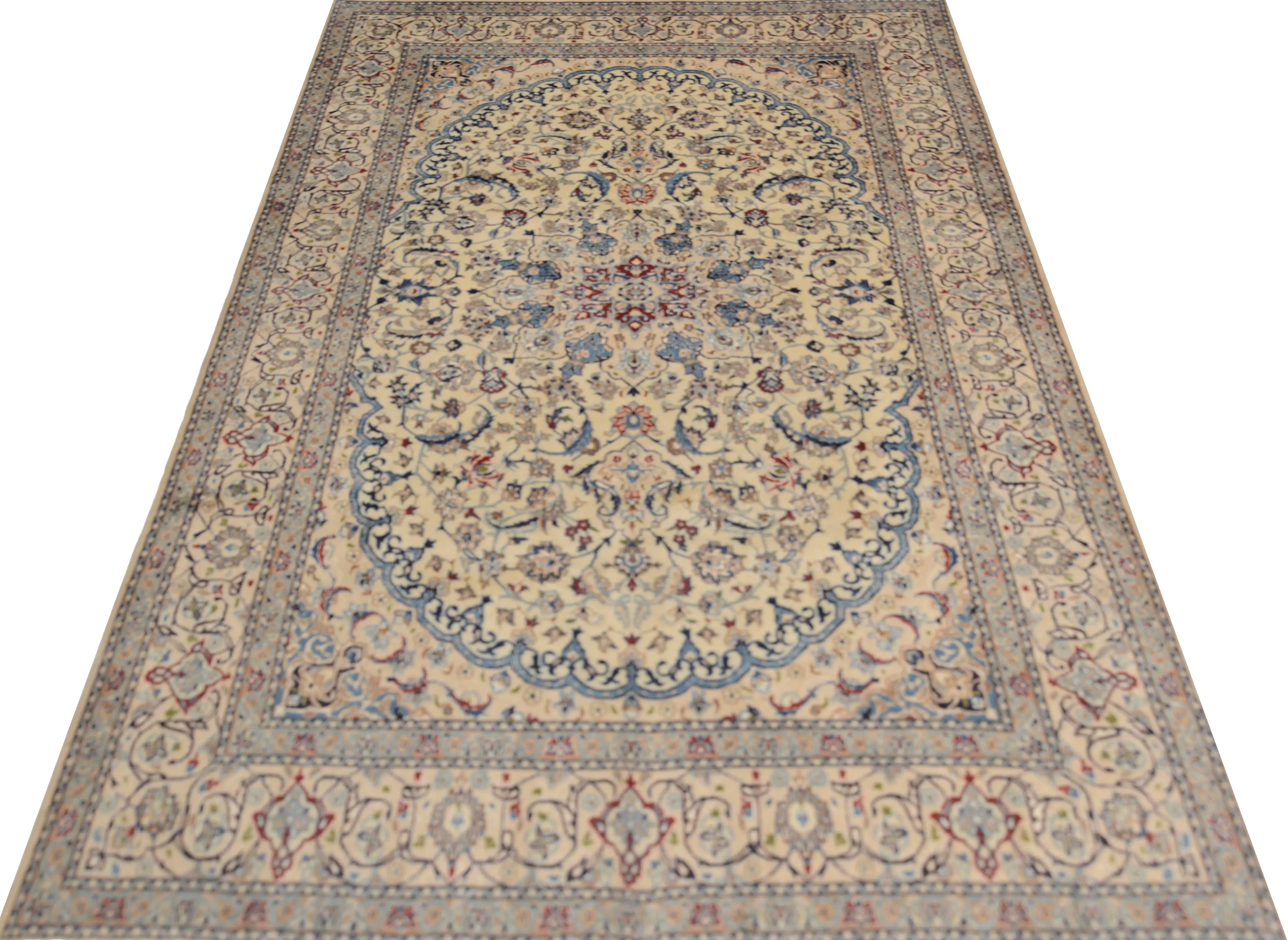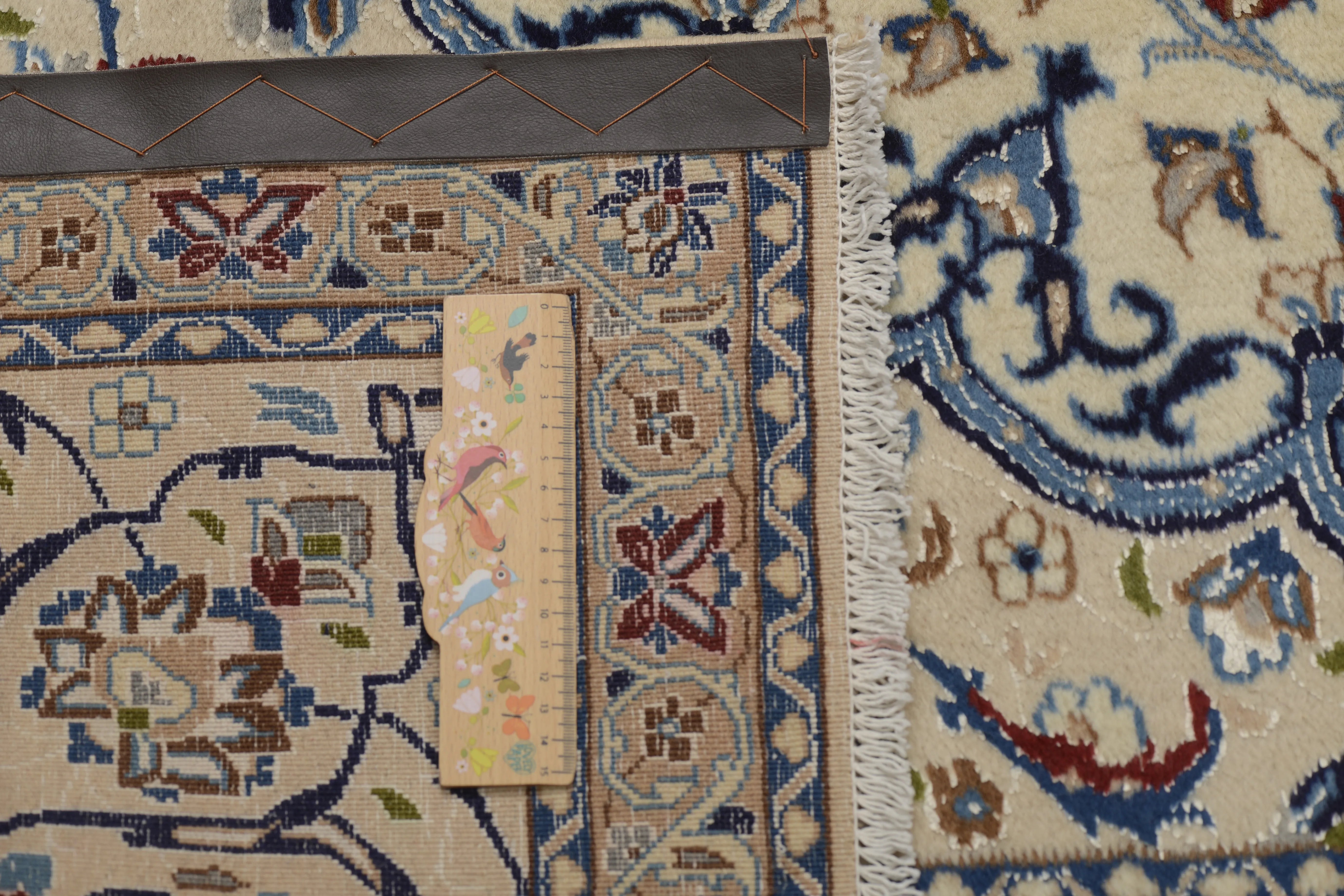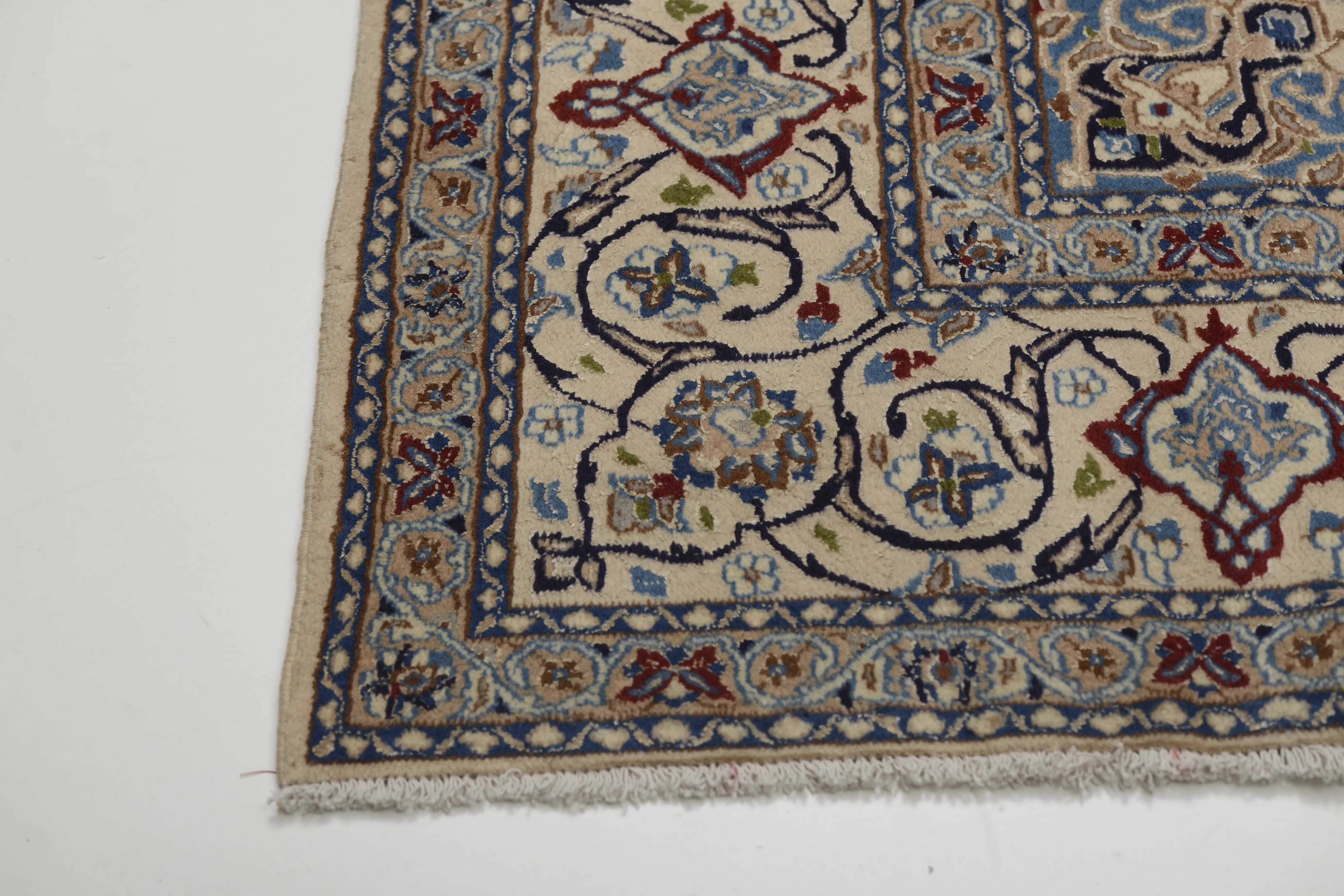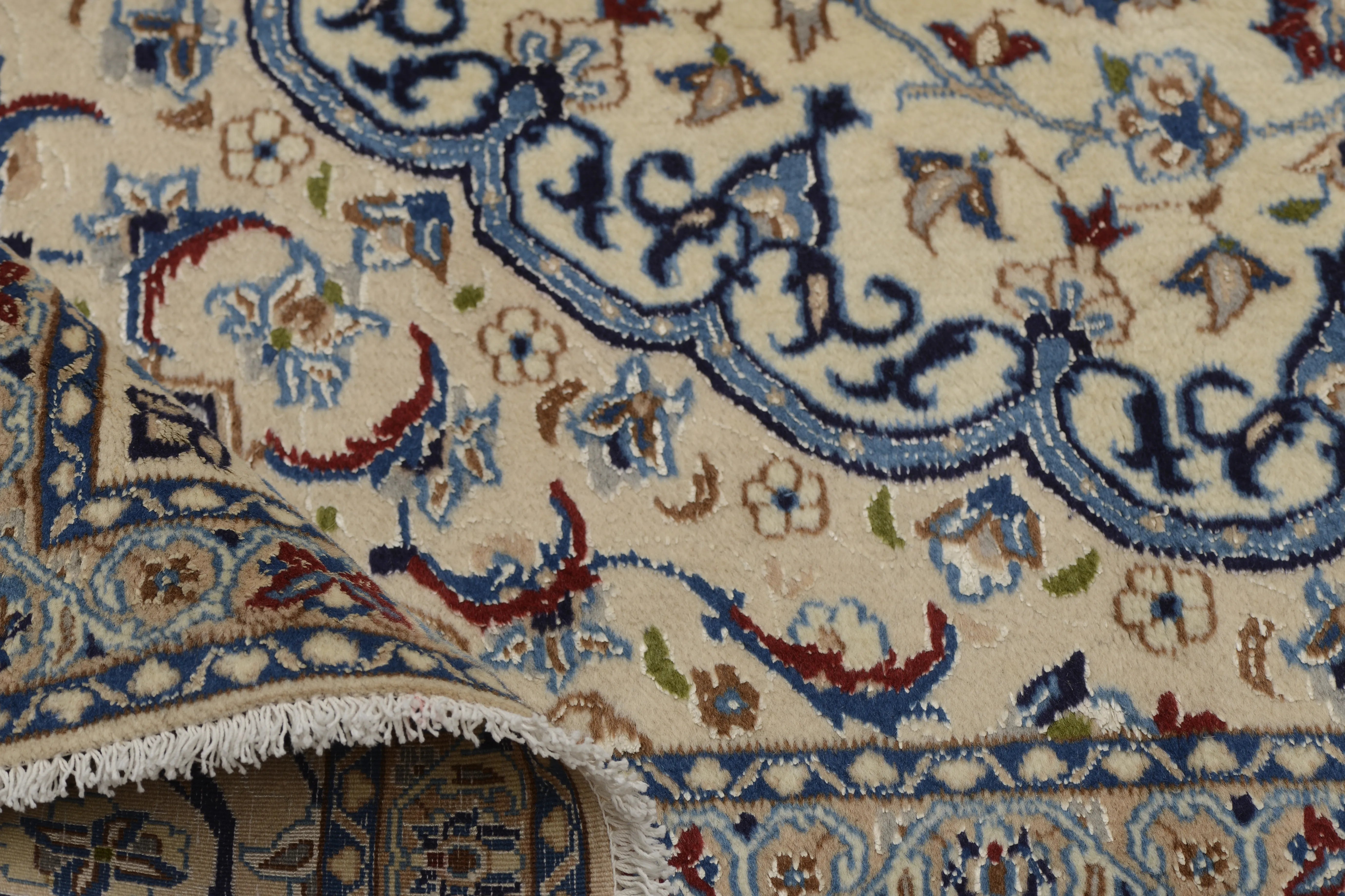 Nain rugs are hand-knotted rugs made in the city of Nain (or Na'in) and its surrounding areas in the central Persian province of Isfahan. These rugs are celebrated for their high quality, fine craftsmanship, and elegant design. Typically made from the finest wool yarn, Nain rugs feature a soft and lint-free surface. Some may also contain silk threads, especially in the pattern details or to add e x tra sheen to the rug. The production of Nain rugs is a slow and detailed process carried out by skilled artisans. The hand-knotting technique is central to creating the rugs’ comple x patterns and high quality. Typical patterns include flowers, arabesques, medallions, and geometric shapes. The design is often intricate and symmetrical, giving the rugs a distinct aesthetic character. The color palette for Nain rugs is usually subtle and sophisticated, with shades of ivory, blue, gray, and beige. The light and bright colors contribute to creating a sense of elegance and airiness in the rugs. Nain rugs are known for their elegance and classic Oriental style. Their fine craftsmanship and subtle patterns make them a popular choice for both traditional and modern home environments. These rugs are usually medium to small in size and suitable for various uses, including living rooms, bedrooms, and dining areas. On the international rug market, Nain rugs are highly sought after for their high quality, skilled craftsmanship, and elegant design.