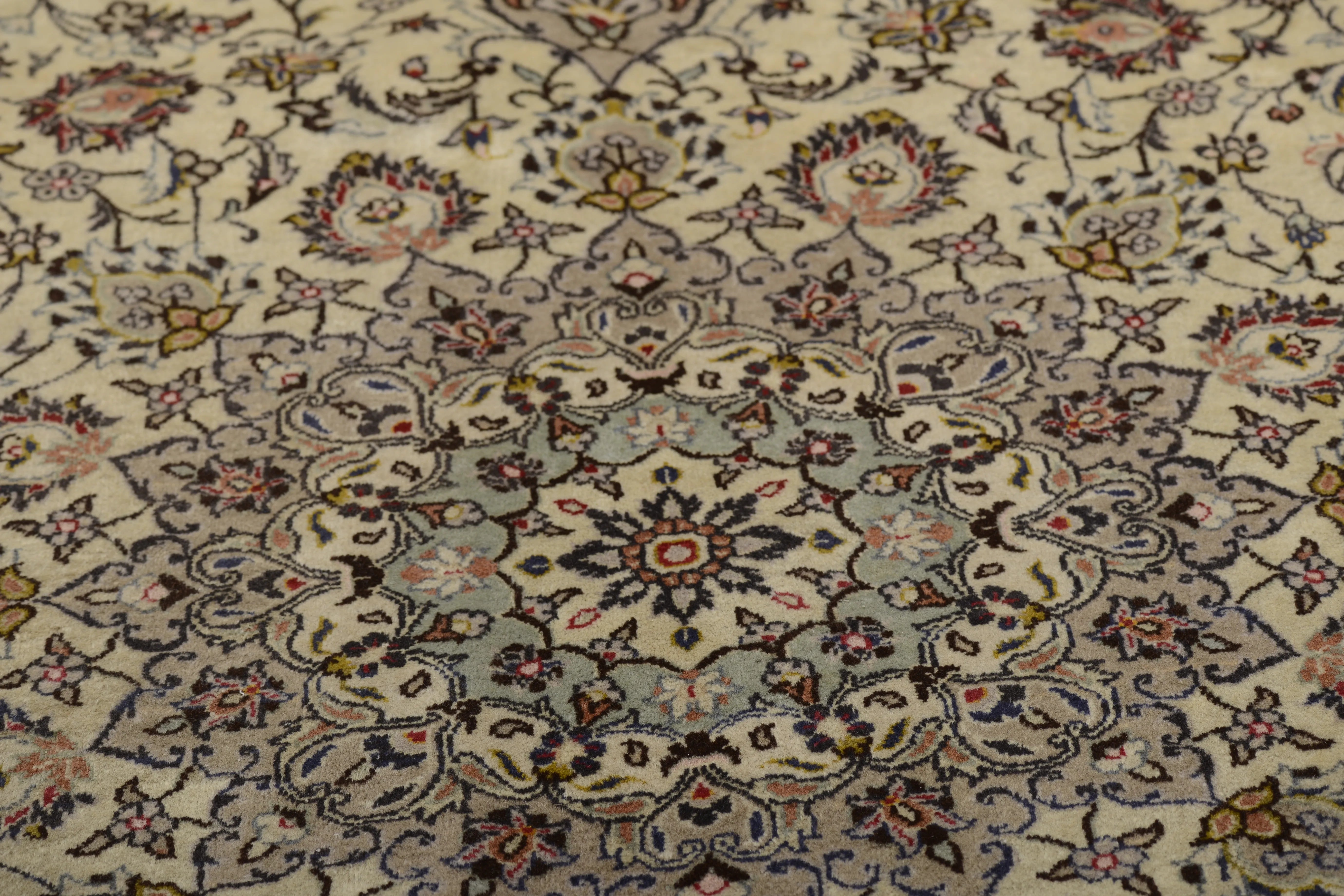 Kashan (or Keshan) rugs are truly an e x ample of the finest in Persian rug artistry. They offer a combination of beauty, durability, and cultural value. If you're considering purchasing a Kashan rug, you can be sure that you're investing in a piece of Iranian culture and history that will bring joy and beauty for many years to come. Kashan rugs are hand-knotted with great precision and adhere to traditional weaving techniques that have developed over centuries. The rugs are known for their high knot density and intricate details. Kashan rugs often feature comple x patterns including large central medallions, flowers, arabesques, and stylized plant motifs. The patterns are often symmetrical and have a harmonious design that reflects traditional Persian art. The most commonly used colors in Kashan rugs are red, blue, ivory, and beige. These colors are often combined to create a rich and contrasting palette. The colors are traditionally made with natural dyes, giving them their deep and lasting appearance. Most Kashan rugs are made from high-quality wool, which provides a soft and durable surface. Some of the more e x clusive ones may also contain silk to add e x tra luster and richness in detail. The base of the rugs is usually made of cotton, which provides stability and structure to the rug. Kashan rugs are known for their high knot density, which makes them dense and durable. This high knot density allows for the creation of very detailed patterns and contributes to the rug's longevity. Kashan rugs are available in a variety of sizes, from small prayer rugs to large room-sized rugs. They are popular both for home use and as decorative items in public spaces. Kashan rugs are an important part of Iran's cultural heritage and represent a long tradition of artistic e x pression and craftsmanship. They are often an e x pression of local culture and aesthetics and are considered a form of artwork. Many Kashan rugs have historically been made for royal courts and wealthy merchants, which marks them as symbols of lu x ury and status. They are still highly sought after both as collectibles and for decoration in e x clusive settings. Kashan rugs are often e x pensive due to their high quality and aesthetic value.