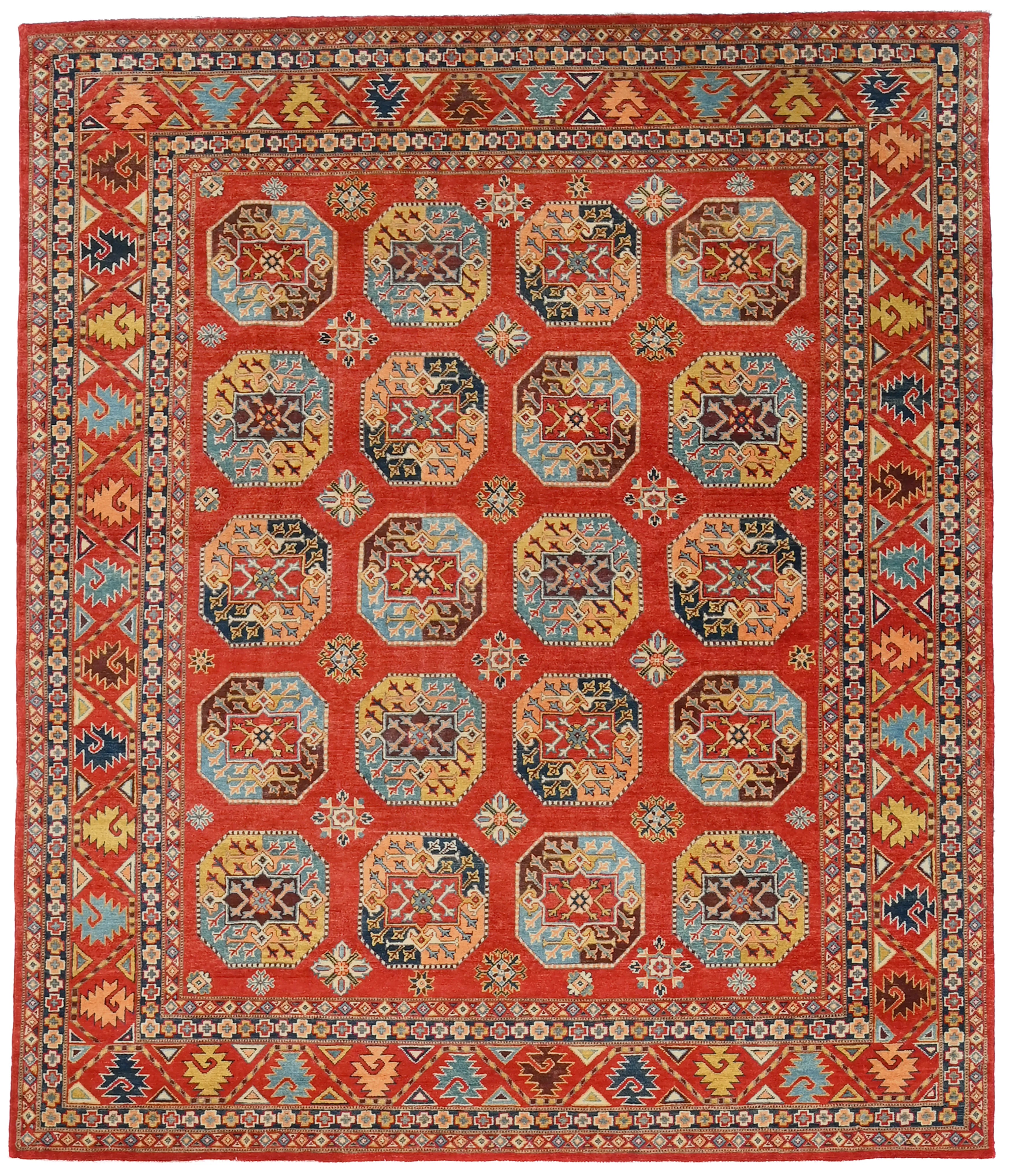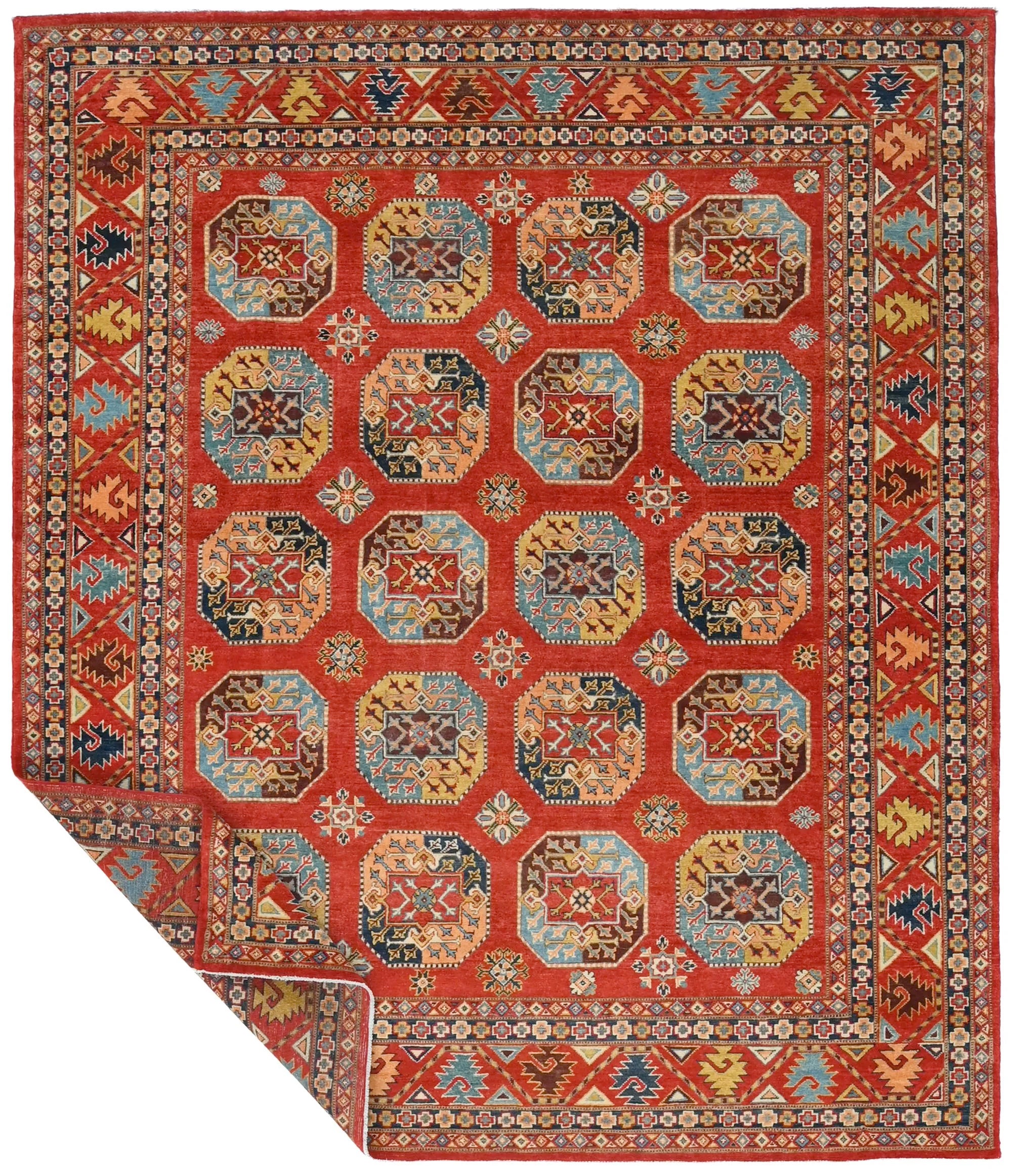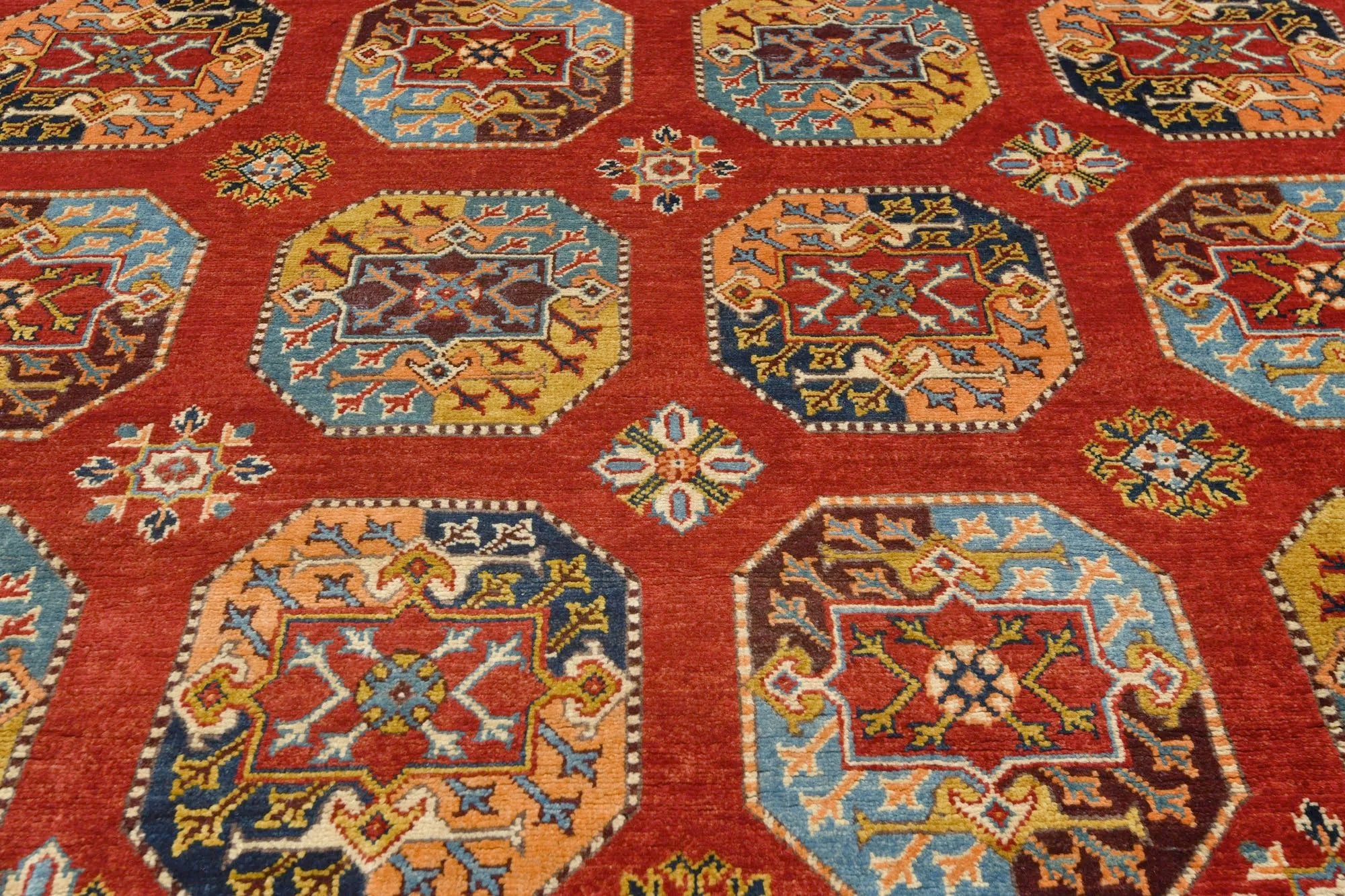 Filpa is an exclusive hand-knotted Afghan rug, inspired by the classic Bokhara design with its iconic elephant foot motifs. This traditional pattern has been reimagined with brighter, more joyful colors, creating a warm and vibrant expression that stands out beautifully in any interior. The rug is made from 100% hand-spun wool and dyed entirely with natural vegetable dyes, giving it a soft texture, rich sheen, and long-lasting durability. With its refined knotting and fresh color palette, Filpa blends timeless oriental tradition with a contemporary artistic touch. If you are searching for a Bokhara-style rug, a distinctive designer rug, or a premium hand-knotted wool rug from Afghanistan, Filpa is an exceptional choice. A rug that brings craftsmanship, culture, and color into perfect harmony.