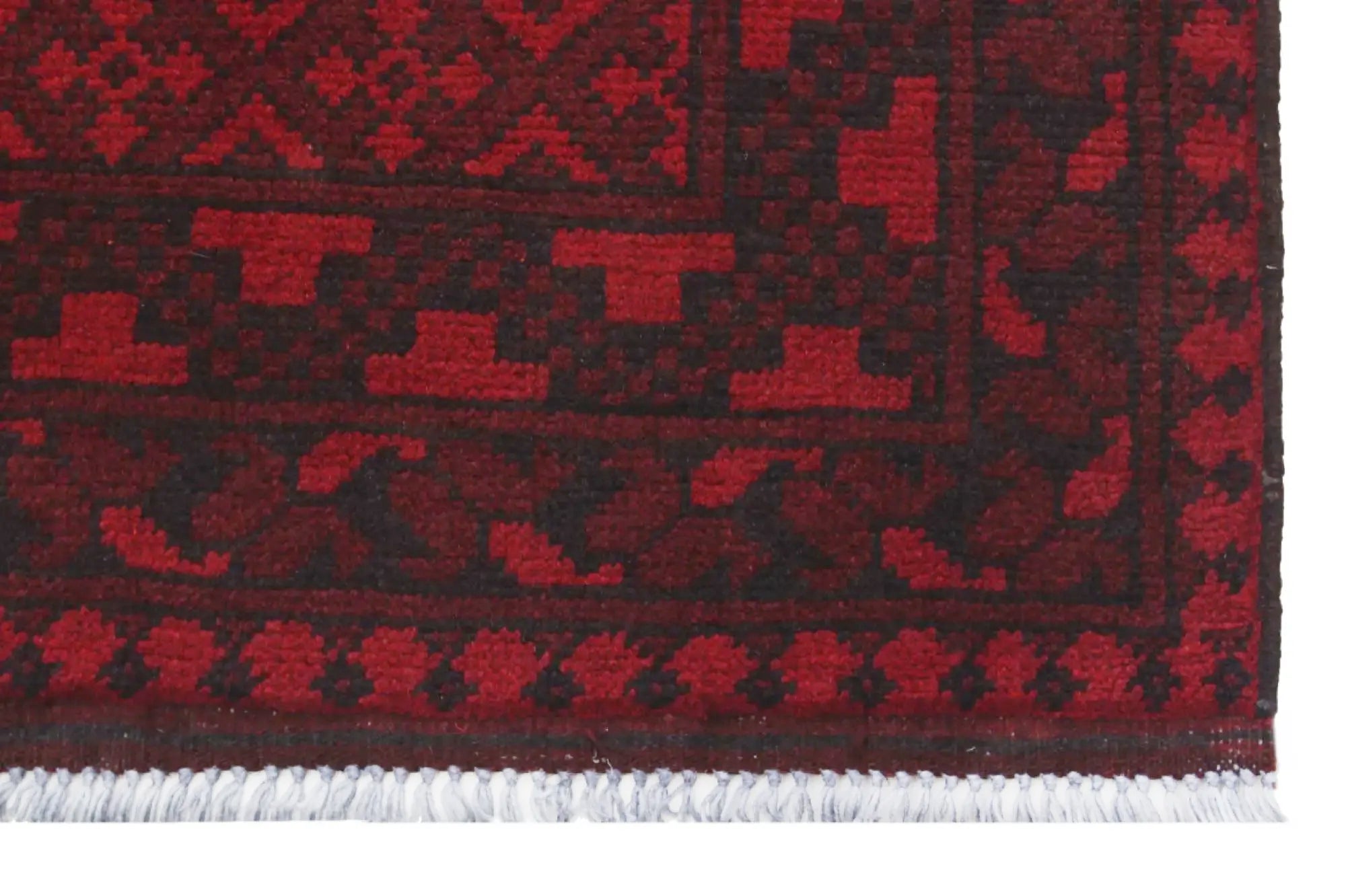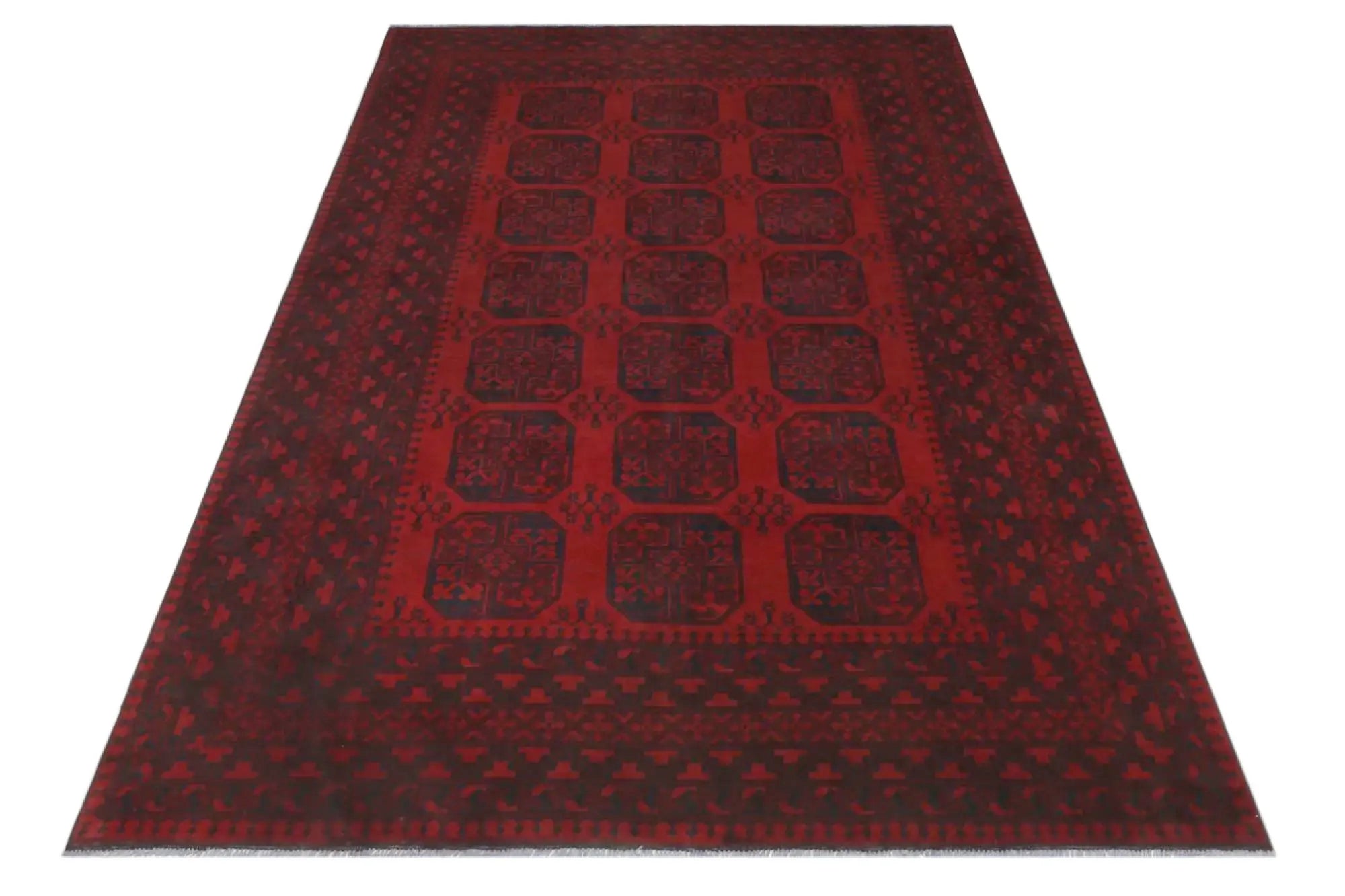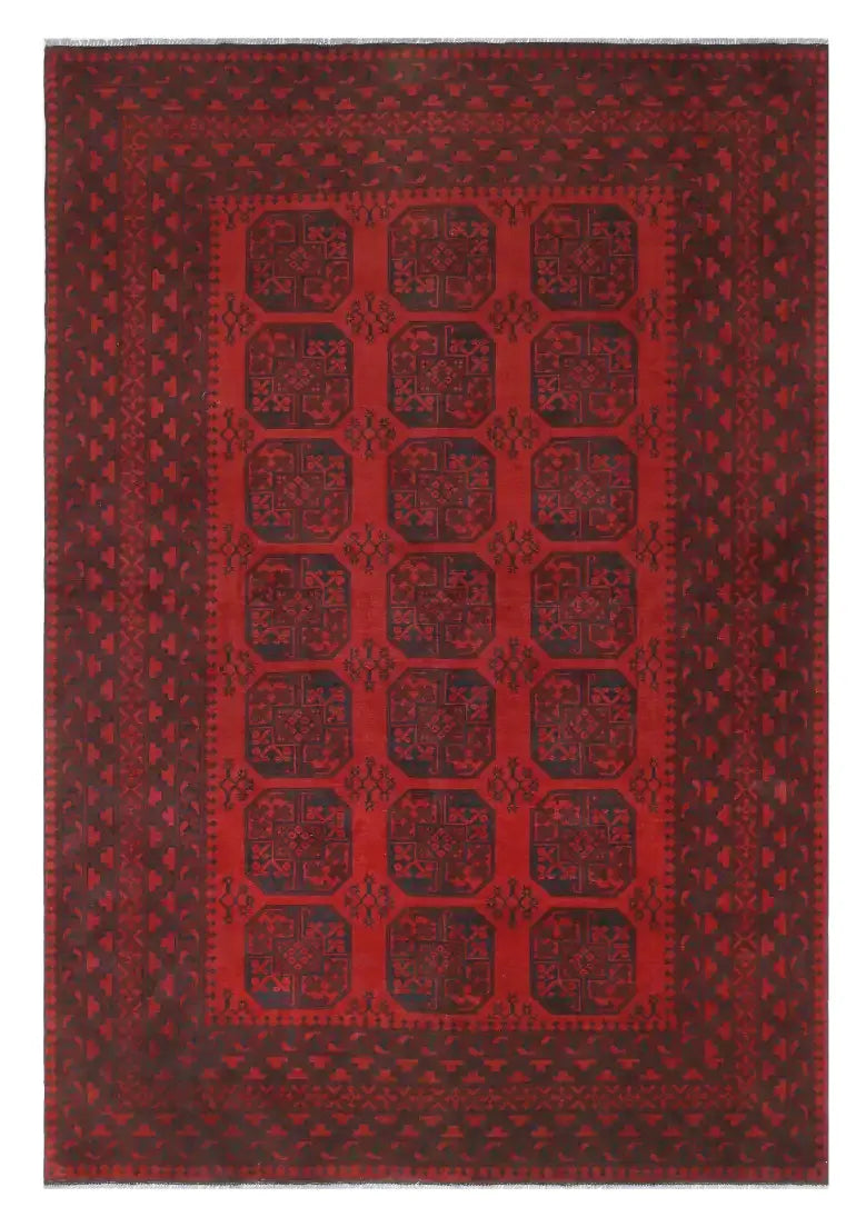 Discover this exquisite hand-knotted Akche rug from Afghanistan, crafted in rich, deep red and black tones that bring warmth and elegance to any interior. Made from 100% pure wool, including the fringes, it contains no synthetic materials, giving it a naturally soft, durable, and authentic feel. The traditional “elephant foot” motif, characteristic of Akche rugs, adds a timeless and culturally rich expression. A perfect choice for anyone seeking a rug that unites craftsmanship, character, and classic oriental beauty.
