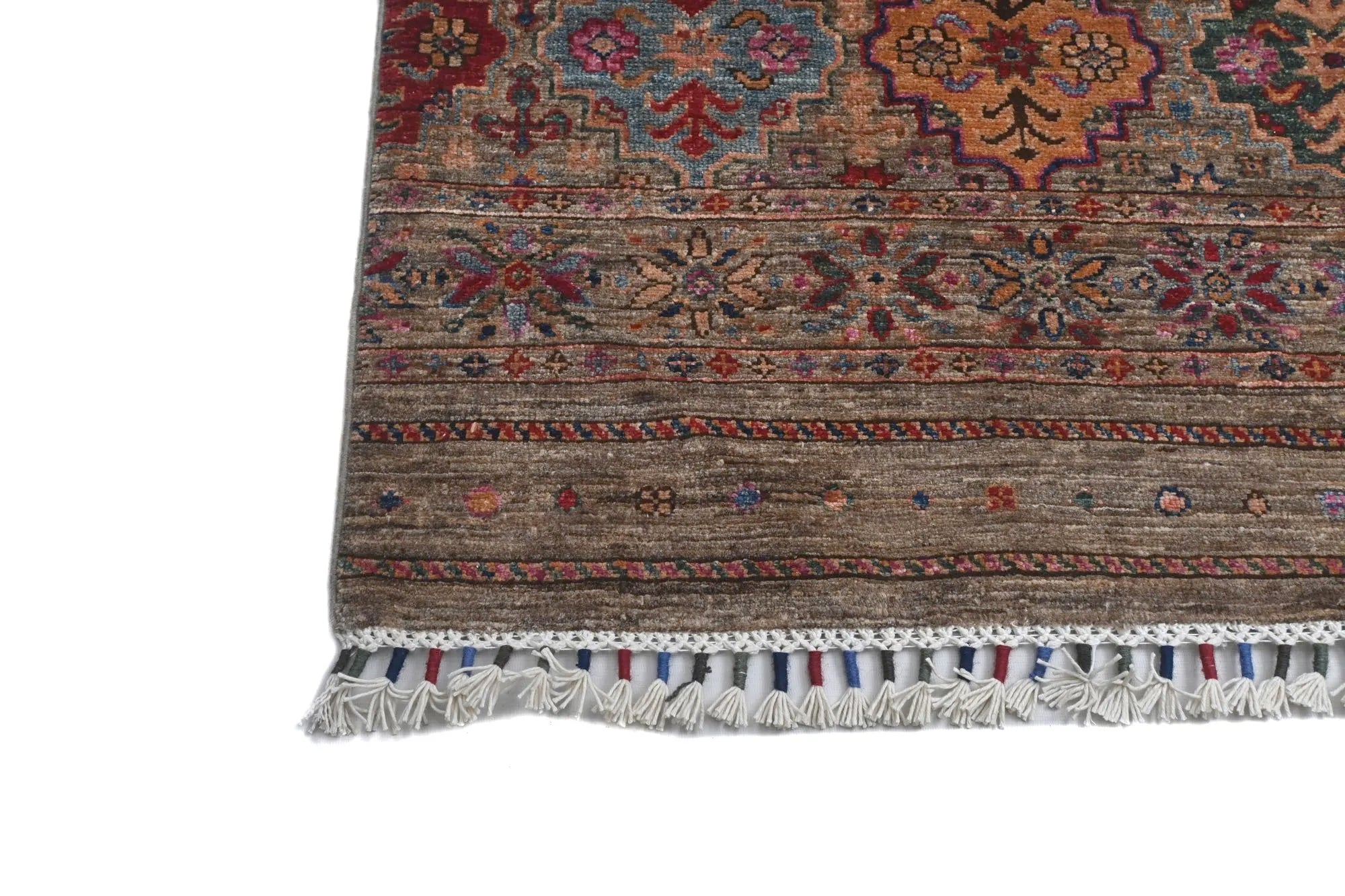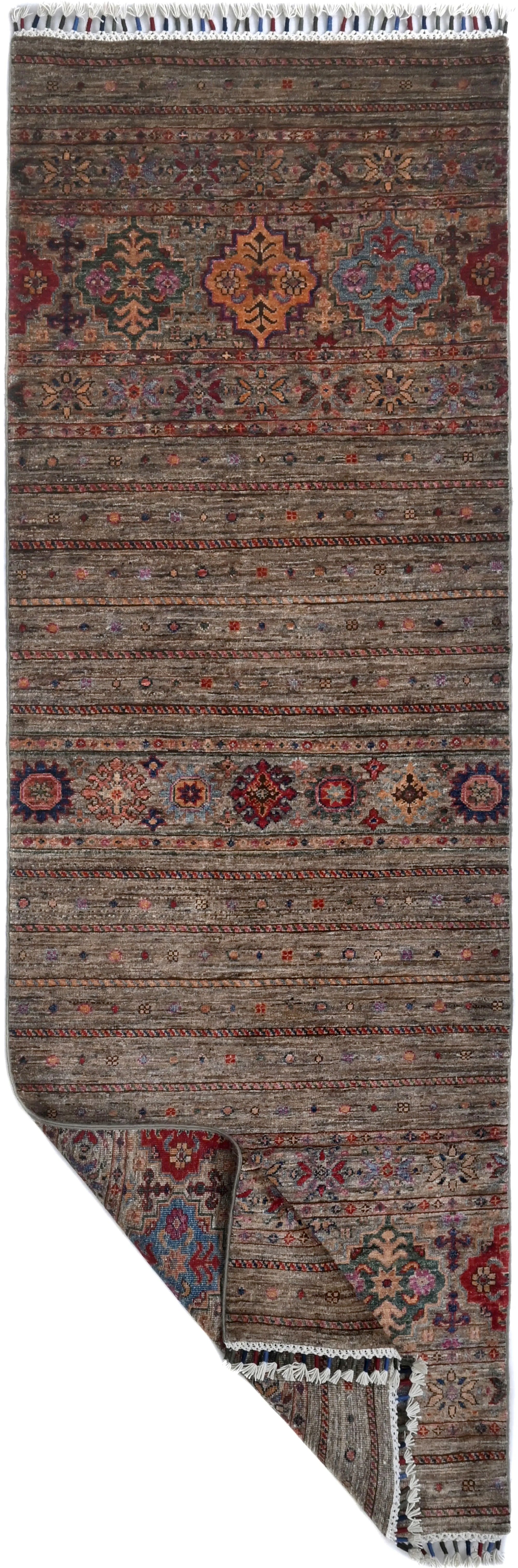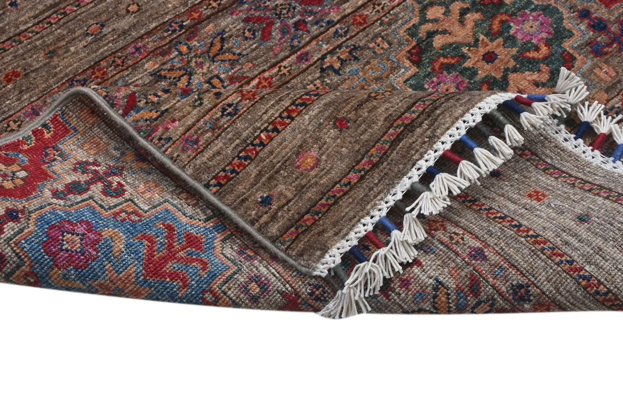 Khorjin rugs from Afghanistan are a type of traditional te x tile often used as bags or saddlebags by nomadic tribes in the region. These rugs are known for their practical uses and beautiful patterns. Originally created to be used as pack bags by nomadic people, Khorjin rugs are often designed with functionality in mind. The patterns on Khorjin rugs are often geometric and colorful, with symbolic motifs representing the tribe's culture and traditions. Common motifs include diamonds, rhombuses, and other geometric shapes, often in a rich color palette. Khorjin rugs are typically woven from wool, which makes them durable and tough enough for nomadic life. The colors in Khorjin rugs are usually natural, produced from plant dyes, giving them a warm and earthy color palette. Typical colors include red, blue, brown, and beige, but there may also be touches of green and yellow. Khorjin rugs are not just practical, but they are also artworks that tell stories about the tribe's life and culture. Each rug is unique and reflects the weaver's skill and creativity. High-quality materials and craftsmanship make Khorjin rugs long-lasting and valuable investments for customers.