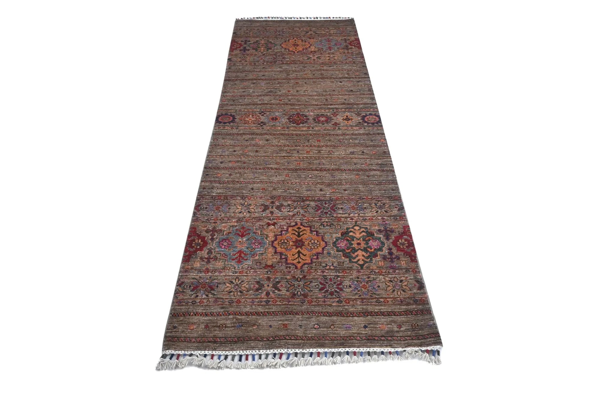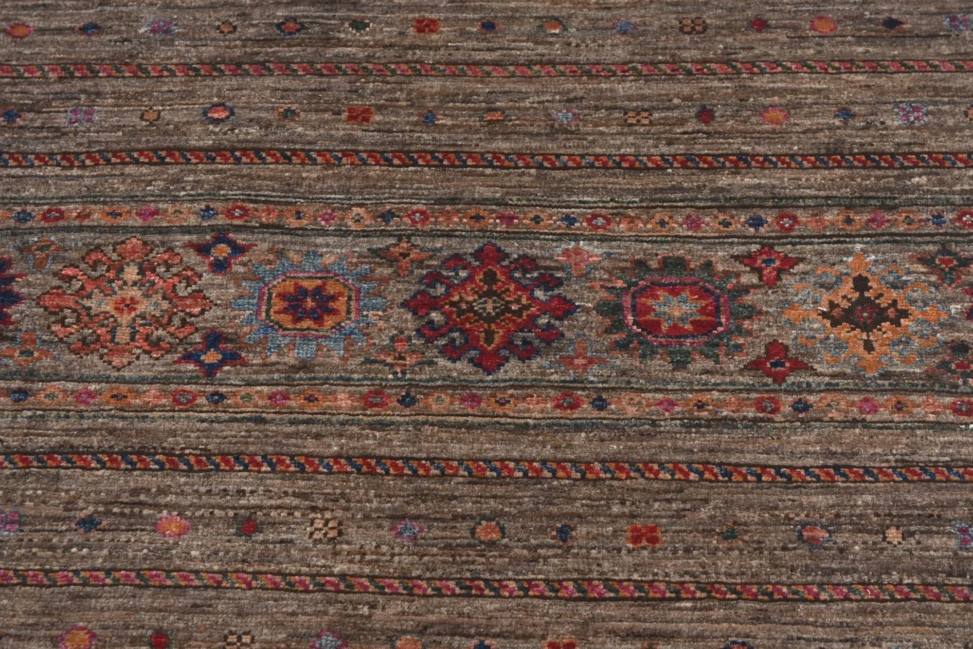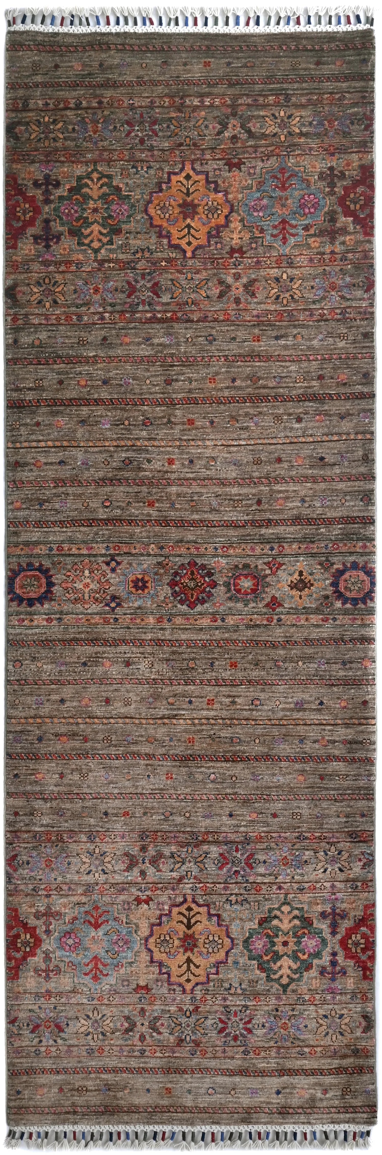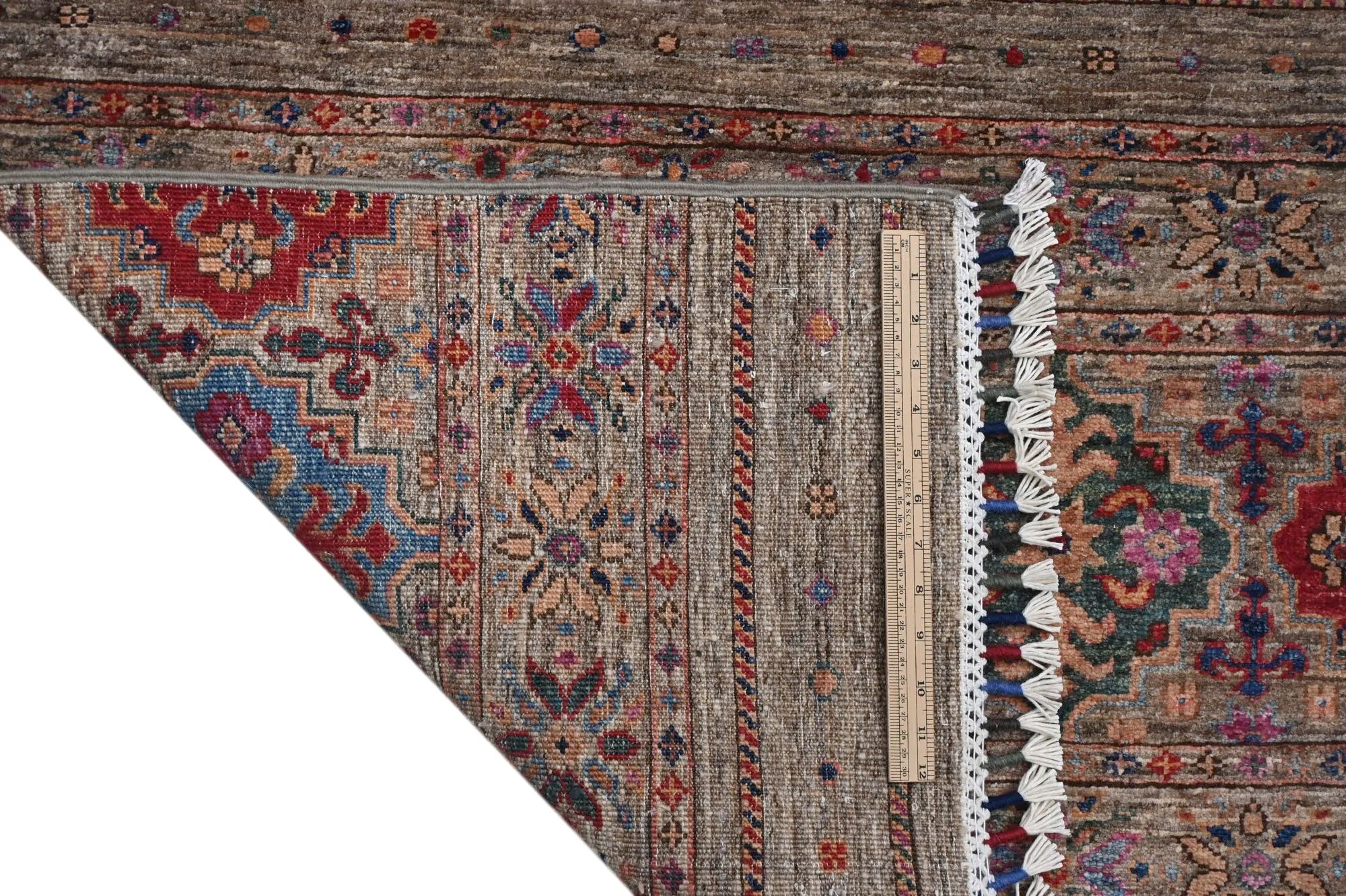 Khorjin rugs from Afghanistan are a type of traditional te x tile often used as bags or saddlebags by nomadic tribes in the region. These rugs are known for their practical uses and beautiful patterns. Originally created to be used as pack bags by nomadic people, Khorjin rugs are often designed with functionality in mind. The patterns on Khorjin rugs are often geometric and colorful, with symbolic motifs representing the tribe's culture and traditions. Common motifs include diamonds, rhombuses, and other geometric shapes, often in a rich color palette. Khorjin rugs are typically woven from wool, which makes them durable and tough enough for nomadic life. The colors in Khorjin rugs are usually natural, produced from plant dyes, giving them a warm and earthy color palette. Typical colors include red, blue, brown, and beige, but there may also be touches of green and yellow. Khorjin rugs are not just practical, but they are also artworks that tell stories about the tribe's life and culture. Each rug is unique and reflects the weaver's skill and creativity. High-quality materials and craftsmanship make Khorjin rugs long-lasting and valuable investments for customers.