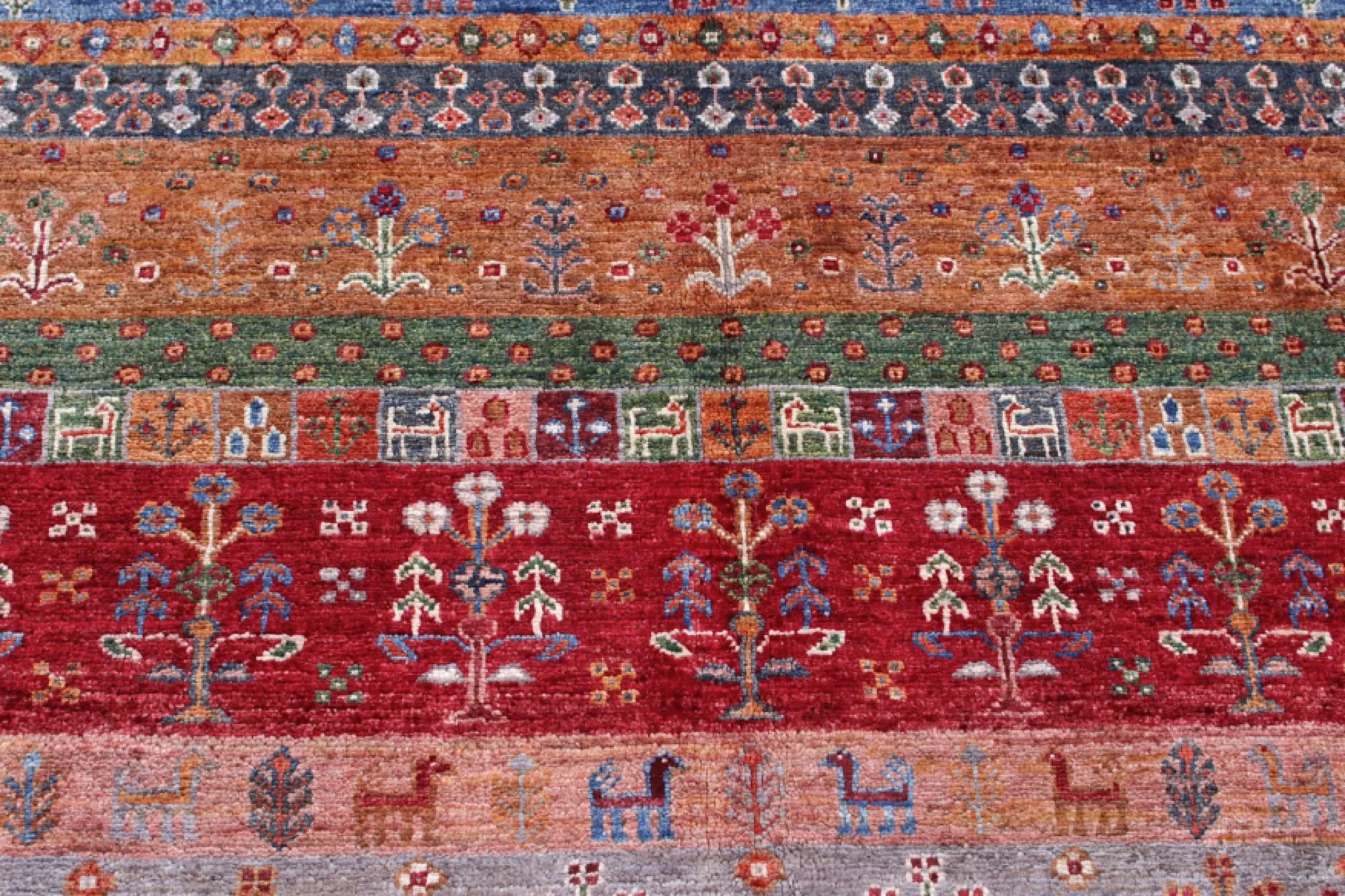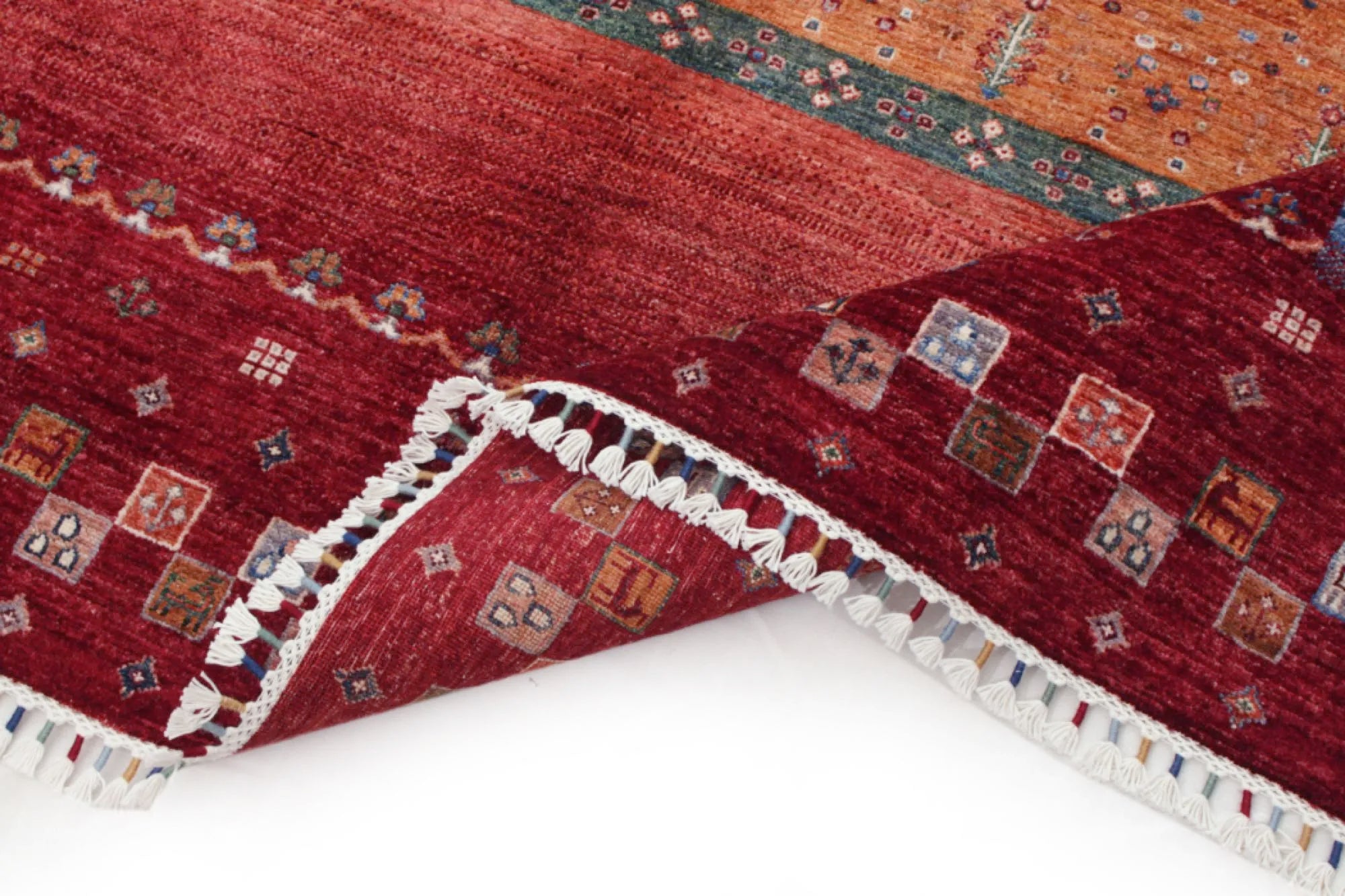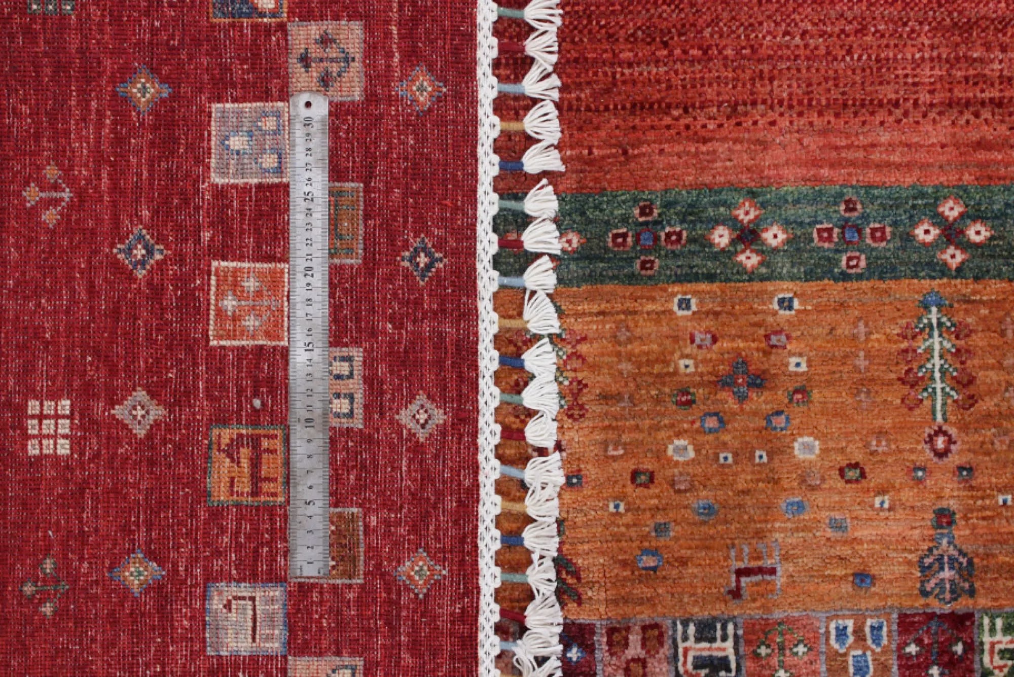 Khorjin rugs from Afghanistan are a type of traditional te x tile often used as bags or saddlebags by nomadic tribes in the region. These rugs are known for their practical uses and beautiful patterns. Originally created to be used as pack bags by nomadic people, Khorjin rugs are often designed with functionality in mind. The patterns on Khorjin rugs are often geometric and colorful, with symbolic motifs representing the tribe's culture and traditions. Common motifs include diamonds, rhombuses, and other geometric shapes, often in a rich color palette. Khorjin rugs are typically woven from wool, which makes them durable and tough enough for nomadic life. The colors in Khorjin rugs are usually natural, produced from plant dyes, giving them a warm and earthy color palette. Typical colors include red, blue, brown, and beige, but there may also be touches of green and yellow. Khorjin rugs are not just practical, but they are also artworks that tell stories about the tribe's life and culture. Each rug is unique and reflects the weaver's skill and creativity. High-quality materials and craftsmanship make Khorjin rugs long-lasting and valuable investments for customers.
