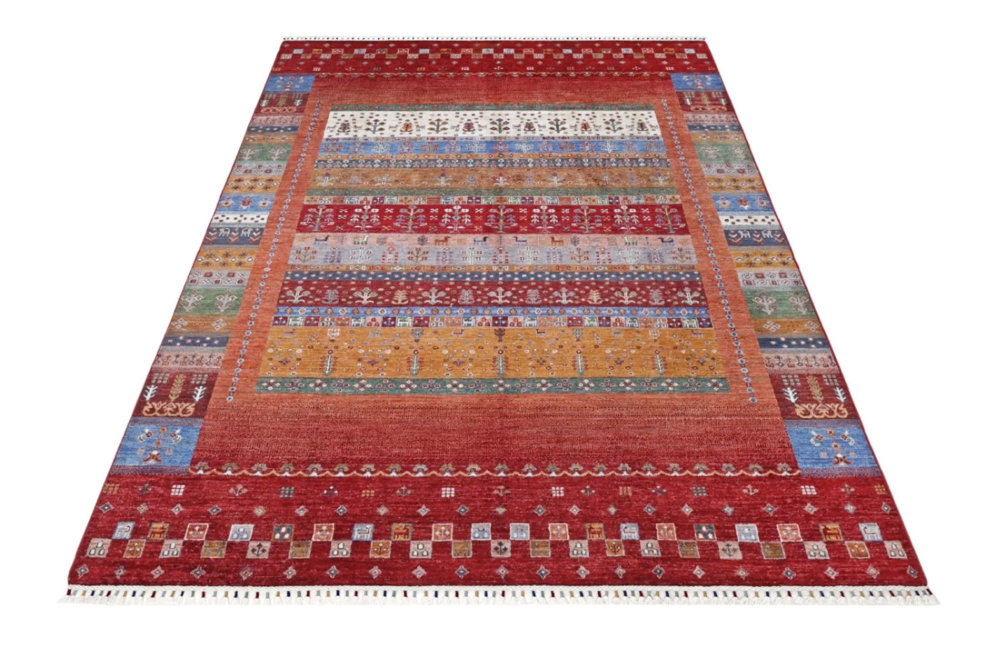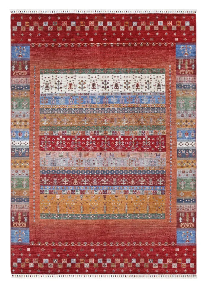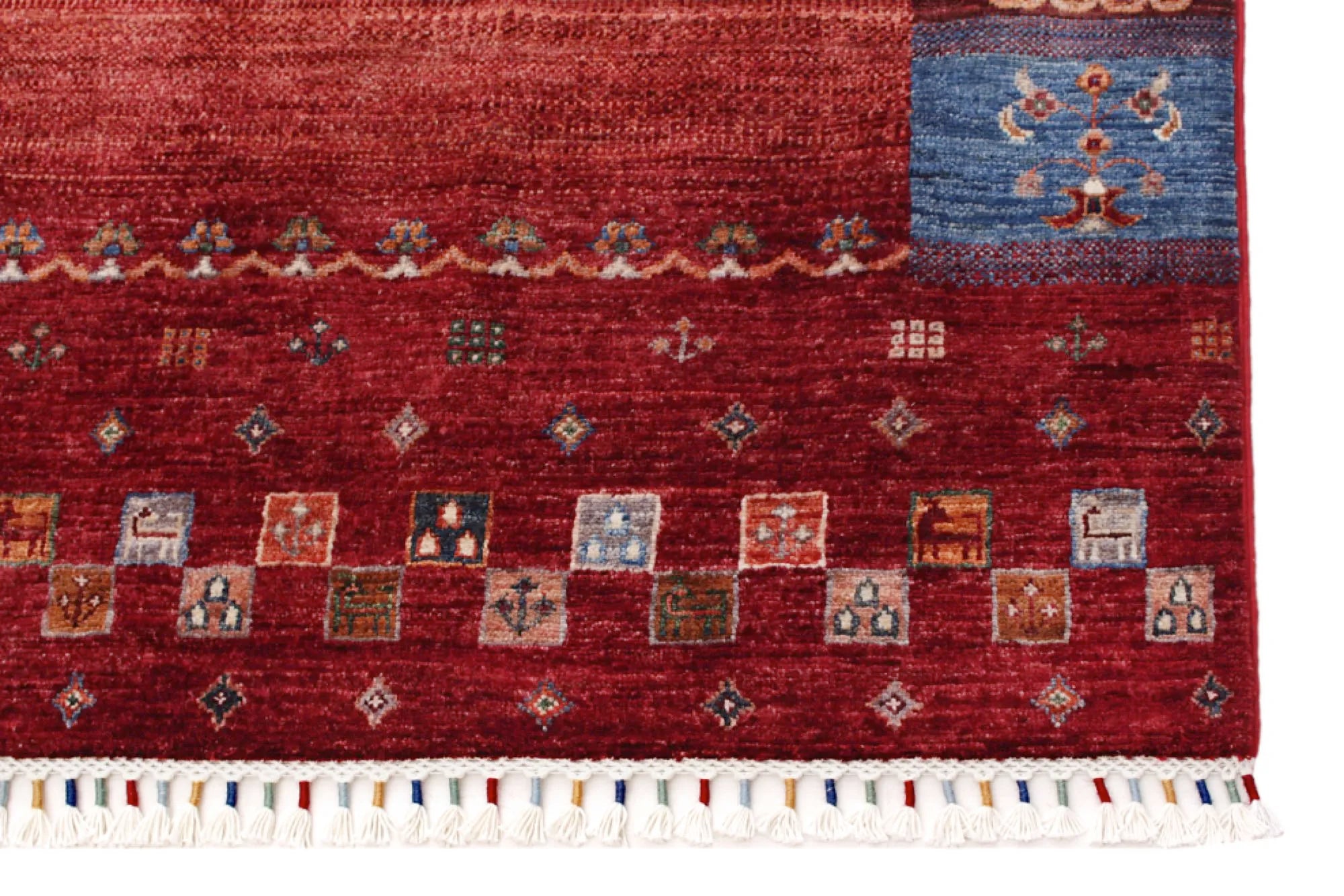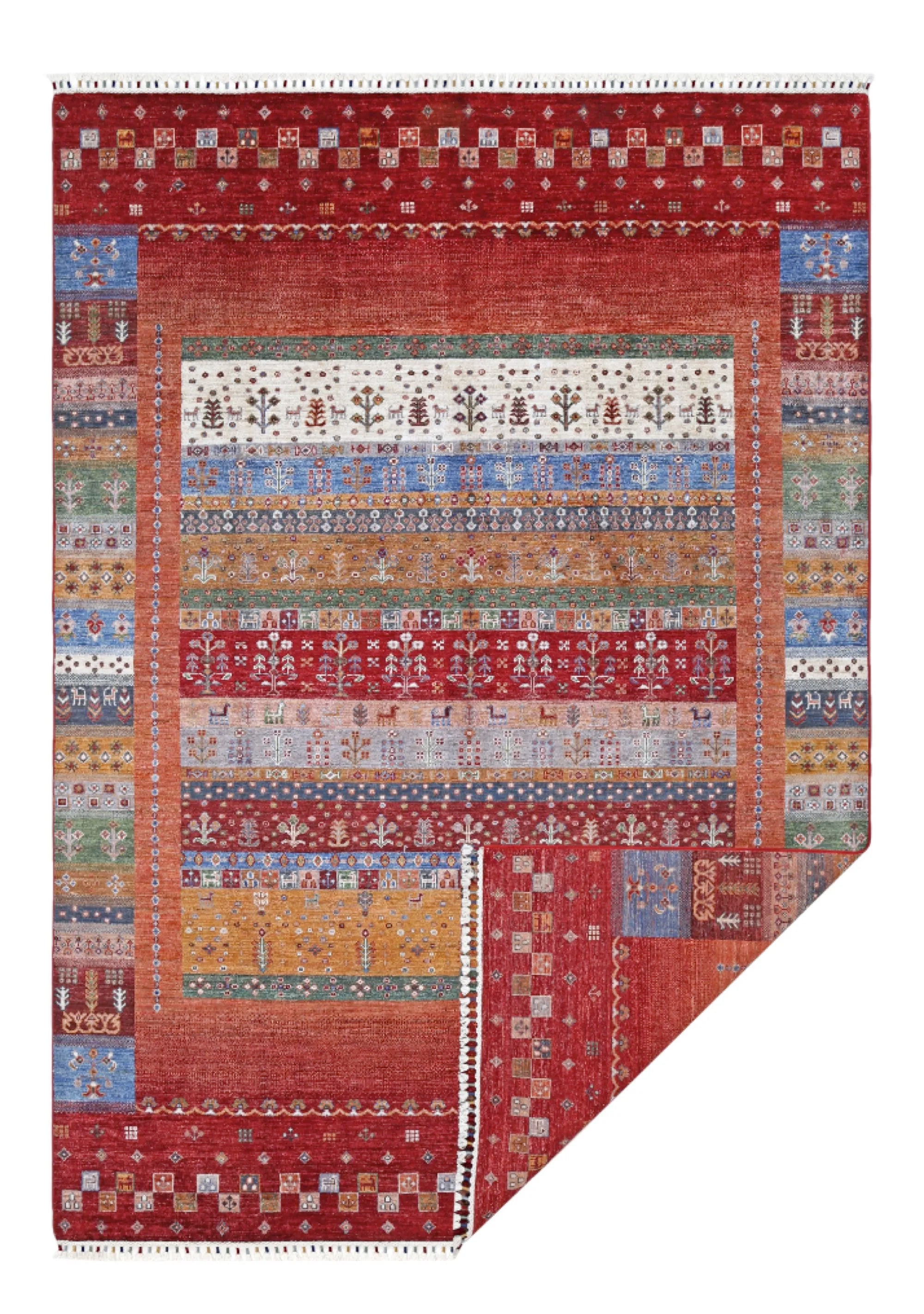 Khorjin rugs from Afghanistan are a type of traditional te x tile often used as bags or saddlebags by nomadic tribes in the region. These rugs are known for their practical uses and beautiful patterns. Originally created to be used as pack bags by nomadic people, Khorjin rugs are often designed with functionality in mind. The patterns on Khorjin rugs are often geometric and colorful, with symbolic motifs representing the tribe's culture and traditions. Common motifs include diamonds, rhombuses, and other geometric shapes, often in a rich color palette. Khorjin rugs are typically woven from wool, which makes them durable and tough enough for nomadic life. The colors in Khorjin rugs are usually natural, produced from plant dyes, giving them a warm and earthy color palette. Typical colors include red, blue, brown, and beige, but there may also be touches of green and yellow. Khorjin rugs are not just practical, but they are also artworks that tell stories about the tribe's life and culture. Each rug is unique and reflects the weaver's skill and creativity. High-quality materials and craftsmanship make Khorjin rugs long-lasting and valuable investments for customers.