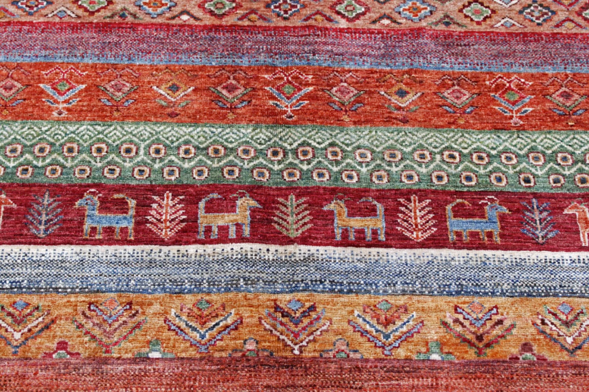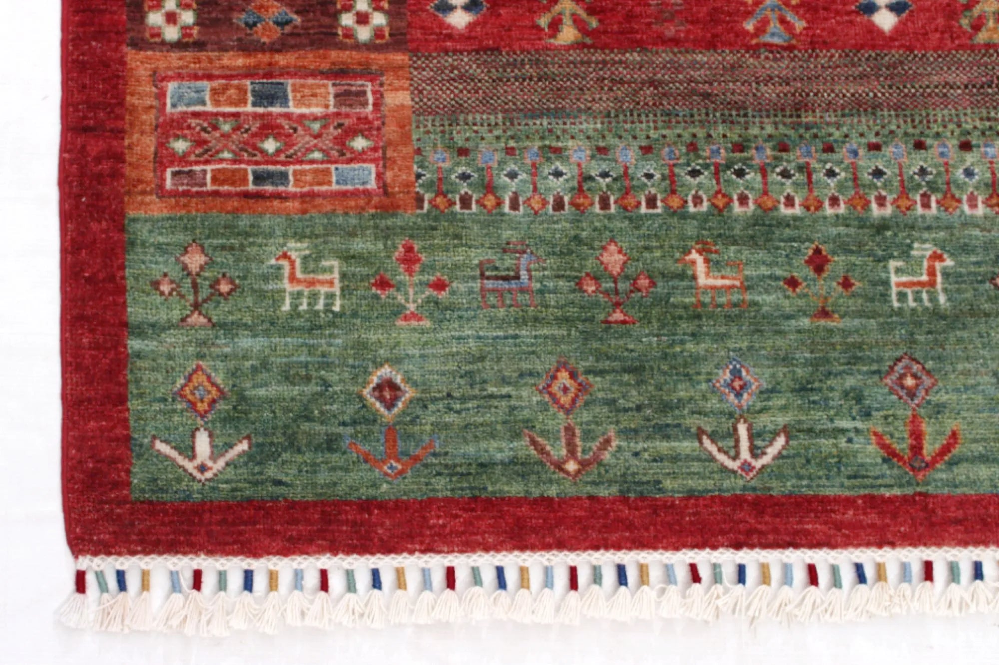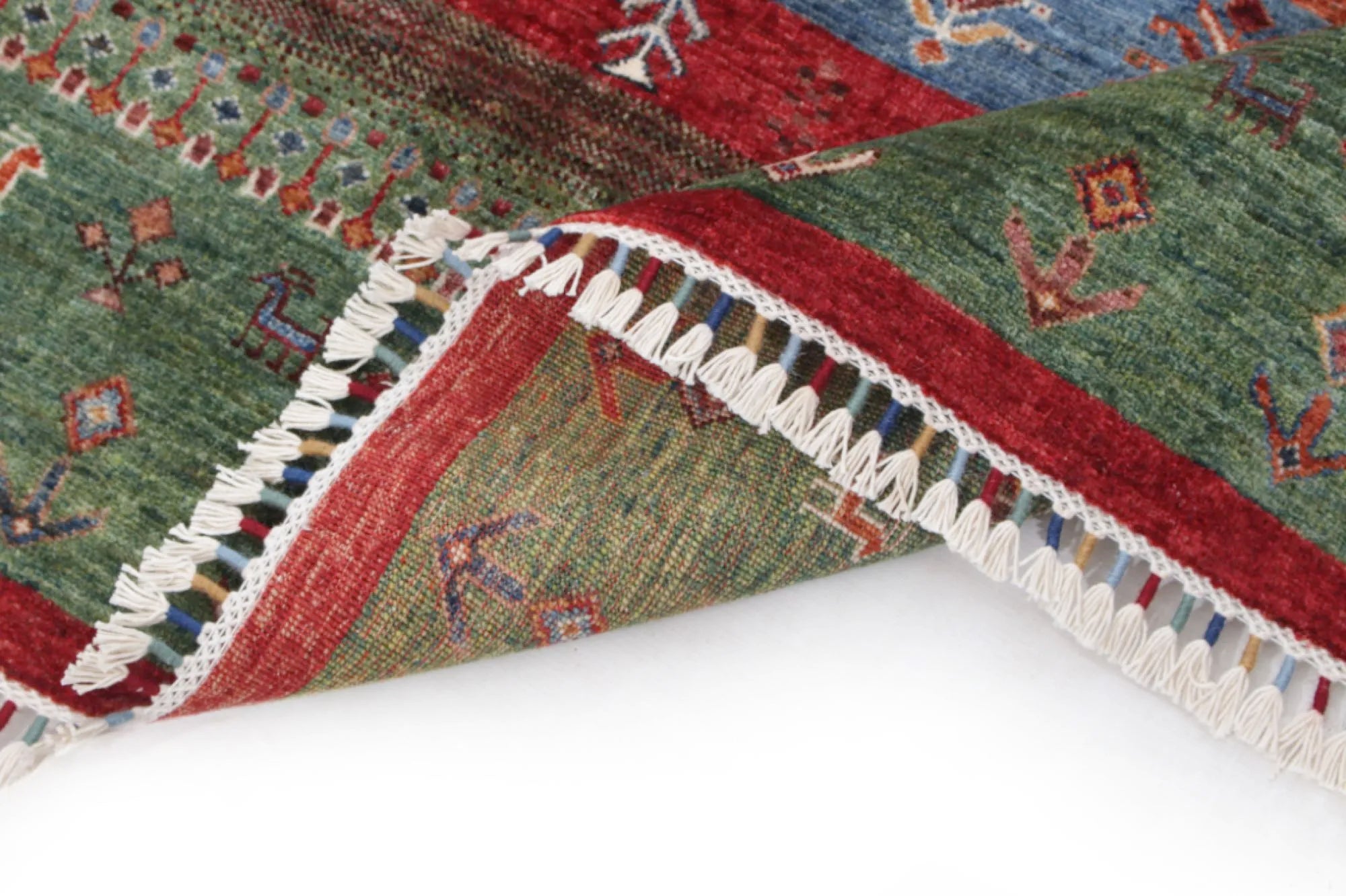 Khorjin rugs from Afghanistan are a type of traditional te x tile often used as bags or saddlebags by nomadic tribes in the region. These rugs are known for their practical uses and beautiful patterns. Originally created to be used as pack bags by nomadic people, Khorjin rugs are often designed with functionality in mind. The patterns on Khorjin rugs are often geometric and colorful, with symbolic motifs representing the tribe's culture and traditions. Common motifs include diamonds, rhombuses, and other geometric shapes, often in a rich color palette. Khorjin rugs are typically woven from wool, which makes them durable and tough enough for nomadic life. The colors in Khorjin rugs are usually natural, produced from plant dyes, giving them a warm and earthy color palette. Typical colors include red, blue, brown, and beige, but there may also be touches of green and yellow. Khorjin rugs are not just practical, but they are also artworks that tell stories about the tribe's life and culture. Each rug is unique and reflects the weaver's skill and creativity. High-quality materials and craftsmanship make Khorjin rugs long-lasting and valuable investments for customers.