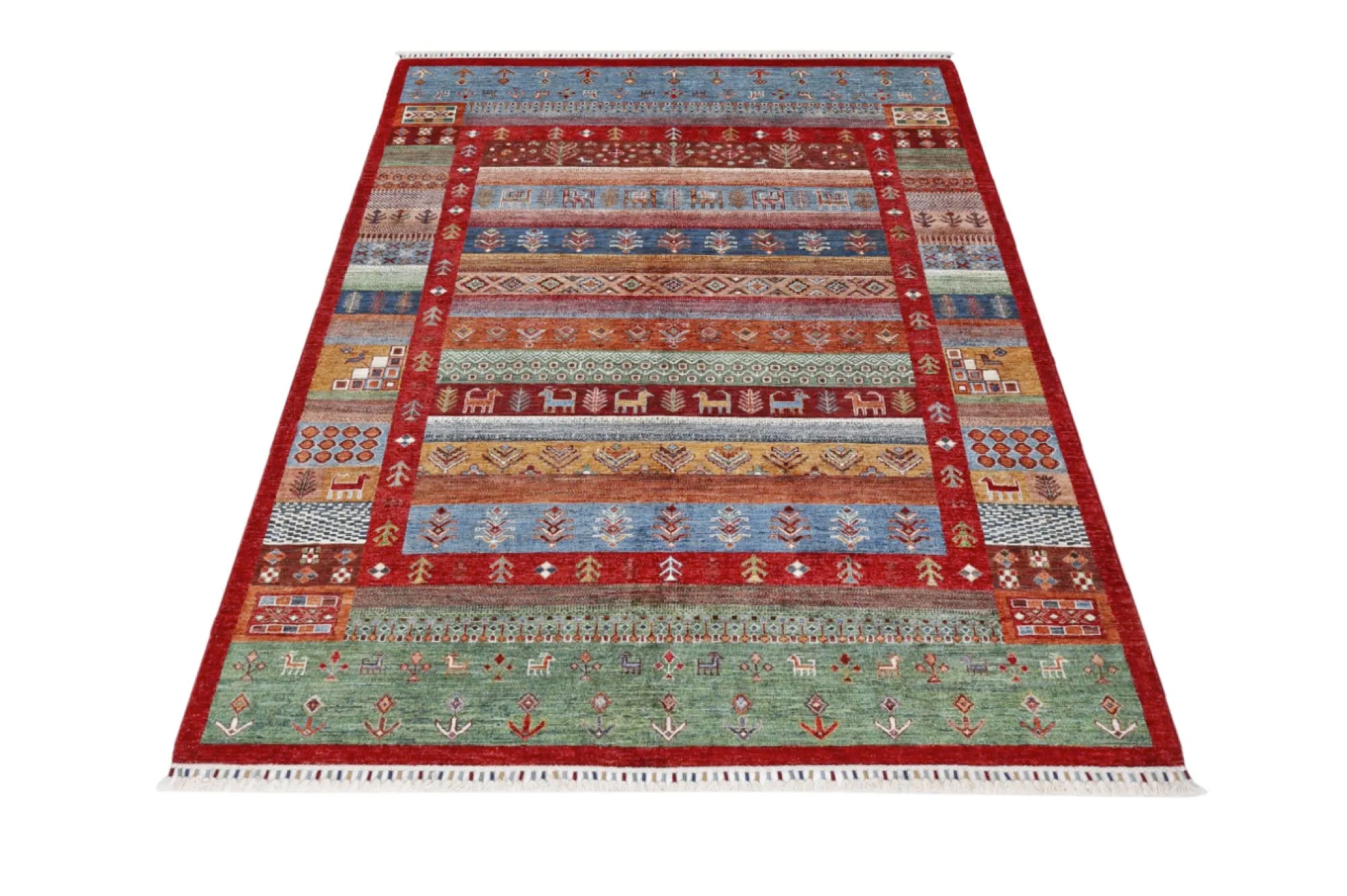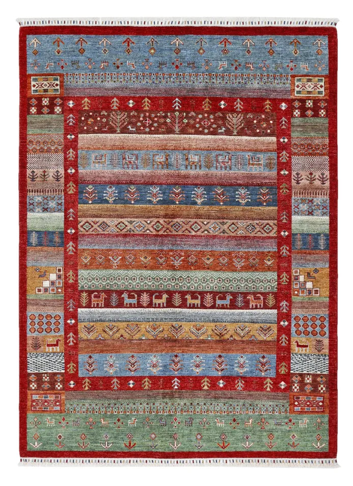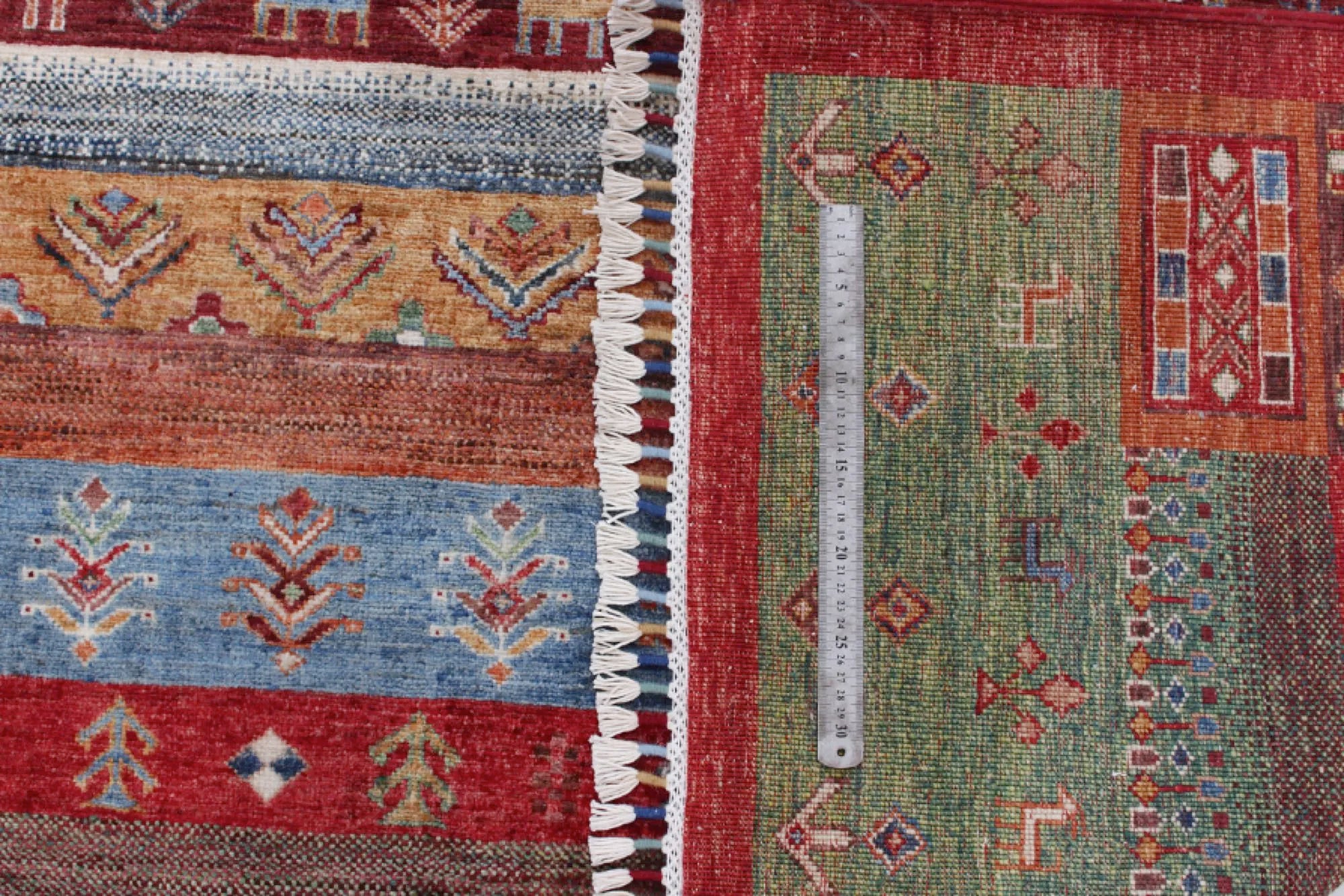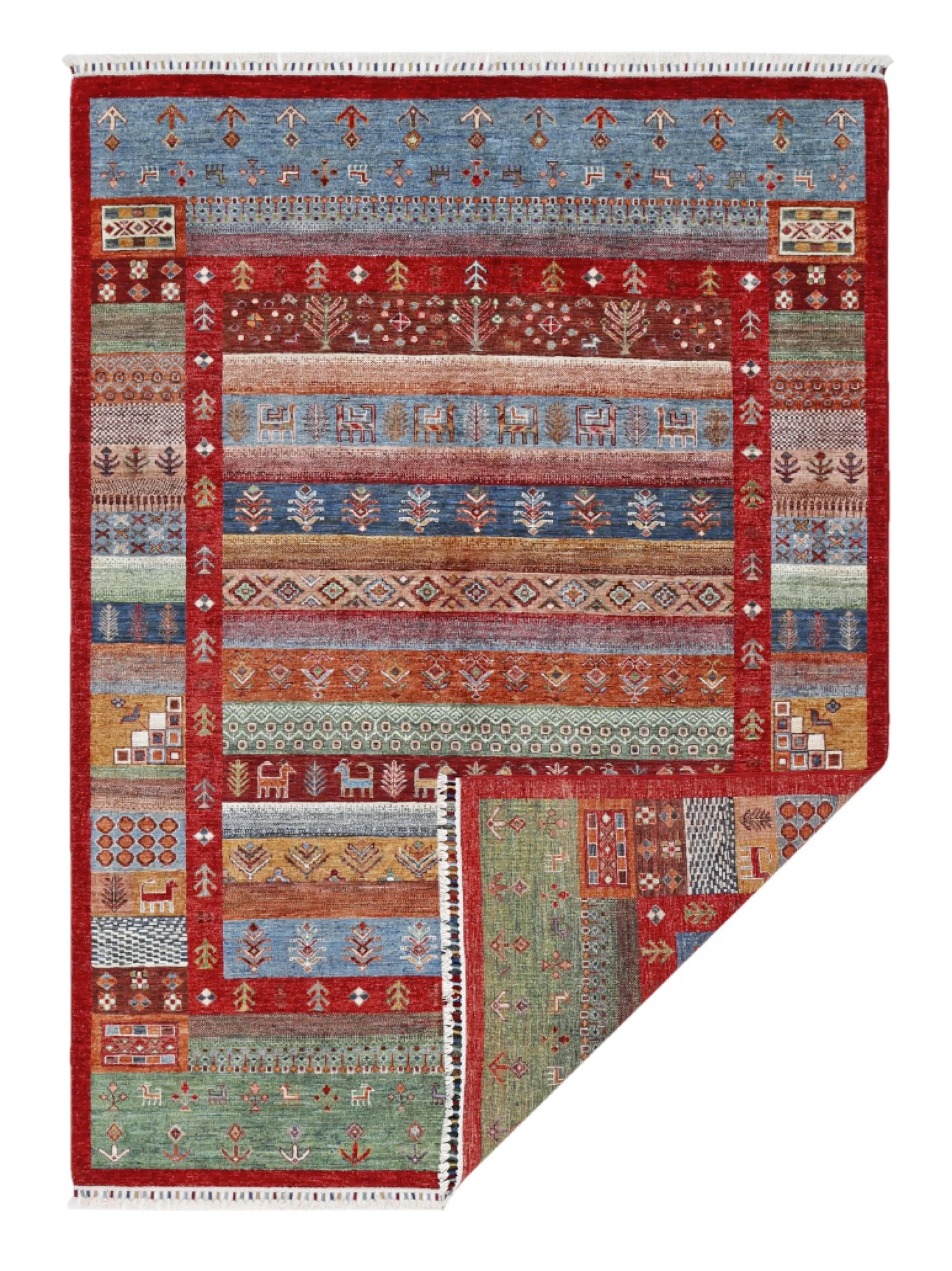Khorjin rugs from Afghanistan are a type of traditional te x tile often used as bags or saddlebags by nomadic tribes in the region. These rugs are known for their practical uses and beautiful patterns. Originally created to be used as pack bags by nomadic people, Khorjin rugs are often designed with functionality in mind. The patterns on Khorjin rugs are often geometric and colorful, with symbolic motifs representing the tribe's culture and traditions. Common motifs include diamonds, rhombuses, and other geometric shapes, often in a rich color palette. Khorjin rugs are typically woven from wool, which makes them durable and tough enough for nomadic life. The colors in Khorjin rugs are usually natural, produced from plant dyes, giving them a warm and earthy color palette. Typical colors include red, blue, brown, and beige, but there may also be touches of green and yellow. Khorjin rugs are not just practical, but they are also artworks that tell stories about the tribe's life and culture. Each rug is unique and reflects the weaver's skill and creativity. High-quality materials and craftsmanship make Khorjin rugs long-lasting and valuable investments for customers.
