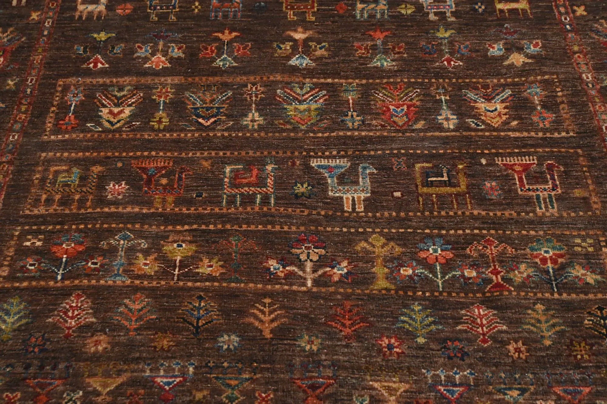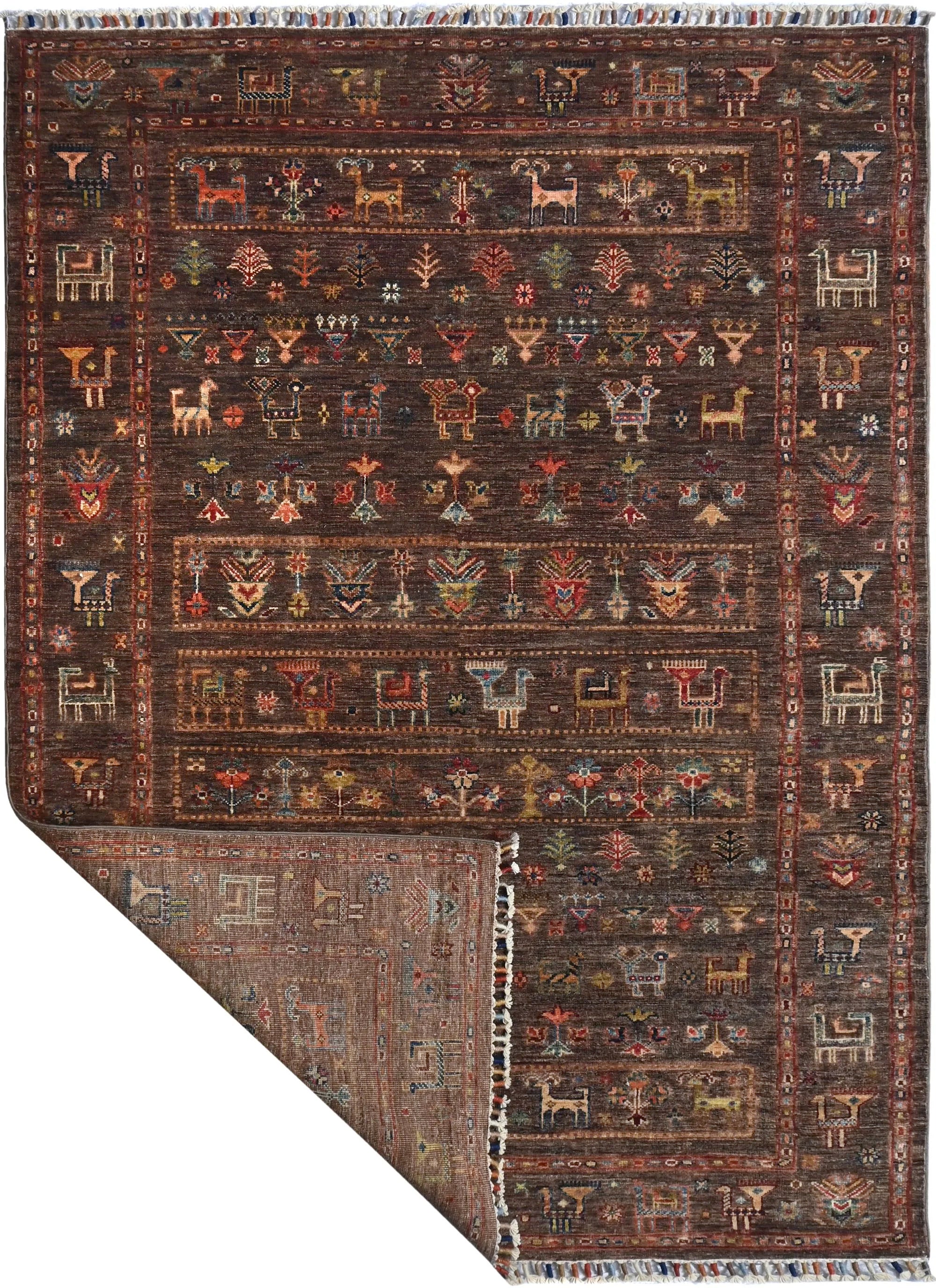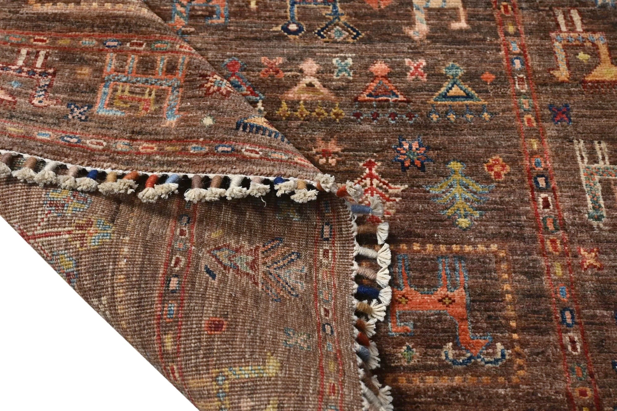 Khorjin rugs from Afghanistan are a type of traditional te x tile often used as bags or saddlebags by nomadic tribes in the region. These rugs are known for their practical uses and beautiful patterns. Originally created to be used as pack bags by nomadic people, Khorjin rugs are often designed with functionality in mind. The patterns on Khorjin rugs are often geometric and colorful, with symbolic motifs representing the tribe's culture and traditions. Common motifs include diamonds, rhombuses, and other geometric shapes, often in a rich color palette. Khorjin rugs are typically woven from wool, which makes them durable and tough enough for nomadic life. The colors in Khorjin rugs are usually natural, produced from plant dyes, giving them a warm and earthy color palette. Typical colors include red, blue, brown, and beige, but there may also be touches of green and yellow. Khorjin rugs are not just practical, but they are also artworks that tell stories about the tribe's life and culture. Each rug is unique and reflects the weaver's skill and creativity. High-quality materials and craftsmanship make Khorjin rugs long-lasting and valuable investments for customers.