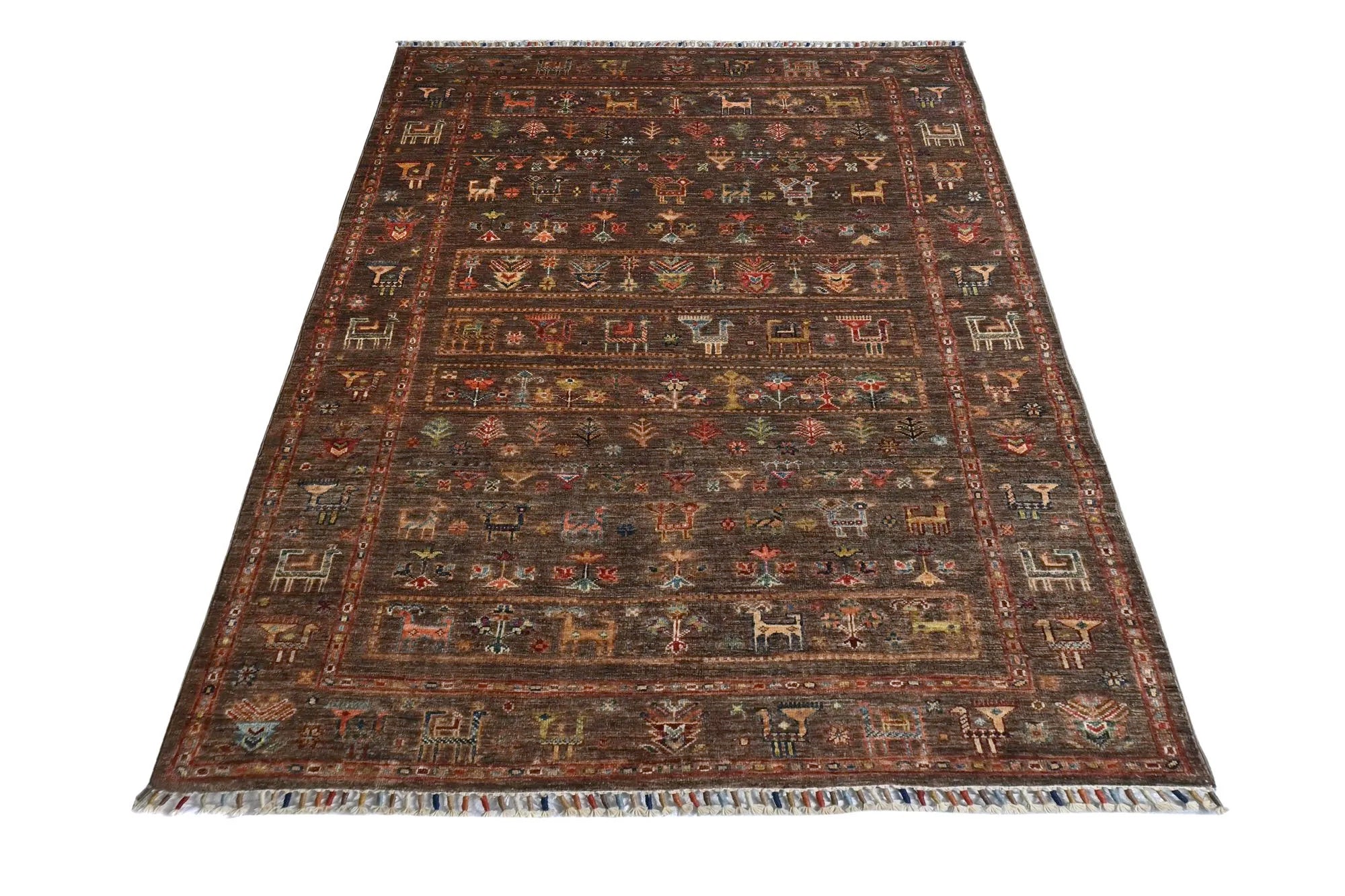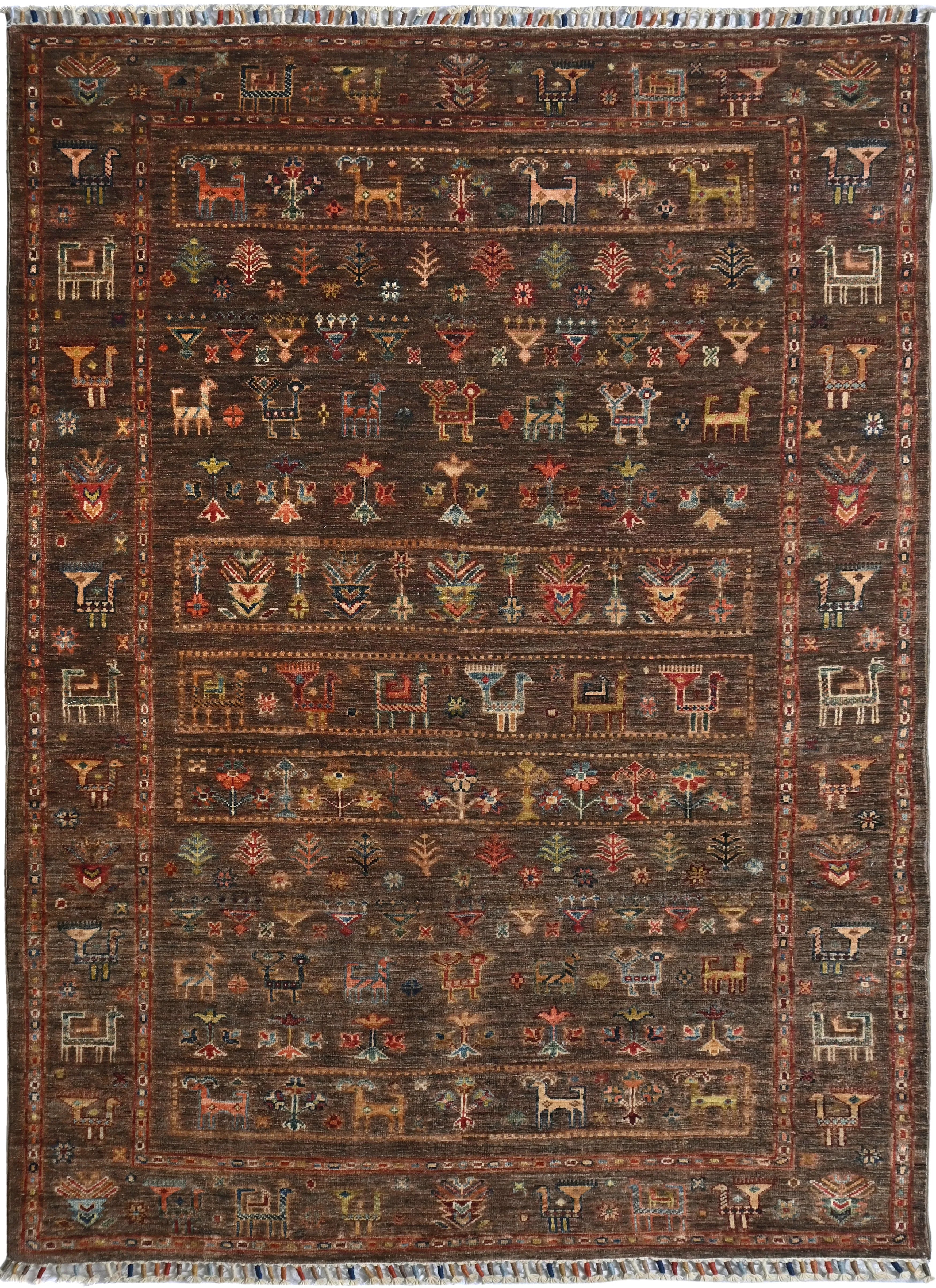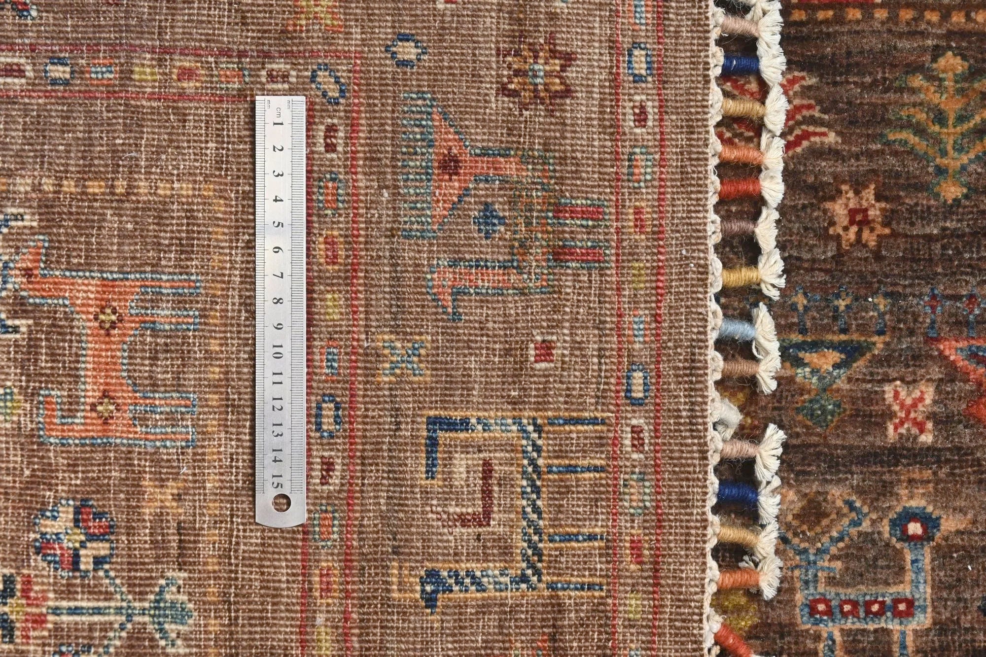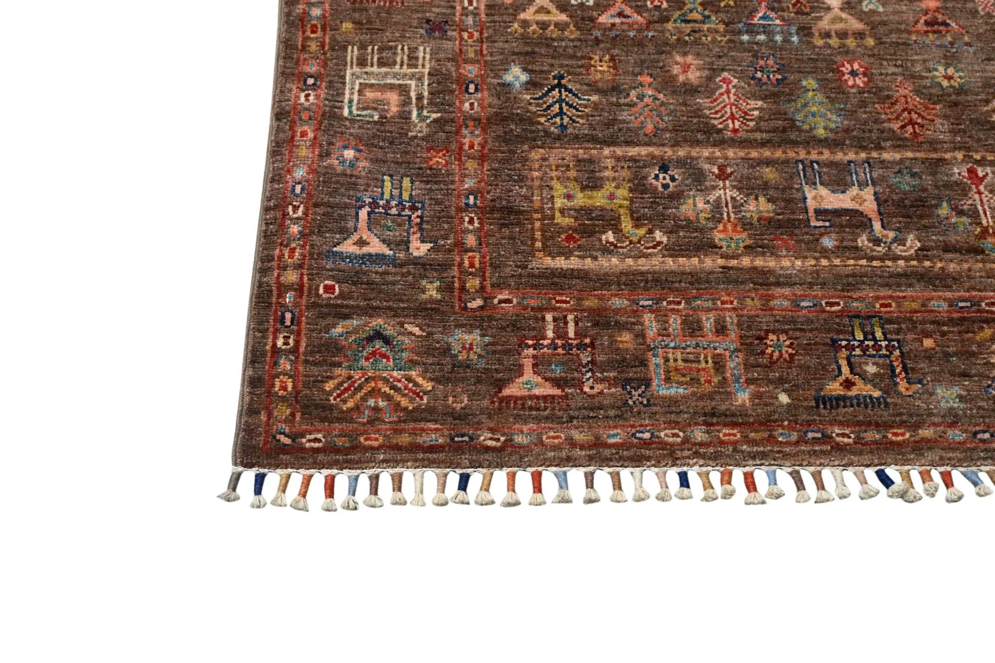 Khorjin rugs from Afghanistan are a type of traditional te x tile often used as bags or saddlebags by nomadic tribes in the region. These rugs are known for their practical uses and beautiful patterns. Originally created to be used as pack bags by nomadic people, Khorjin rugs are often designed with functionality in mind. The patterns on Khorjin rugs are often geometric and colorful, with symbolic motifs representing the tribe's culture and traditions. Common motifs include diamonds, rhombuses, and other geometric shapes, often in a rich color palette. Khorjin rugs are typically woven from wool, which makes them durable and tough enough for nomadic life. The colors in Khorjin rugs are usually natural, produced from plant dyes, giving them a warm and earthy color palette. Typical colors include red, blue, brown, and beige, but there may also be touches of green and yellow. Khorjin rugs are not just practical, but they are also artworks that tell stories about the tribe's life and culture. Each rug is unique and reflects the weaver's skill and creativity. High-quality materials and craftsmanship make Khorjin rugs long-lasting and valuable investments for customers.