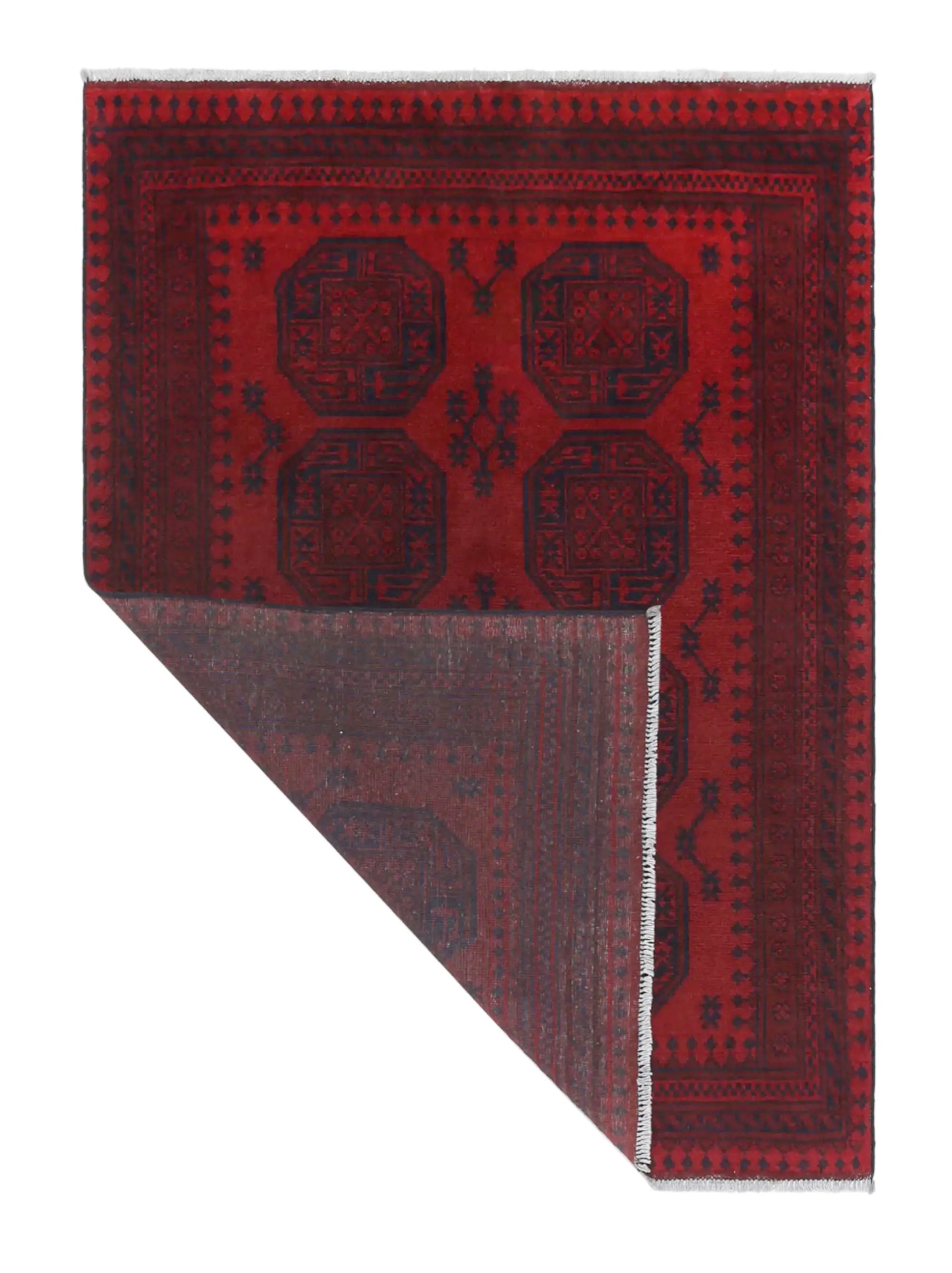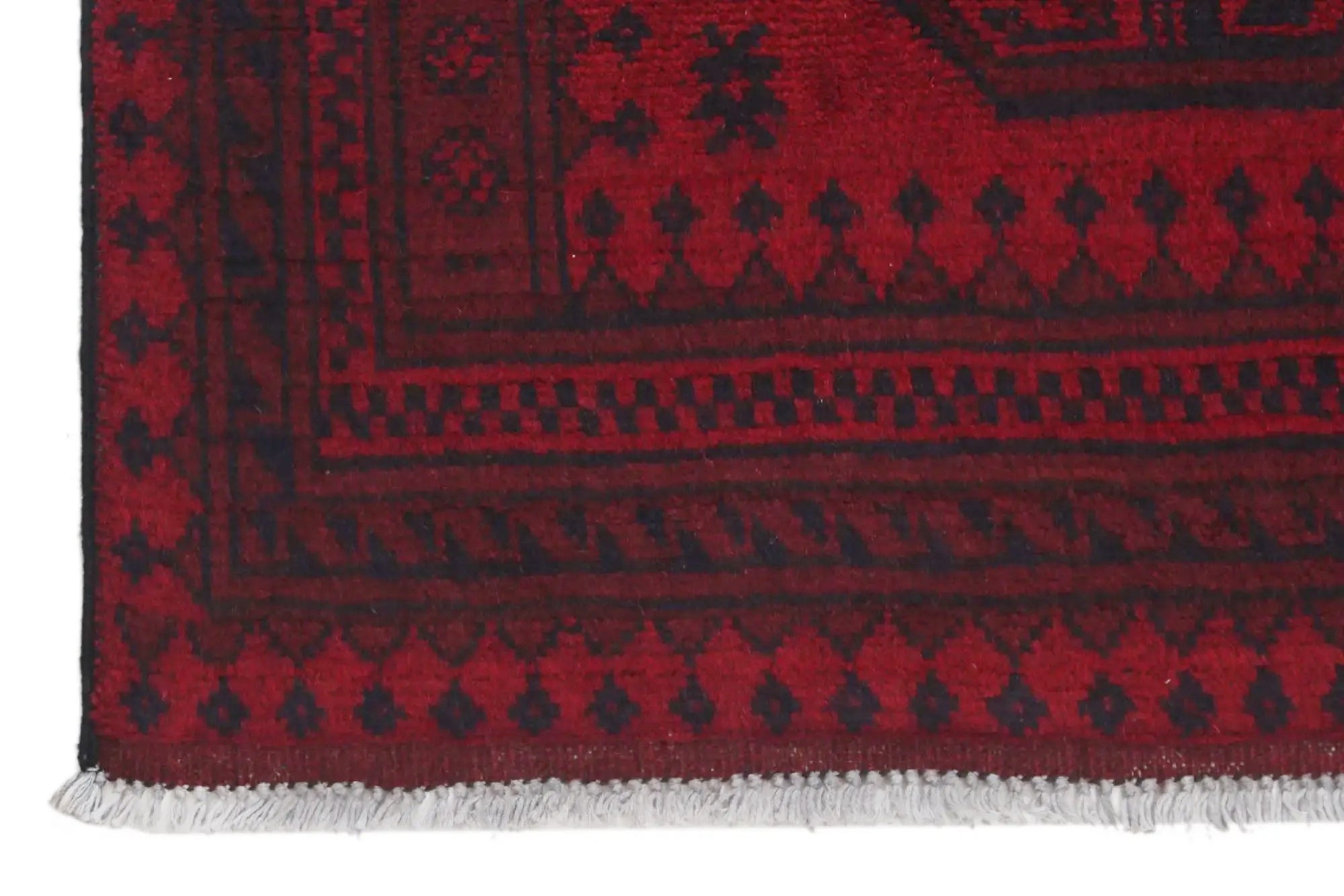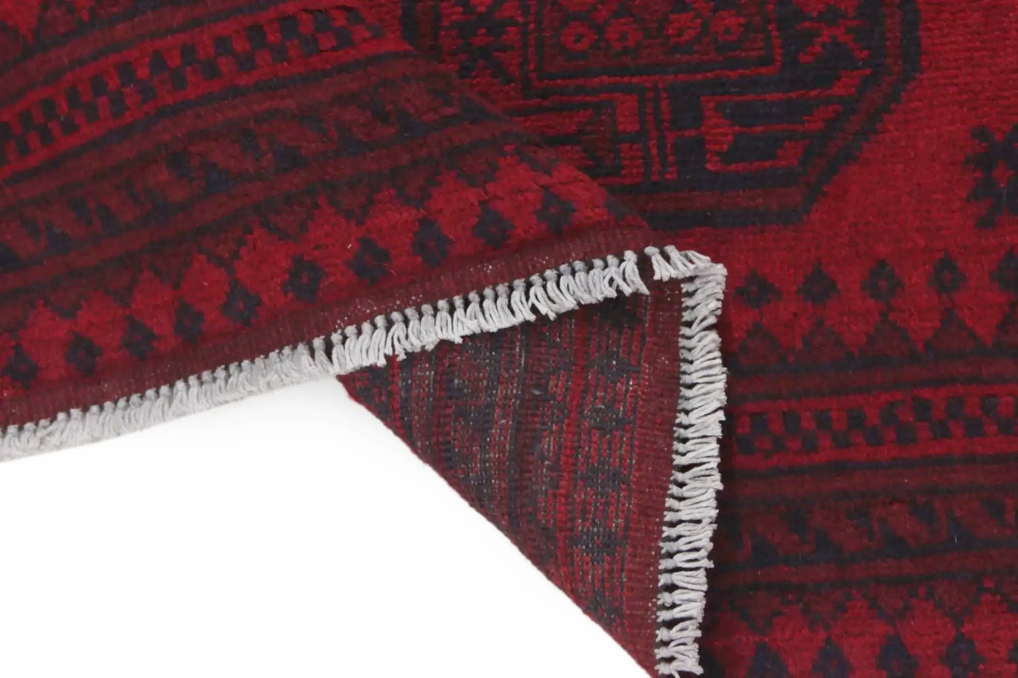 Discover this exquisite hand-knotted Akche rug from Afghanistan, crafted in rich, deep red and black tones that bring warmth and elegance to any interior. Made from 100% pure wool, including the fringes, it contains no synthetic materials, giving it a naturally soft, durable, and authentic feel. The traditional “elephant foot” motif, characteristic of Akche rugs, adds a timeless and culturally rich expression. A perfect choice for anyone seeking a rug that unites craftsmanship, character, and classic oriental beauty.