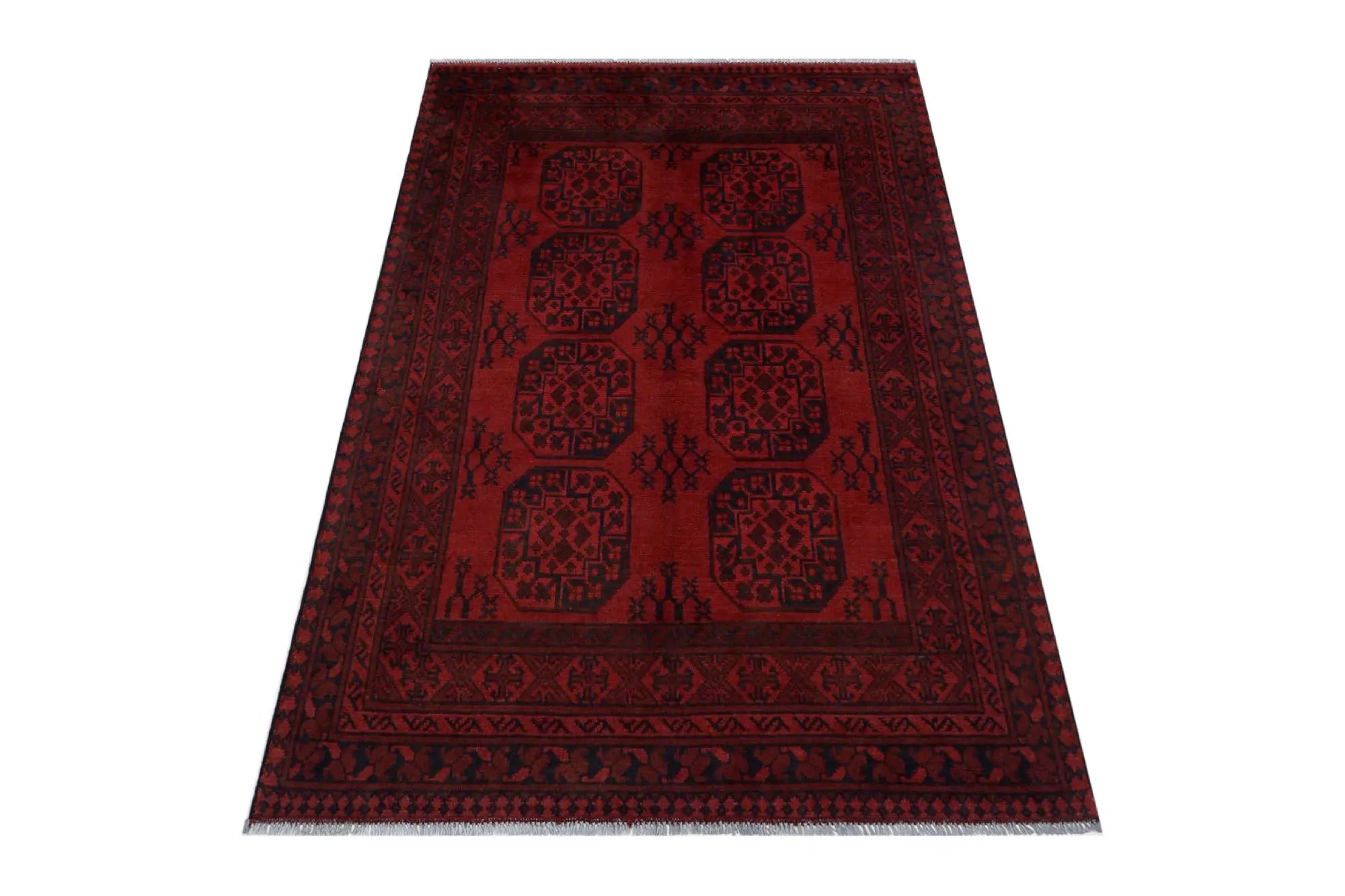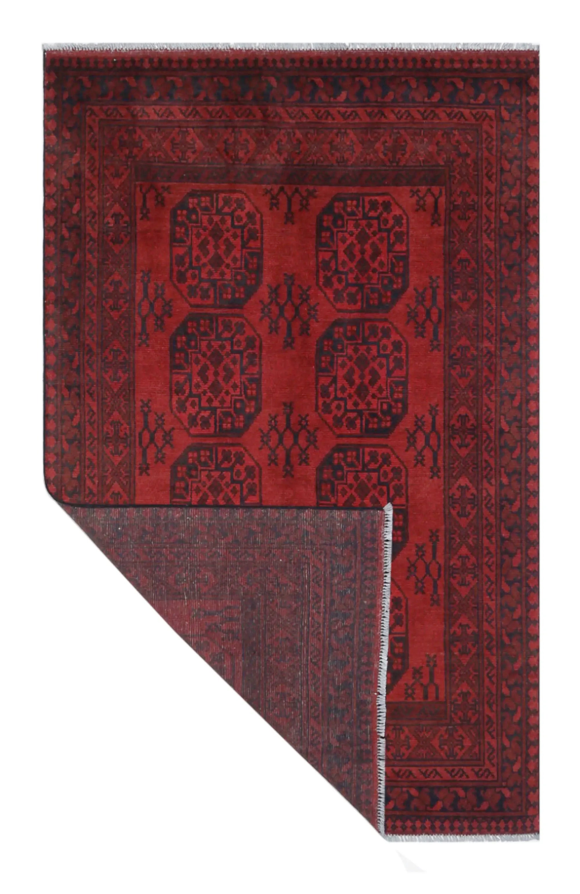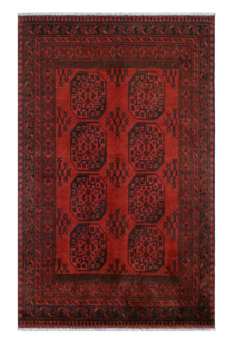 Discover this exquisite hand-knotted Akche rug from Afghanistan, crafted in rich, deep red and black tones that bring warmth and elegance to any interior. Made from 100% pure wool, including the fringes, it contains no synthetic materials, giving it a naturally soft, durable, and authentic feel. The traditional “elephant foot” motif, characteristic of Akche rugs, adds a timeless and culturally rich expression. A perfect choice for anyone seeking a rug that unites craftsmanship, character, and classic oriental beauty.