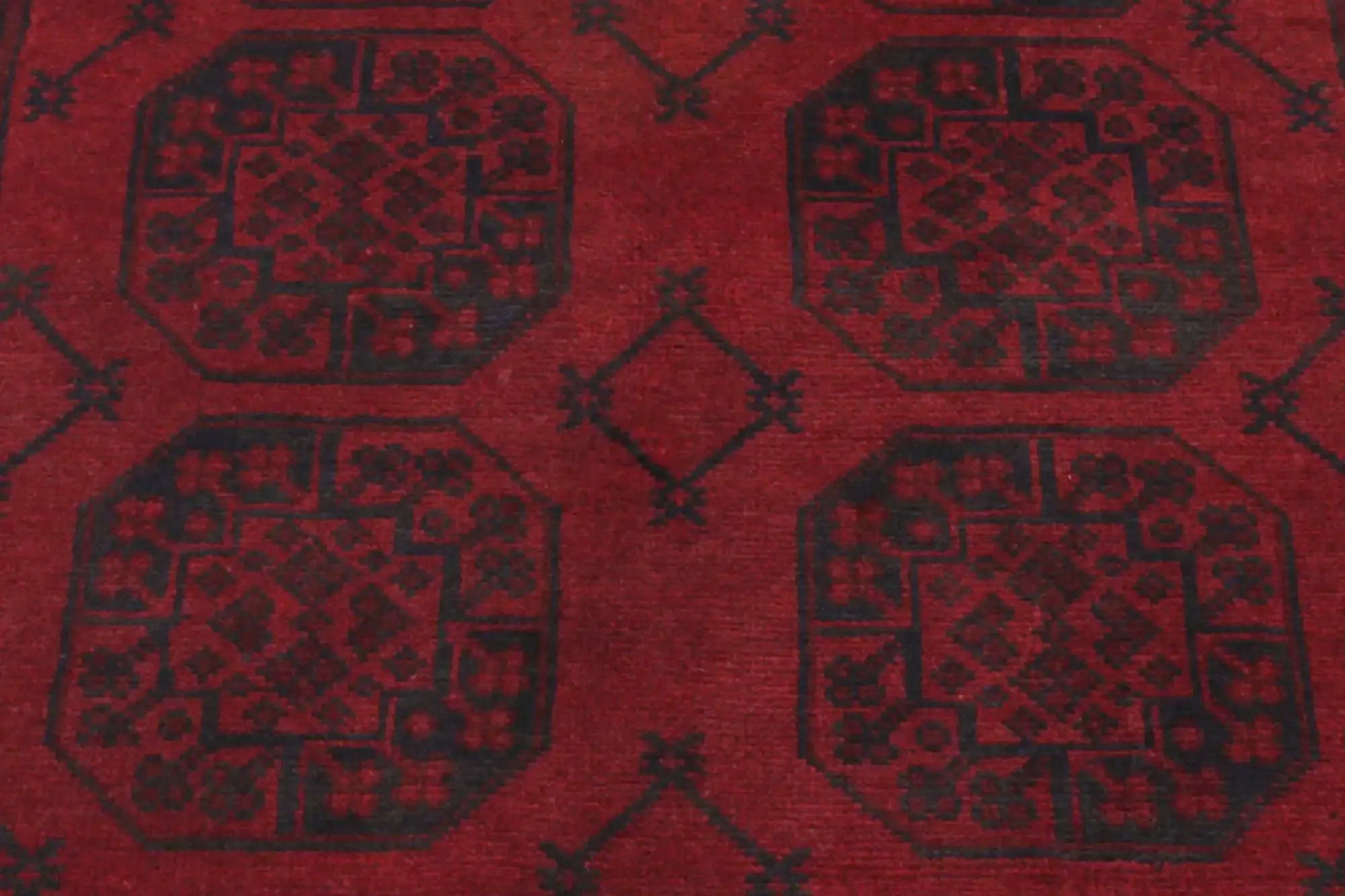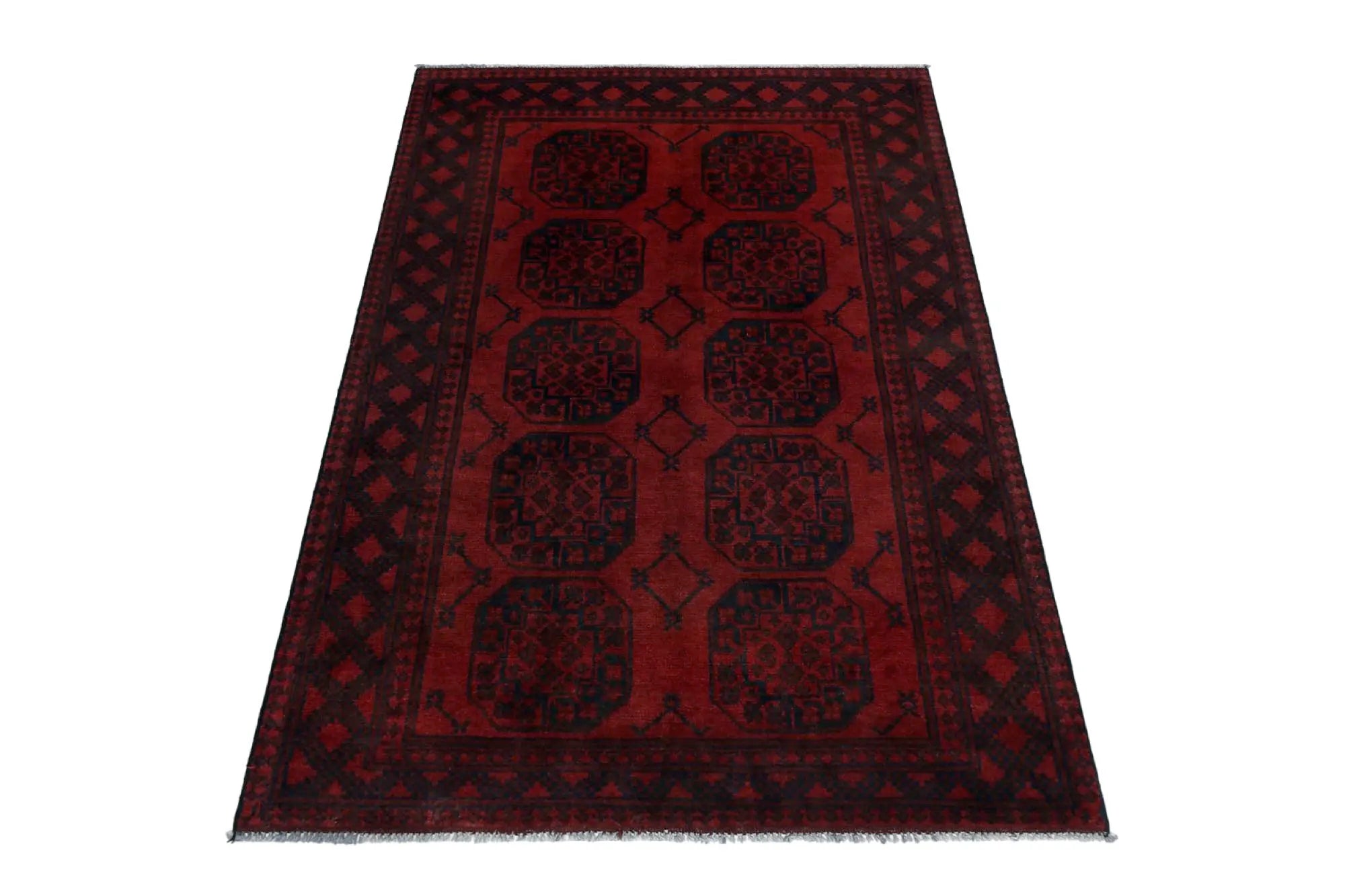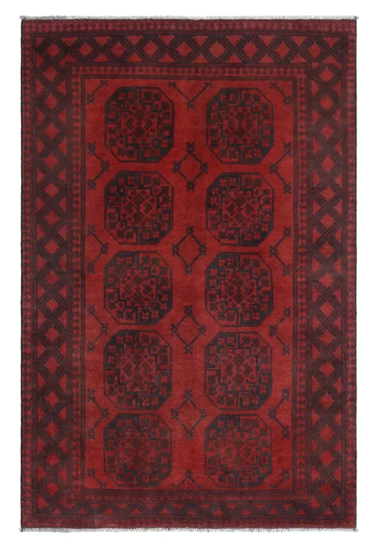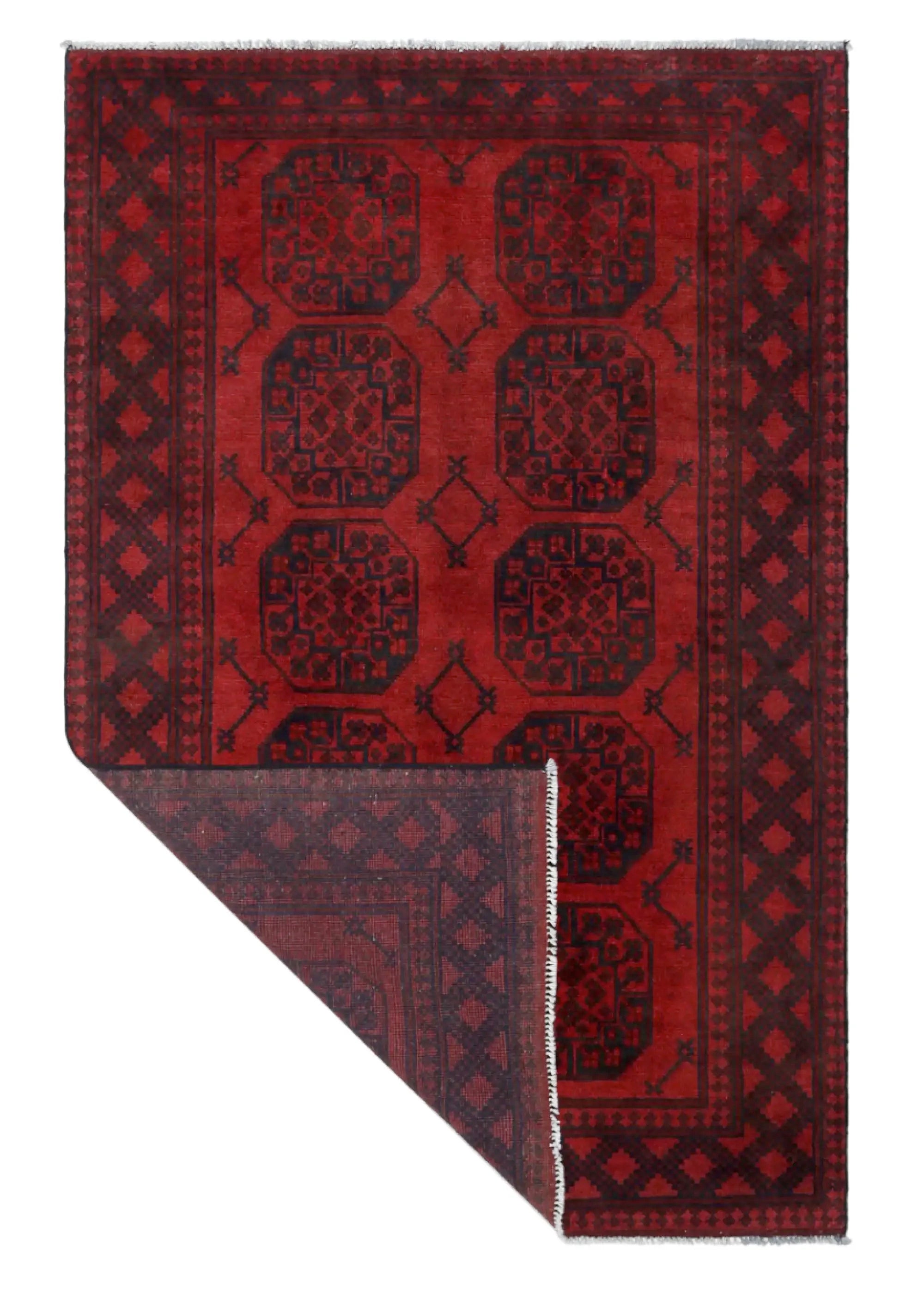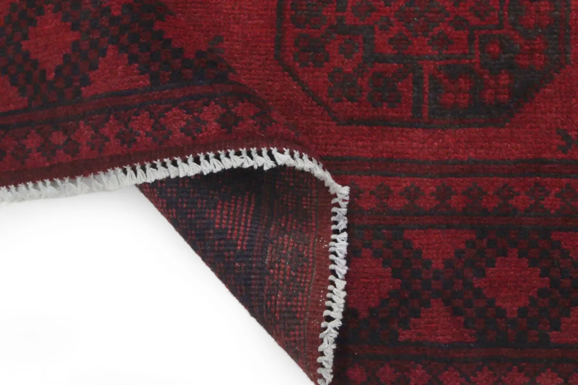 Discover this exquisite hand-knotted Akche rug from Afghanistan, crafted in rich, deep red and black tones that bring warmth and elegance to any interior. Made from 100% pure wool, including the fringes, it contains no synthetic materials, giving it a naturally soft, durable, and authentic feel. The traditional “elephant foot” motif, characteristic of Akche rugs, adds a timeless and culturally rich expression. A perfect choice for anyone seeking a rug that unites craftsmanship, character, and classic oriental beauty.