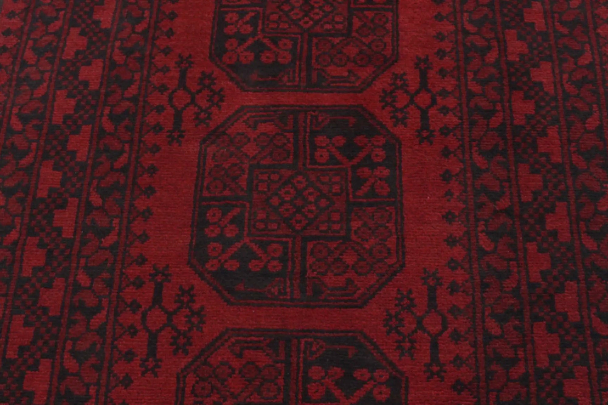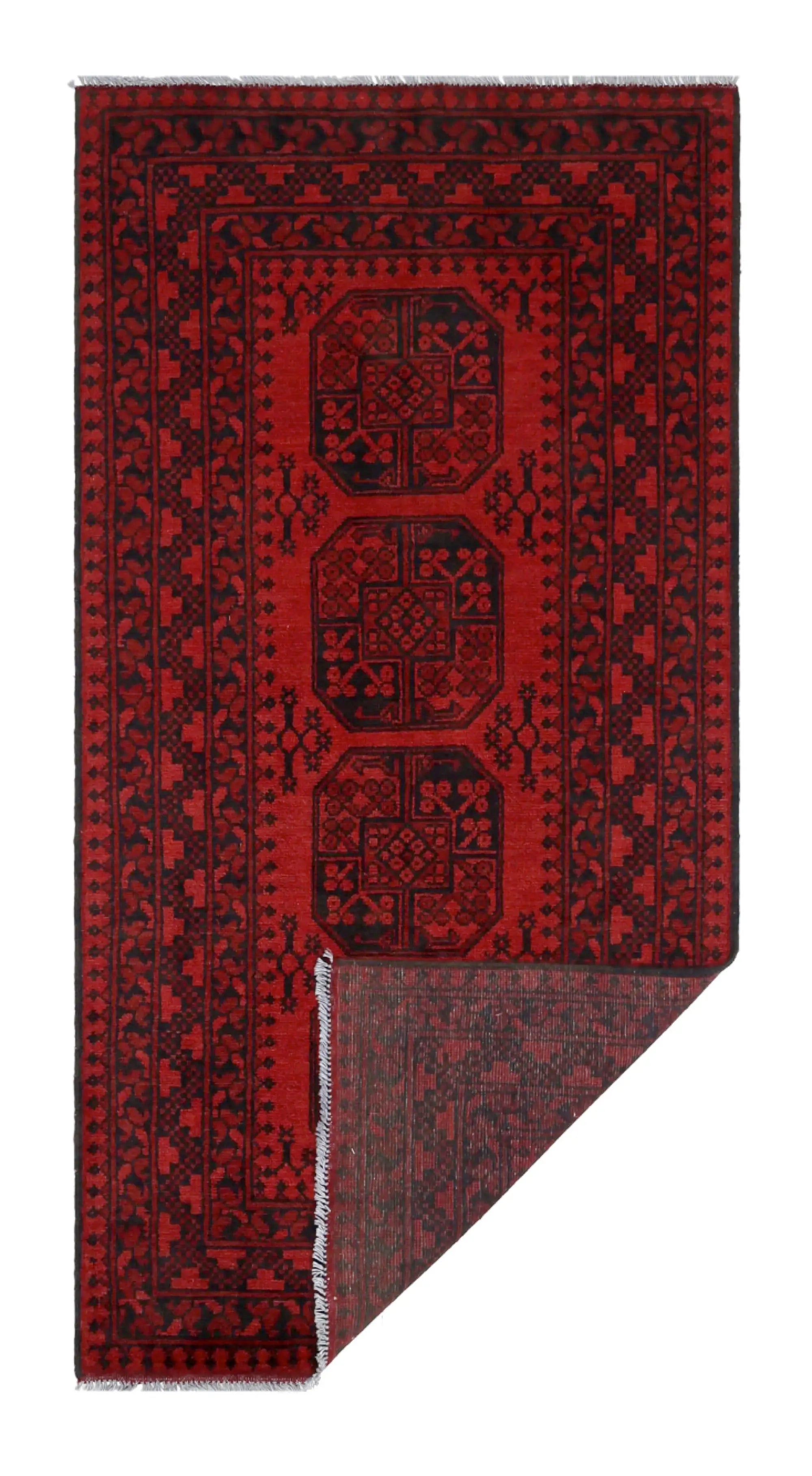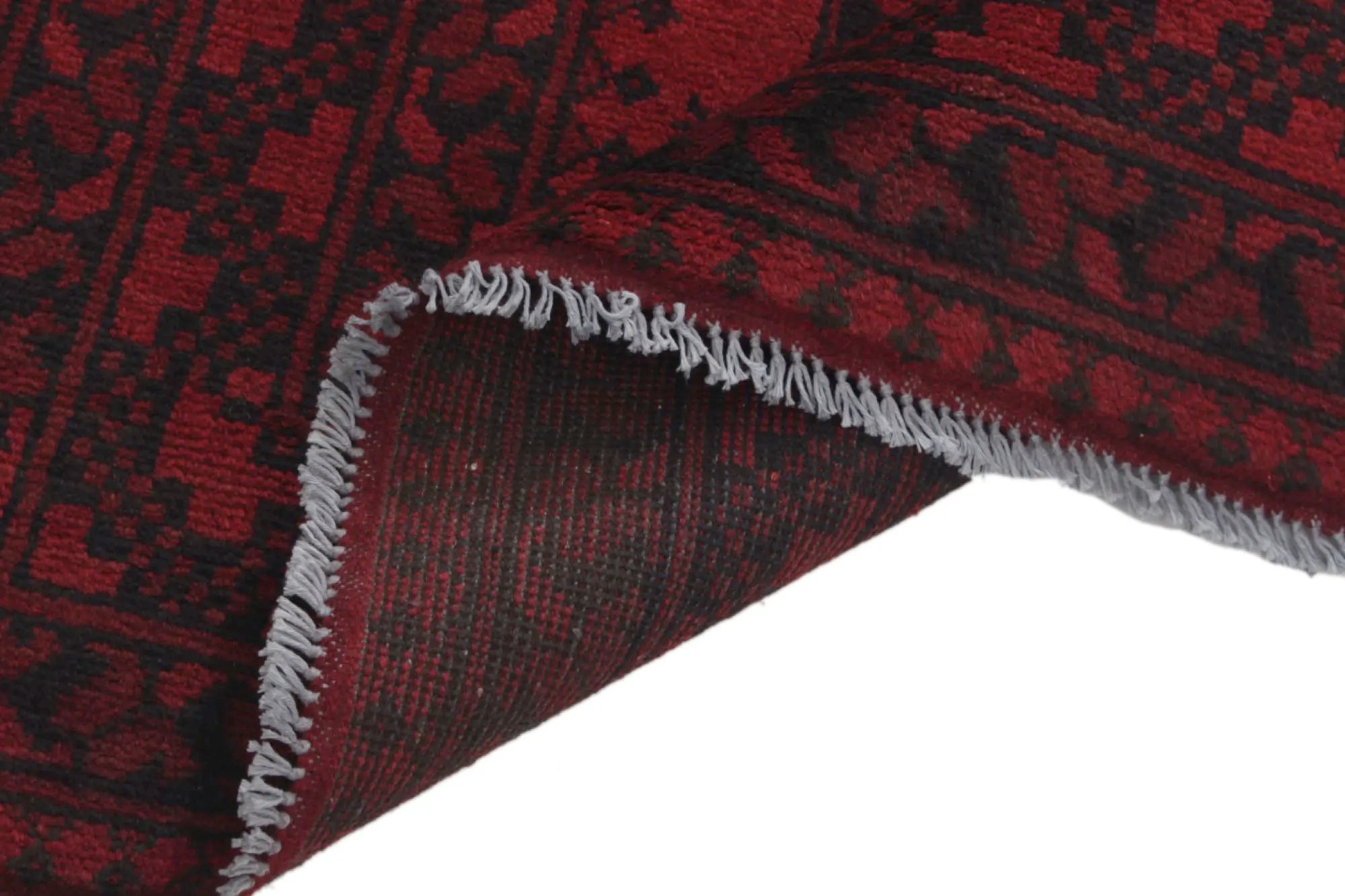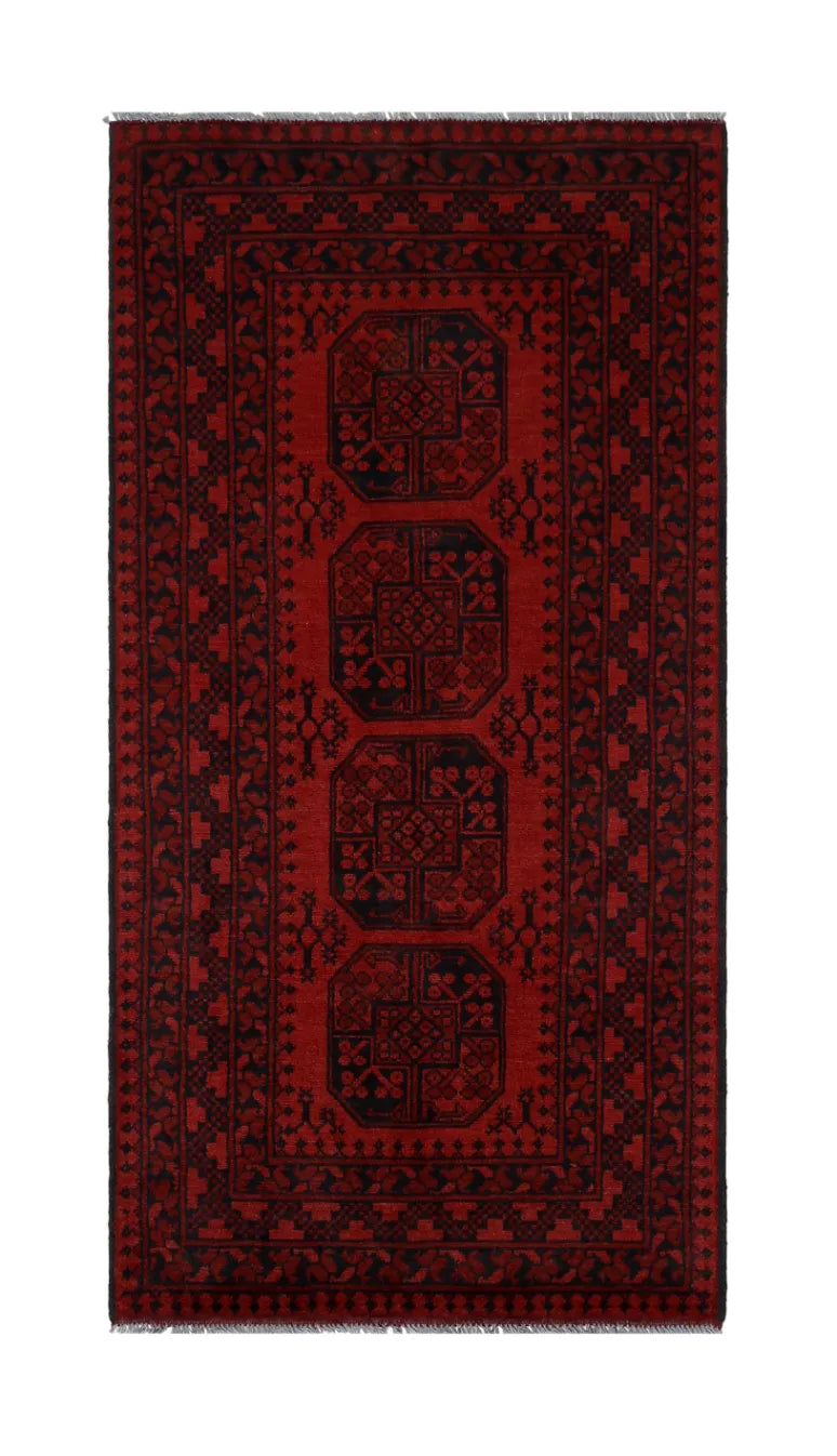 Discover this exquisite hand-knotted Akche rug from Afghanistan, crafted in rich, deep red and black tones that bring warmth and elegance to any interior. Made from 100% pure wool, including the fringes, it contains no synthetic materials, giving it a naturally soft, durable, and authentic feel. The traditional “elephant foot” motif, characteristic of Akche rugs, adds a timeless and culturally rich expression. A perfect choice for anyone seeking a rug that unites craftsmanship, character, and classic oriental beauty.