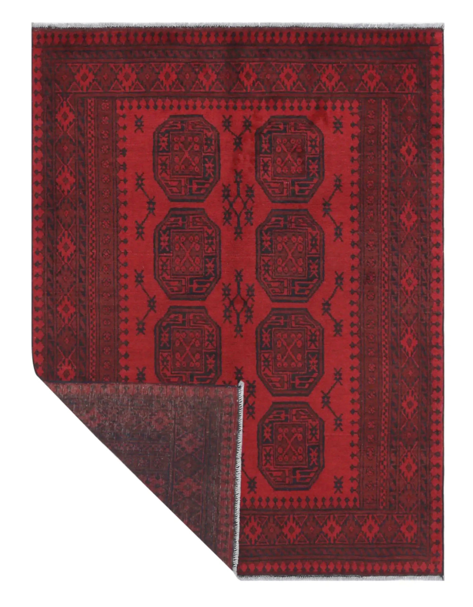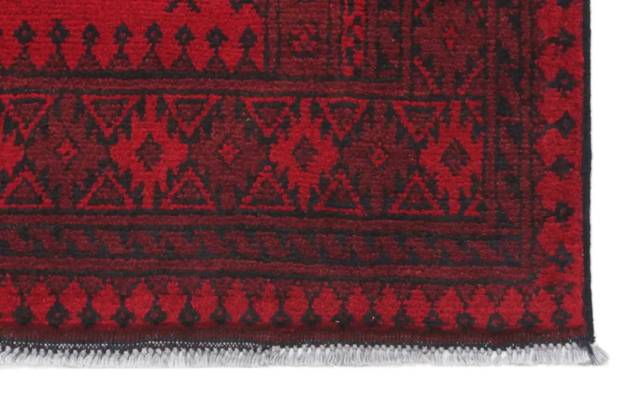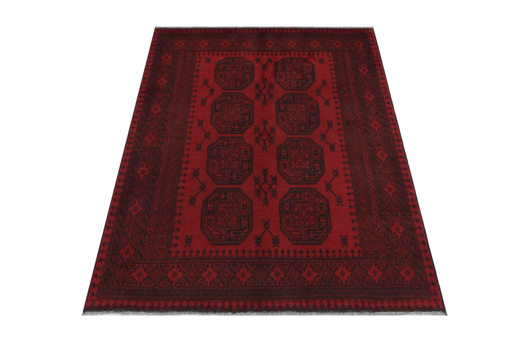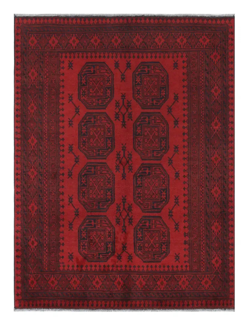 Discover this exquisite hand-knotted Akche rug from Afghanistan, crafted in rich, deep red and black tones that bring warmth and elegance to any interior. Made from 100% pure wool, including the fringes, it contains no synthetic materials, giving it a naturally soft, durable, and authentic feel. The traditional “elephant foot” motif, characteristic of Akche rugs, adds a timeless and culturally rich expression. A perfect choice for anyone seeking a rug that unites craftsmanship, character, and classic oriental beauty.