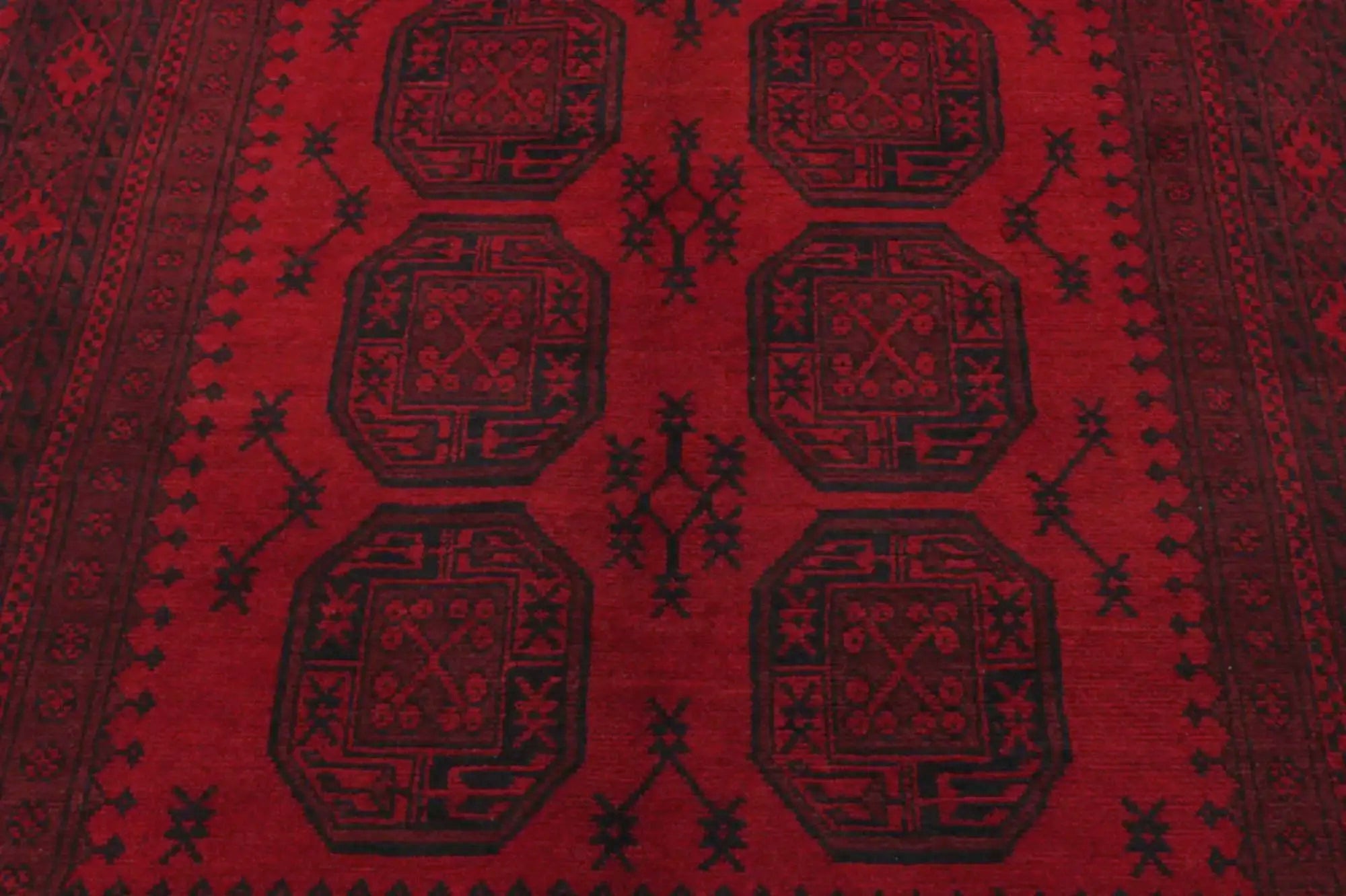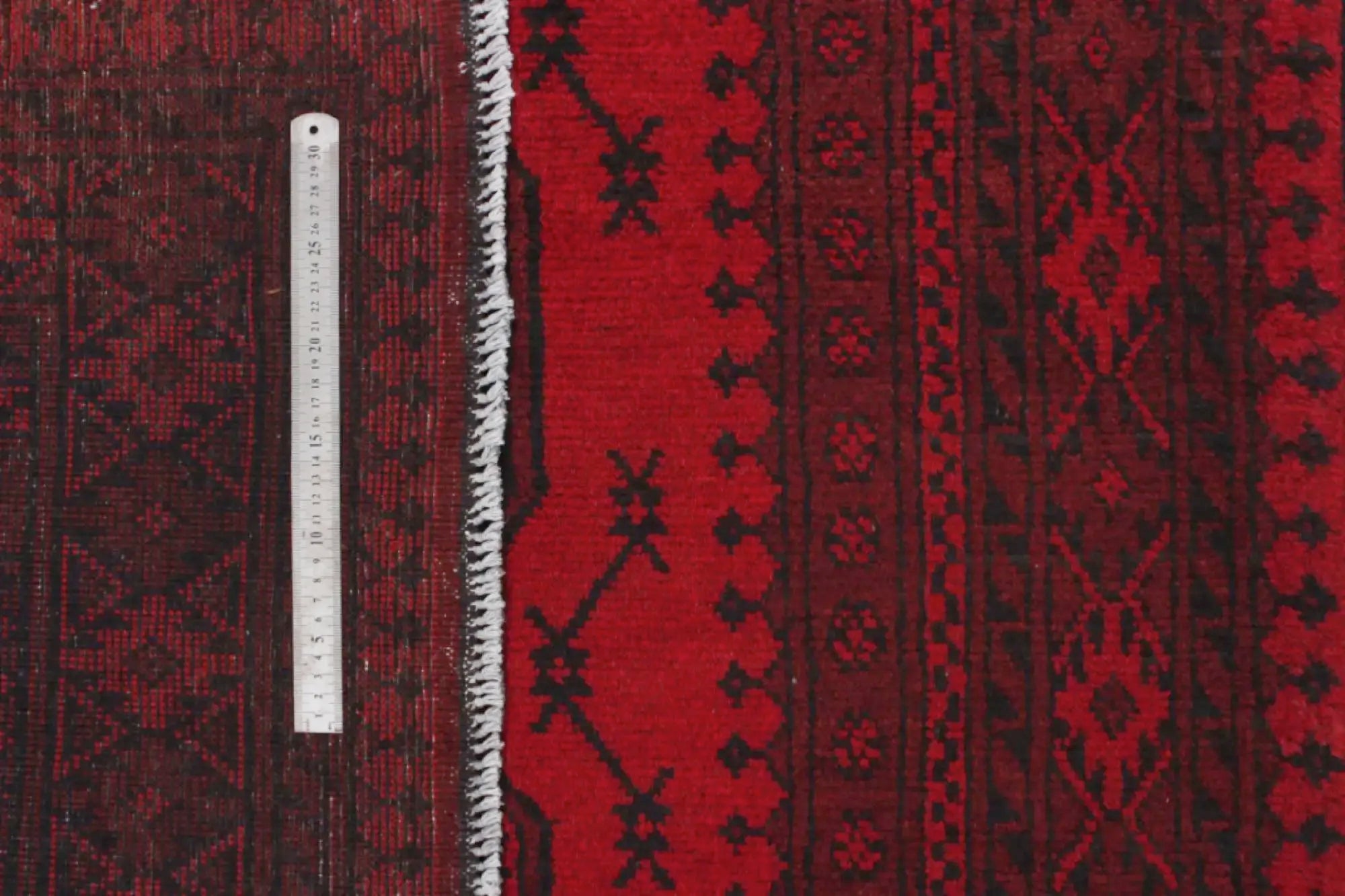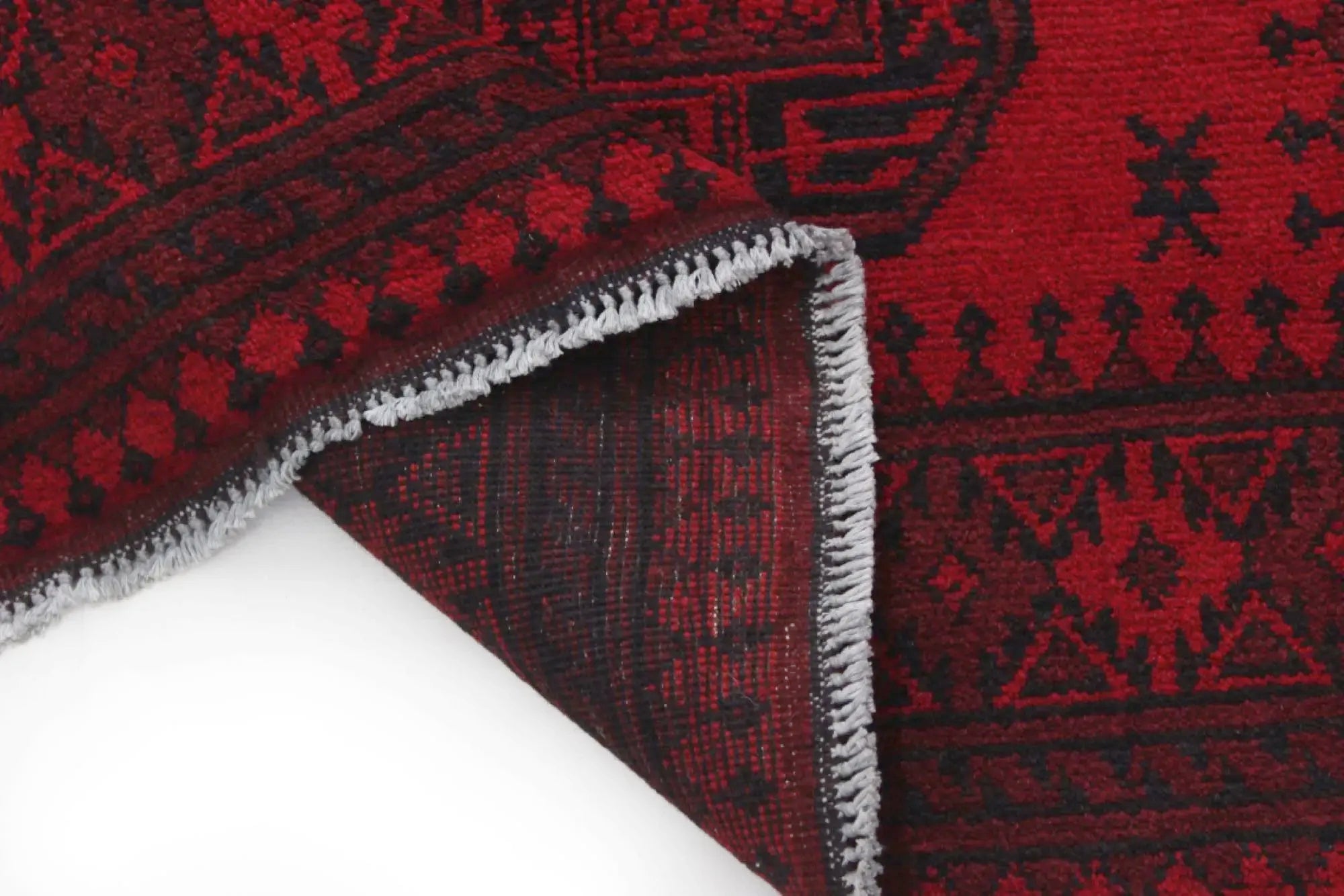 Discover this exquisite hand-knotted Akche rug from Afghanistan, crafted in rich, deep red and black tones that bring warmth and elegance to any interior. Made from 100% pure wool, including the fringes, it contains no synthetic materials, giving it a naturally soft, durable, and authentic feel. The traditional “elephant foot” motif, characteristic of Akche rugs, adds a timeless and culturally rich expression. A perfect choice for anyone seeking a rug that unites craftsmanship, character, and classic oriental beauty.
