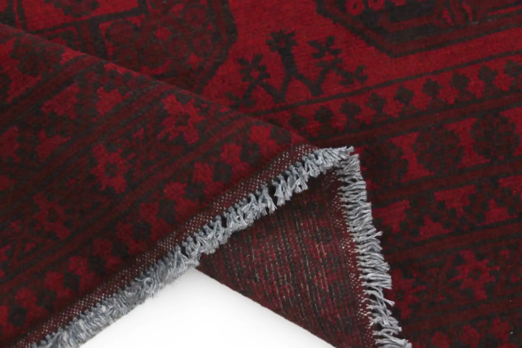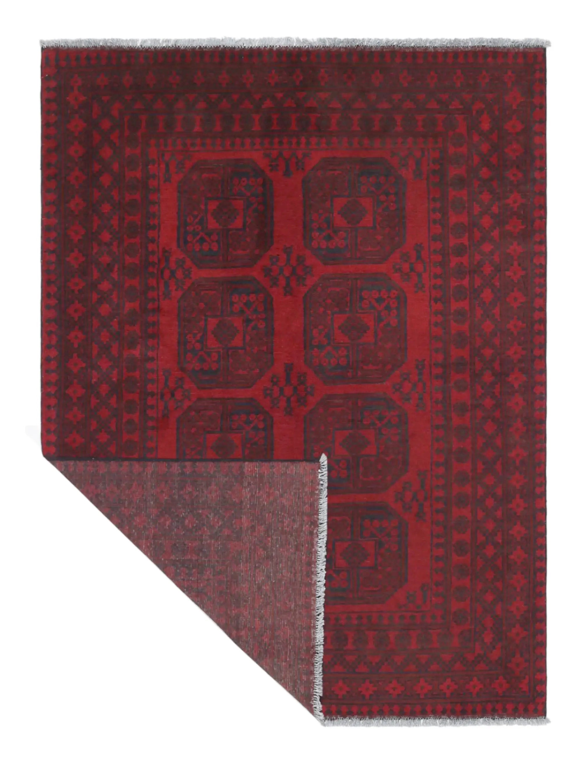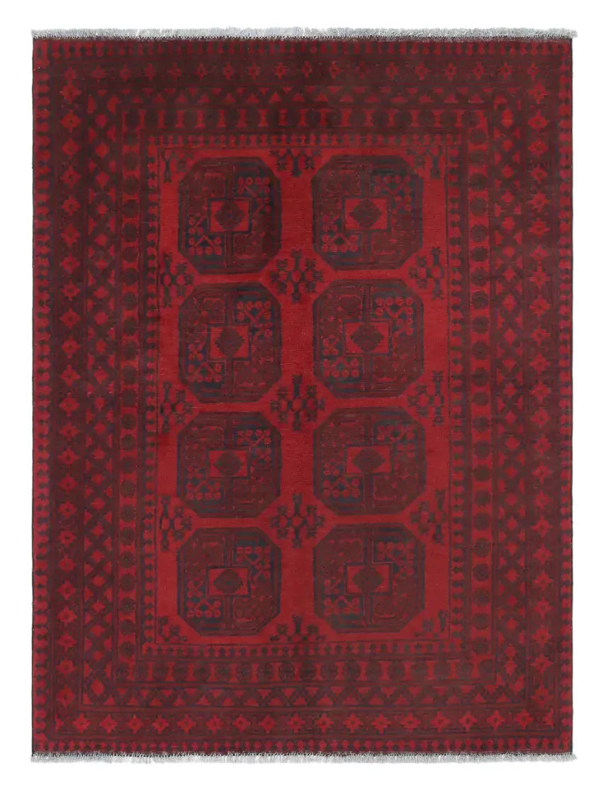 Discover this exquisite hand-knotted Akche rug from Afghanistan, crafted in rich, deep red and black tones that bring warmth and elegance to any interior. Made from 100% pure wool, including the fringes, it contains no synthetic materials, giving it a naturally soft, durable, and authentic feel. The traditional “elephant foot” motif, characteristic of Akche rugs, adds a timeless and culturally rich expression. A perfect choice for anyone seeking a rug that unites craftsmanship, character, and classic oriental beauty.