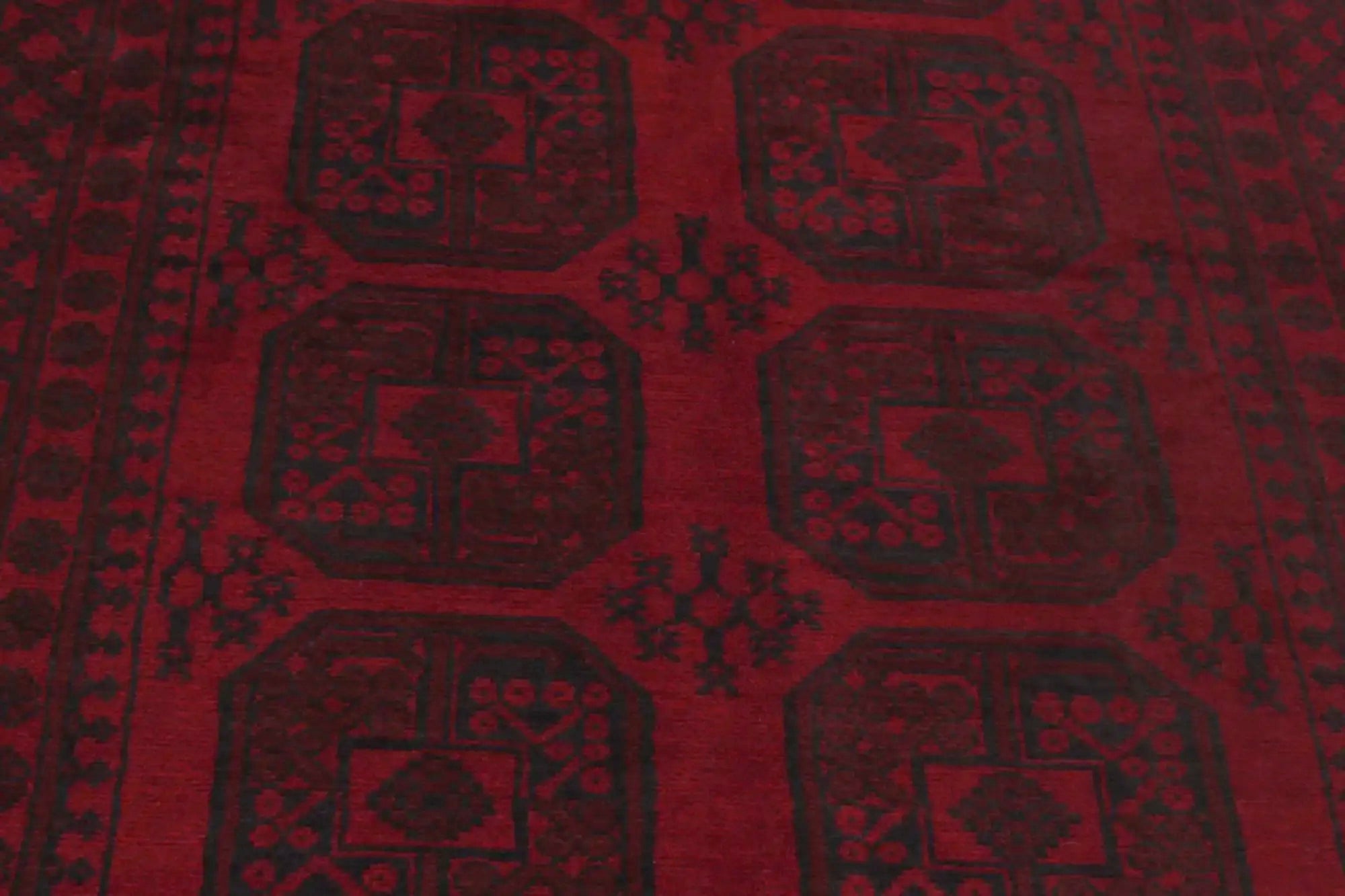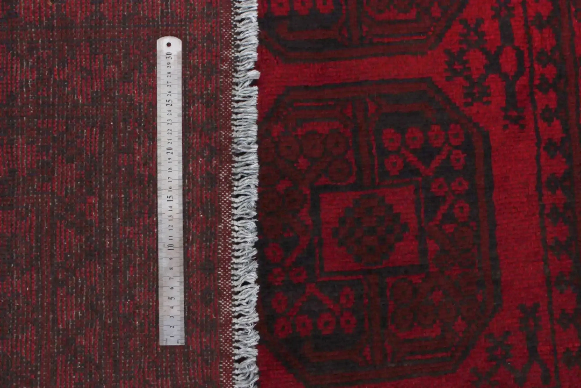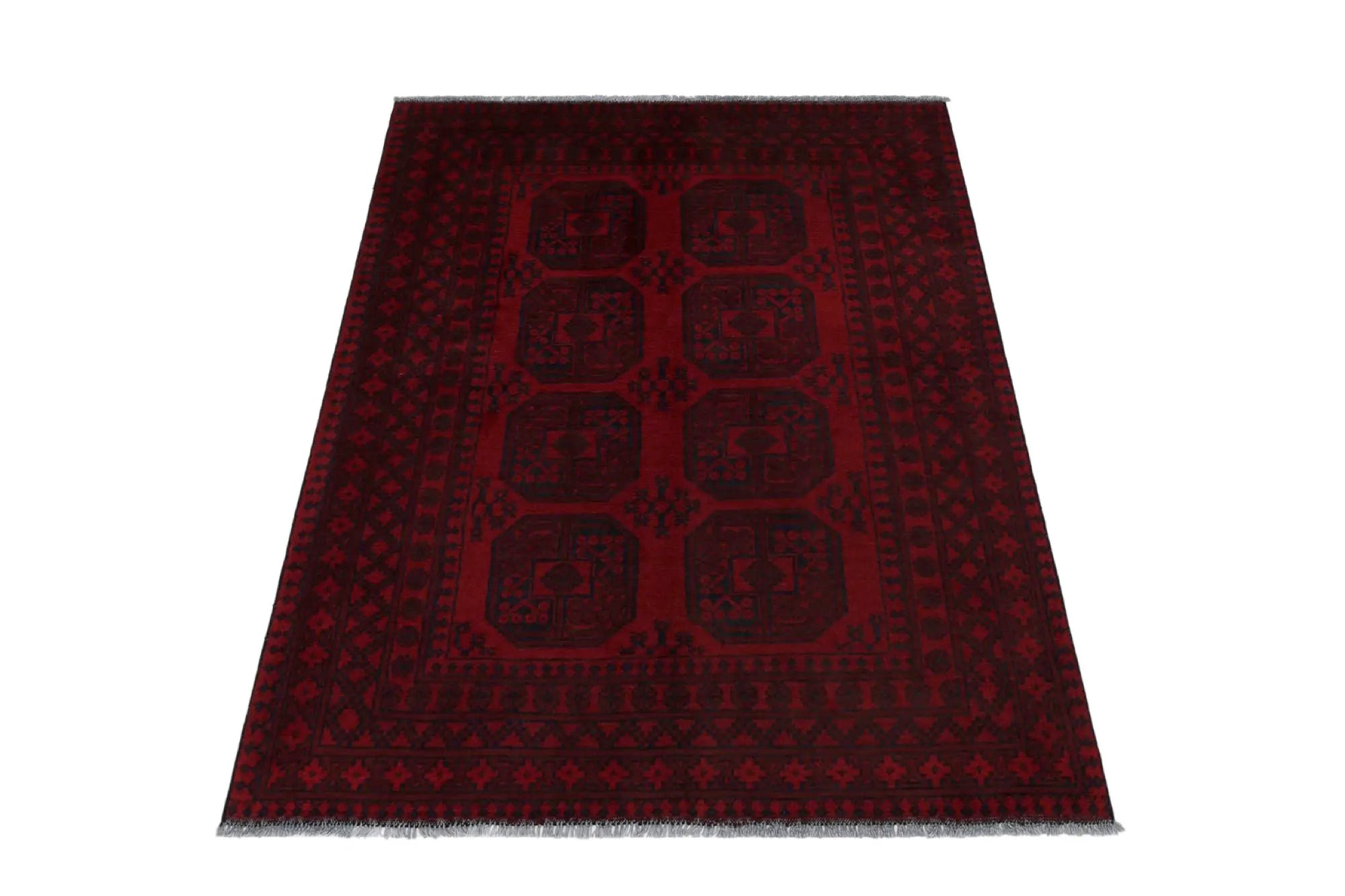 Discover this exquisite hand-knotted Akche rug from Afghanistan, crafted in rich, deep red and black tones that bring warmth and elegance to any interior. Made from 100% pure wool, including the fringes, it contains no synthetic materials, giving it a naturally soft, durable, and authentic feel. The traditional “elephant foot” motif, characteristic of Akche rugs, adds a timeless and culturally rich expression. A perfect choice for anyone seeking a rug that unites craftsmanship, character, and classic oriental beauty.