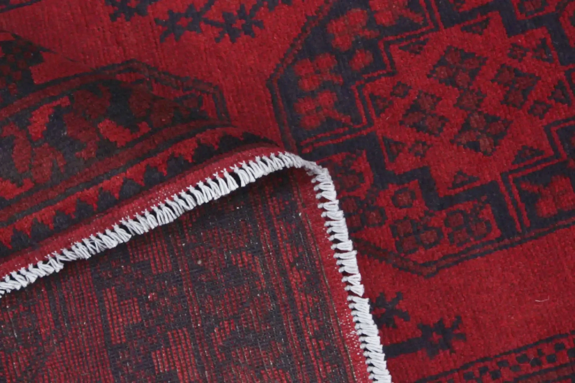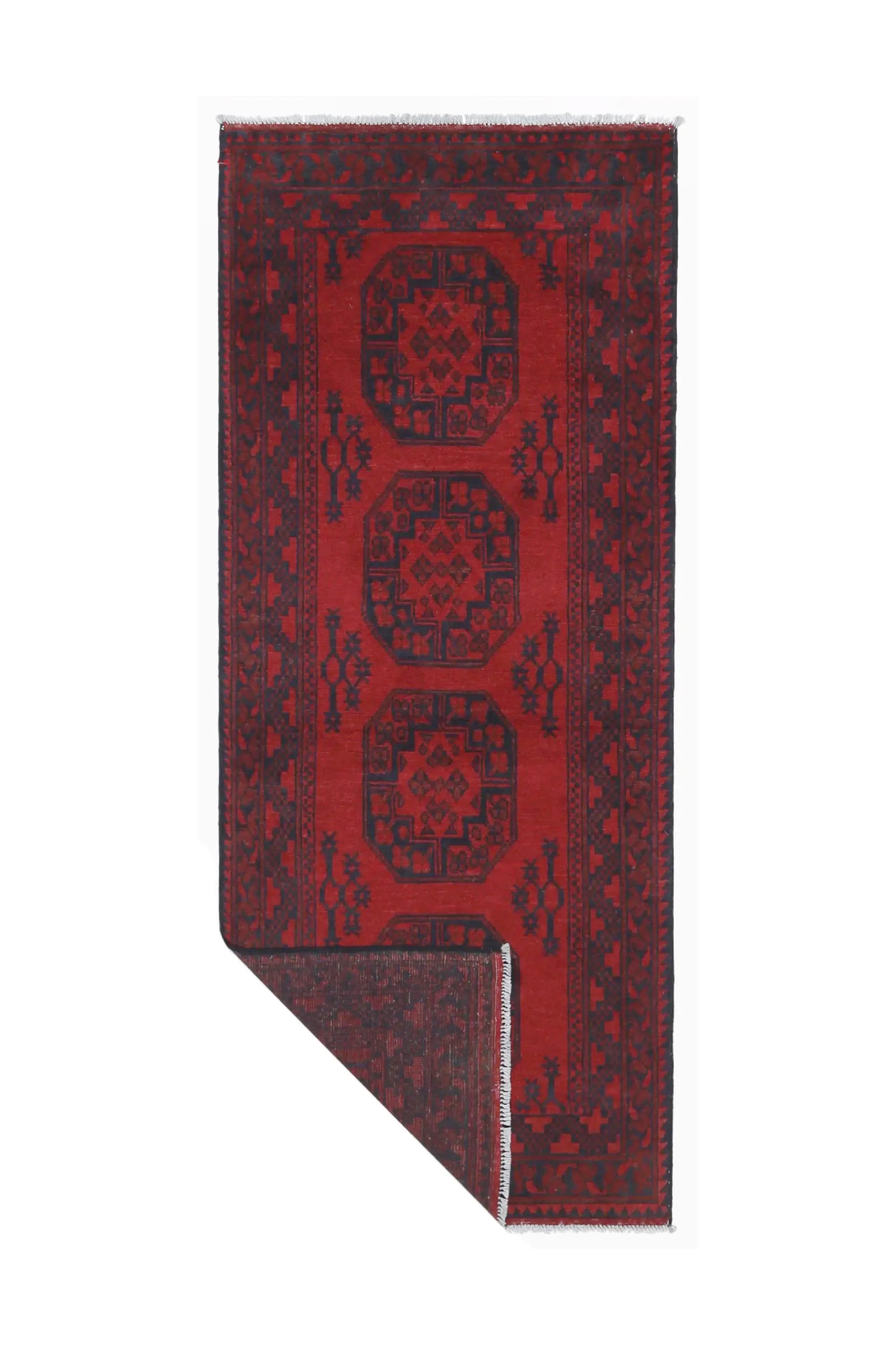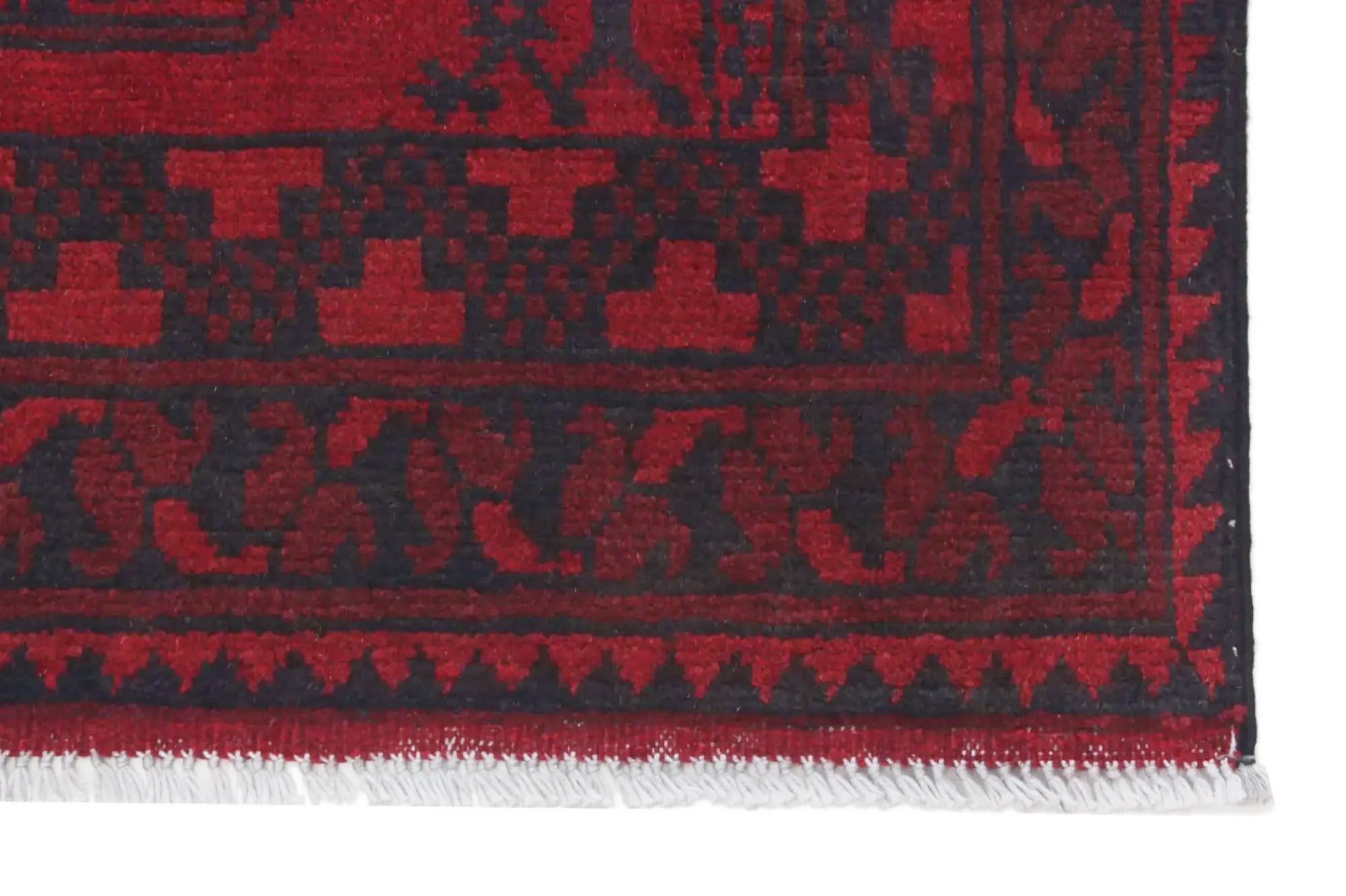 Discover this exquisite hand-knotted Akche rug from Afghanistan, crafted in rich, deep red and black tones that bring warmth and elegance to any interior. Made from 100% pure wool, including the fringes, it contains no synthetic materials, giving it a naturally soft, durable, and authentic feel. The traditional “elephant foot” motif, characteristic of Akche rugs, adds a timeless and culturally rich expression. A perfect choice for anyone seeking a rug that unites craftsmanship, character, and classic oriental beauty.