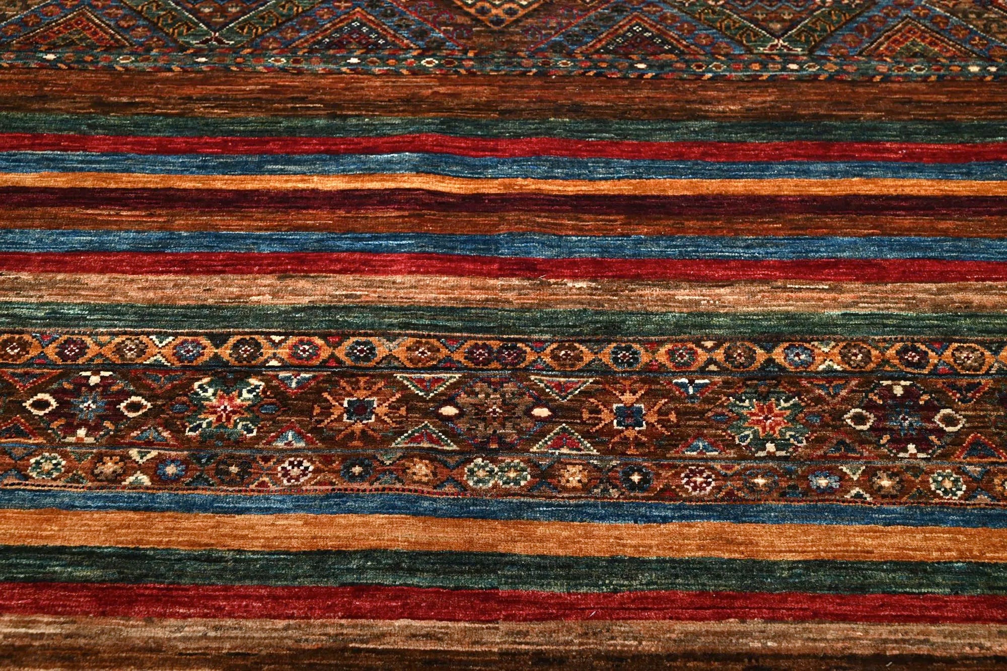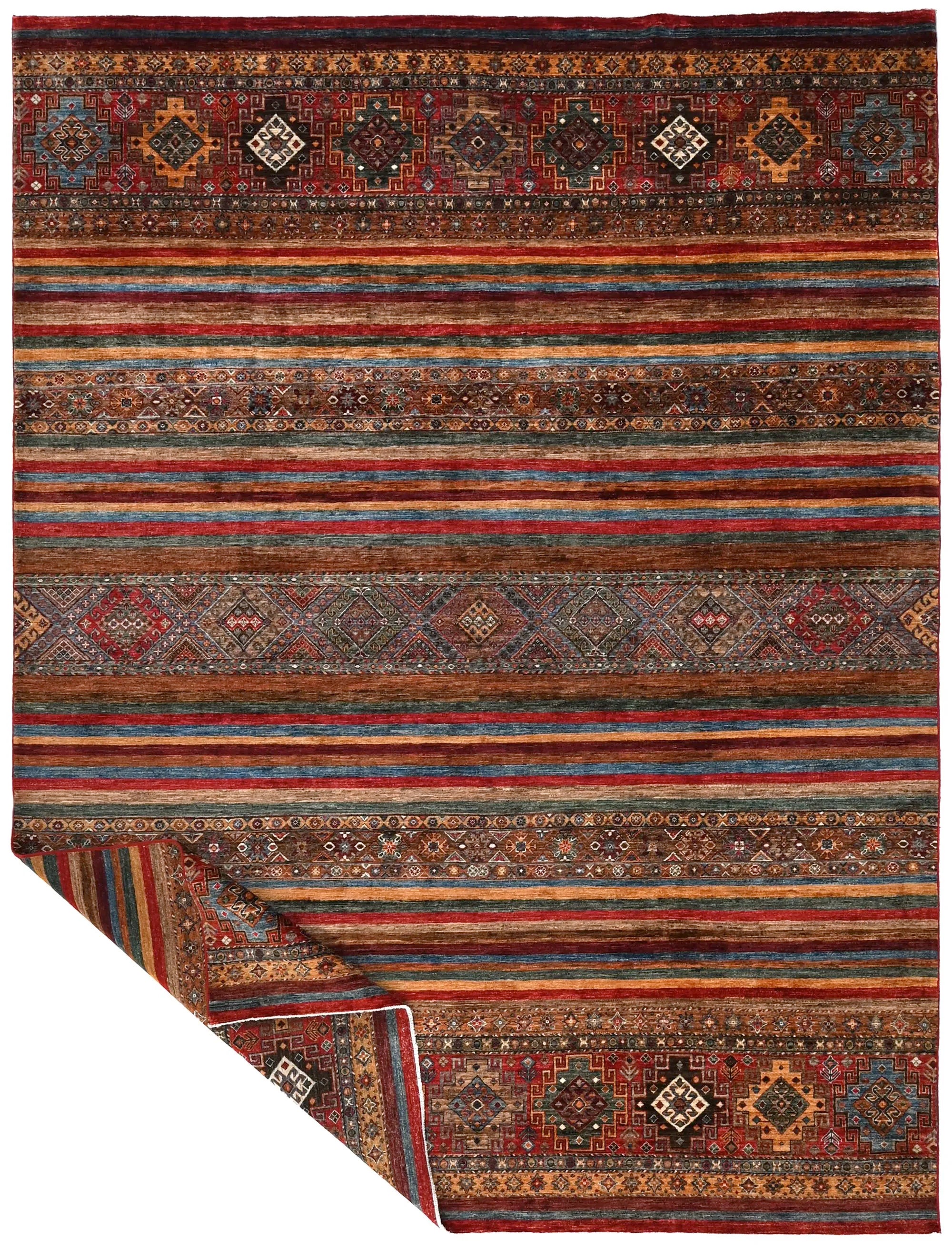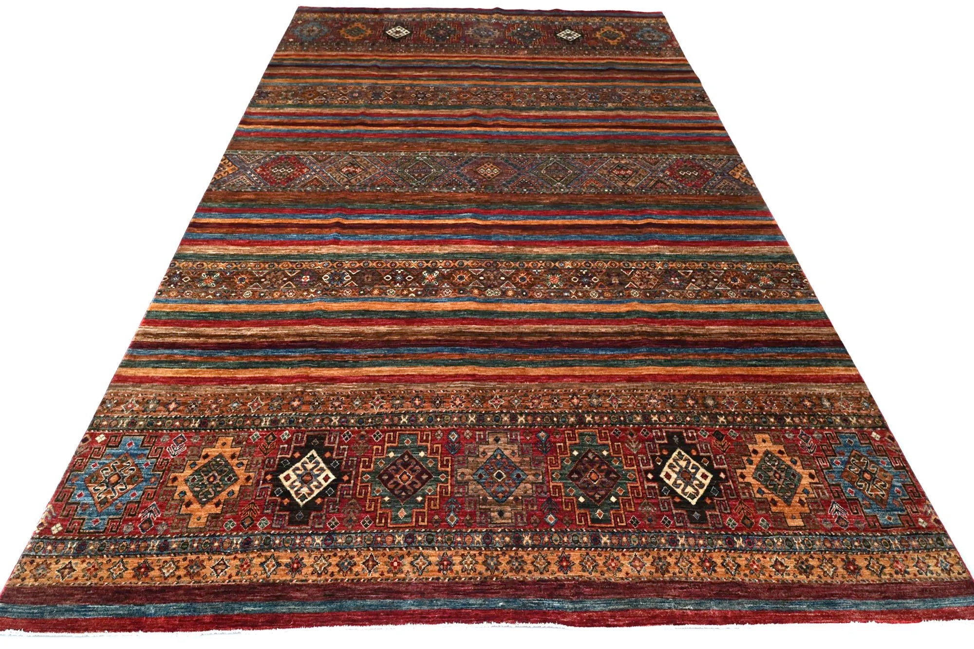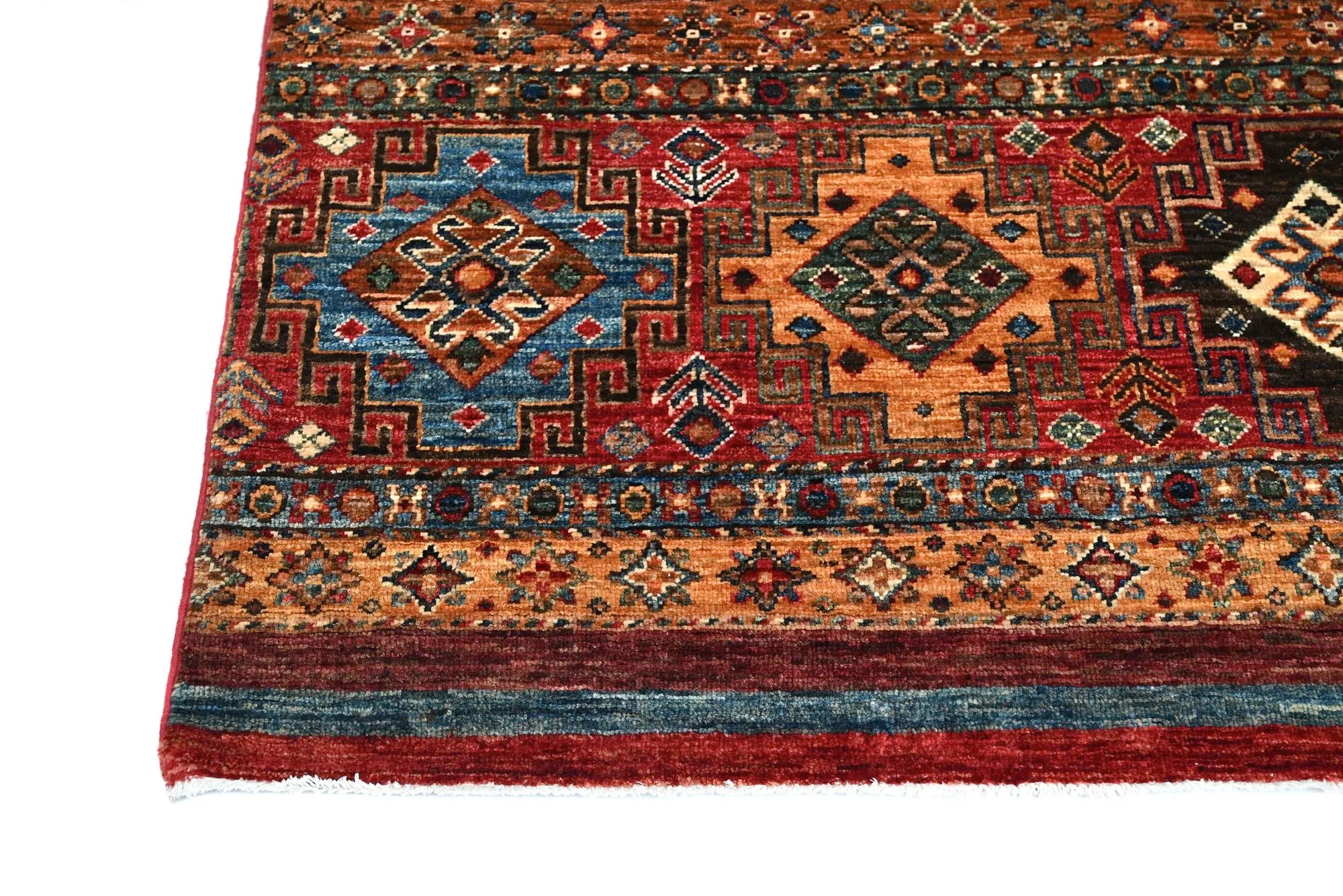 Khorjin rugs from Afghanistan are a type of traditional te x tile often used as bags or saddlebags by nomadic tribes in the region. These rugs are known for their practical uses and beautiful patterns. Originally created to be used as pack bags by nomadic people, Khorjin rugs are often designed with functionality in mind. The patterns on Khorjin rugs are often geometric and colorful, with symbolic motifs representing the tribe's culture and traditions. Common motifs include diamonds, rhombuses, and other geometric shapes, often in a rich color palette. Khorjin rugs are typically woven from wool, which makes them durable and tough enough for nomadic life. The colors in Khorjin rugs are usually natural, produced from plant dyes, giving them a warm and earthy color palette. Typical colors include red, blue, brown, and beige, but there may also be touches of green and yellow. Khorjin rugs are not just practical, but they are also artworks that tell stories about the tribe's life and culture. Each rug is unique and reflects the weaver's skill and creativity. High-quality materials and craftsmanship make Khorjin rugs long-lasting and valuable investments for customers.