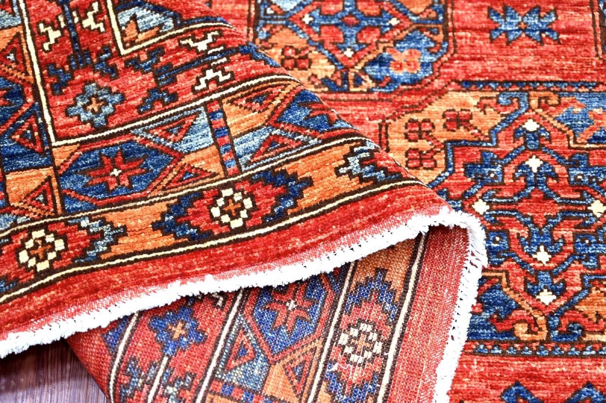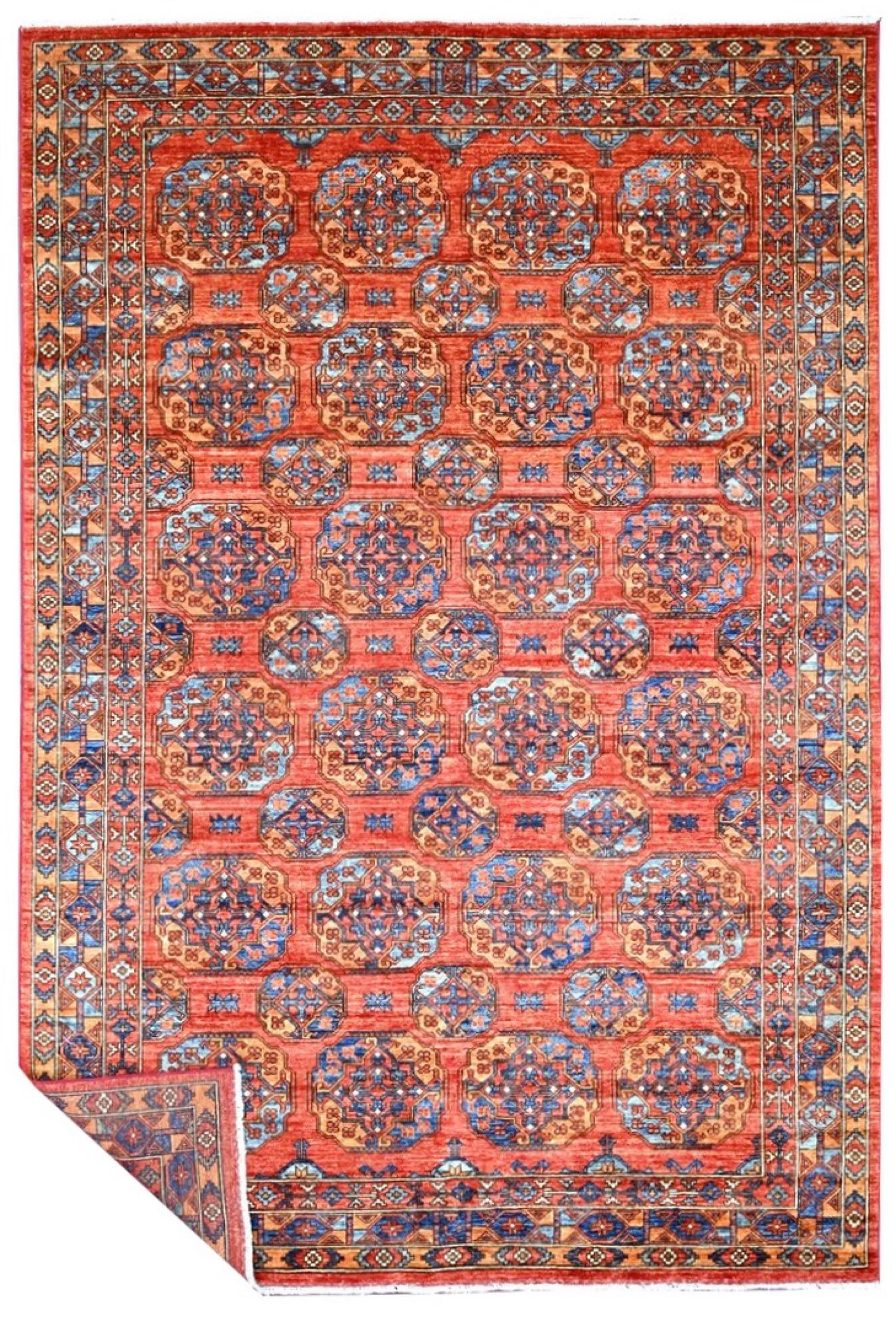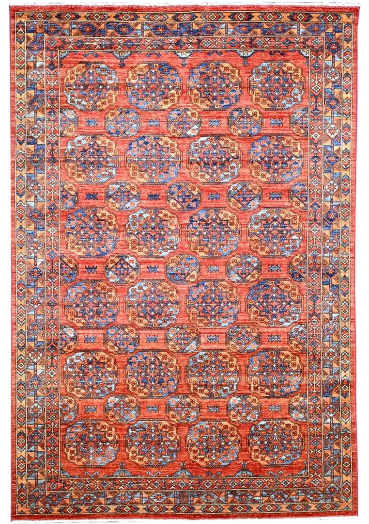 Filpa is an exclusive hand-knotted Afghan rug, inspired by the classic Bokhara design with its iconic elephant foot motifs. This traditional pattern has been reimagined with brighter, more joyful colors, creating a warm and vibrant expression that stands out beautifully in any interior. The rug is made from 100% hand-spun wool and dyed entirely with natural vegetable dyes, giving it a soft texture, rich sheen, and long-lasting durability. With its refined knotting and fresh color palette, Filpa blends timeless oriental tradition with a contemporary artistic touch. If you are searching for a Bokhara-style rug, a distinctive designer rug, or a premium hand-knotted wool rug from Afghanistan, Filpa is an exceptional choice. A rug that brings craftsmanship, culture, and color into perfect harmony.
