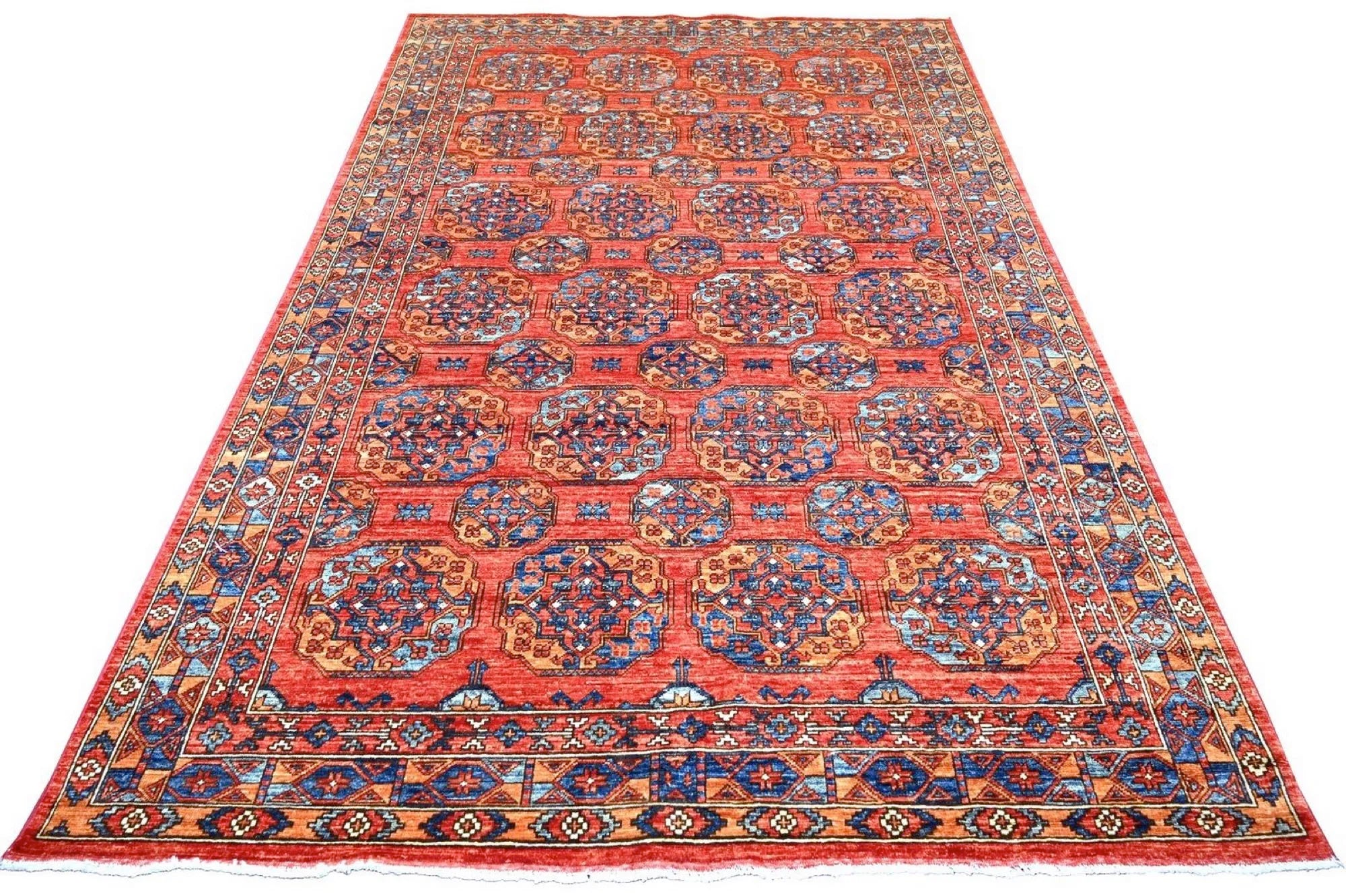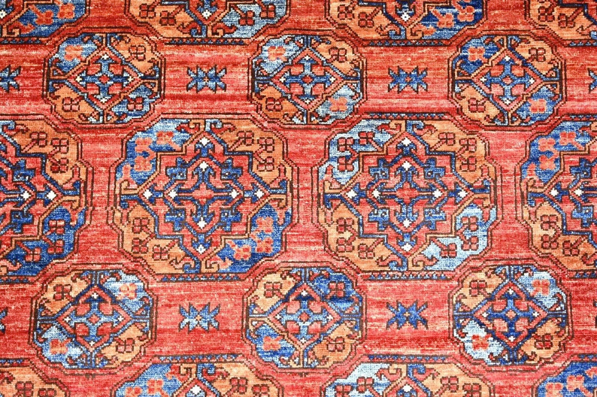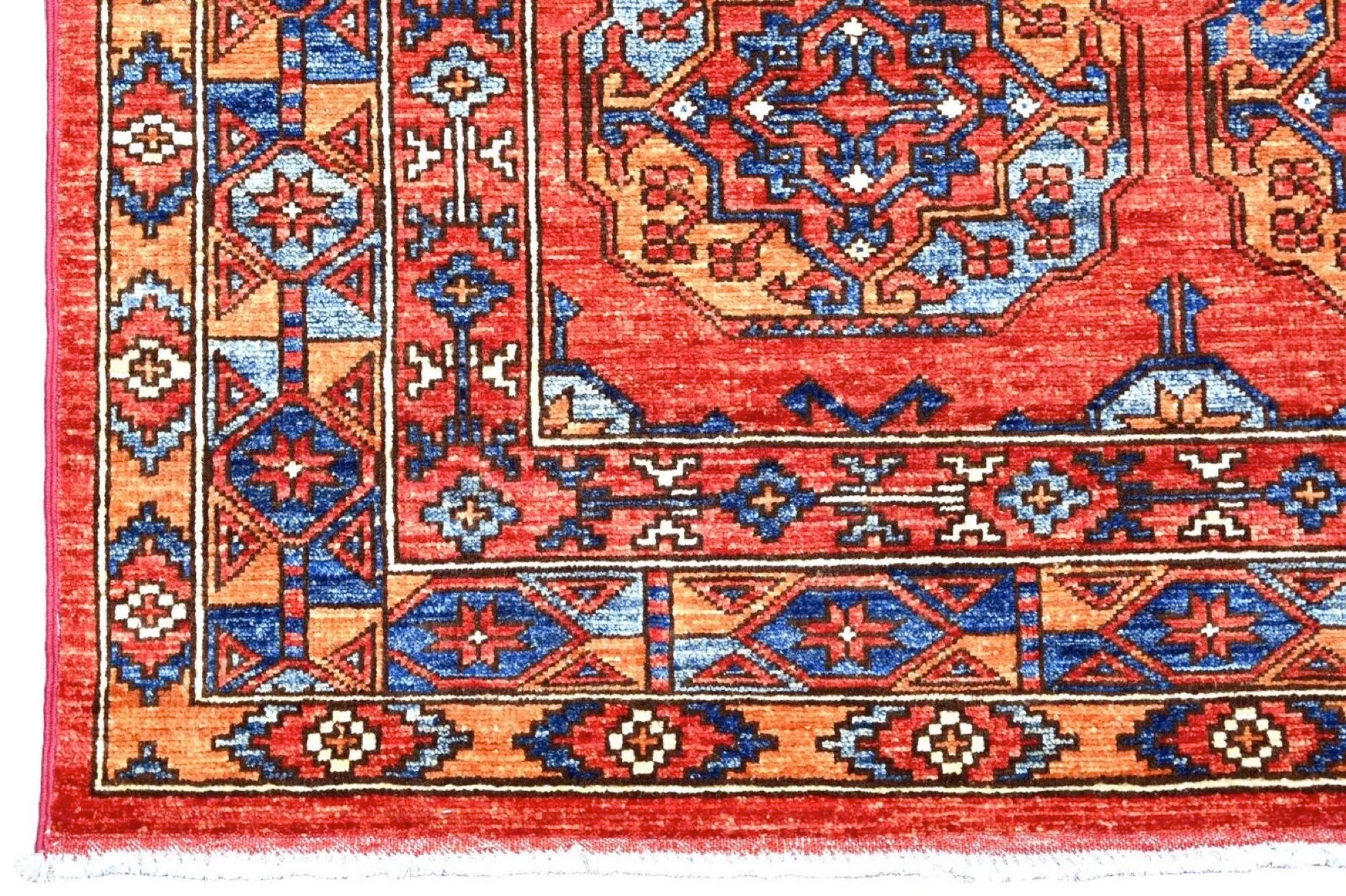 Filpa is an exclusive hand-knotted Afghan rug, inspired by the classic Bokhara design with its iconic elephant foot motifs. This traditional pattern has been reimagined with brighter, more joyful colors, creating a warm and vibrant expression that stands out beautifully in any interior. The rug is made from 100% hand-spun wool and dyed entirely with natural vegetable dyes, giving it a soft texture, rich sheen, and long-lasting durability. With its refined knotting and fresh color palette, Filpa blends timeless oriental tradition with a contemporary artistic touch. If you are searching for a Bokhara-style rug, a distinctive designer rug, or a premium hand-knotted wool rug from Afghanistan, Filpa is an exceptional choice. A rug that brings craftsmanship, culture, and color into perfect harmony.