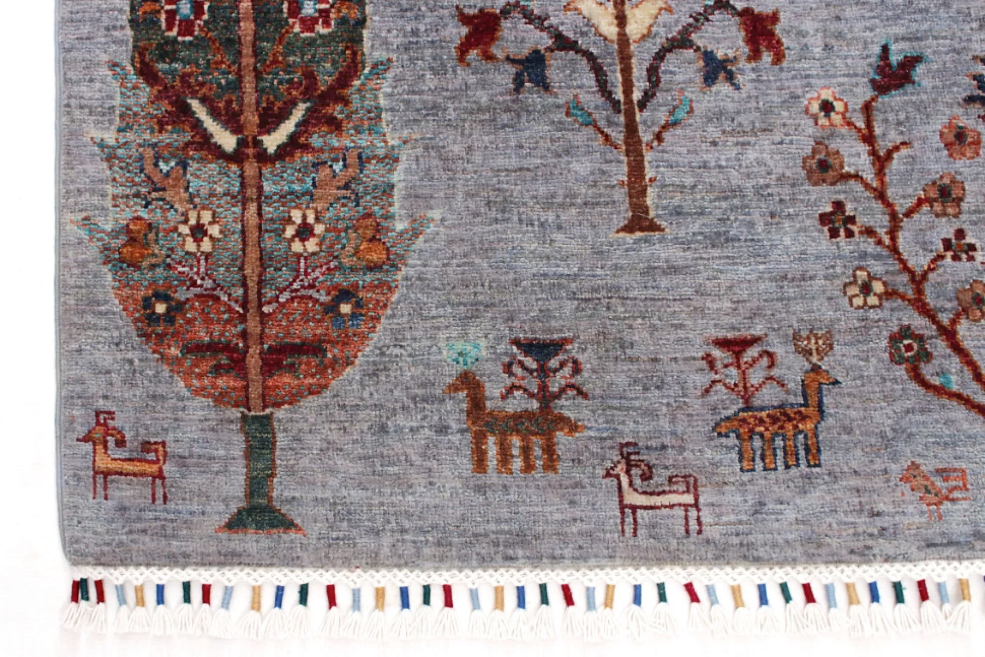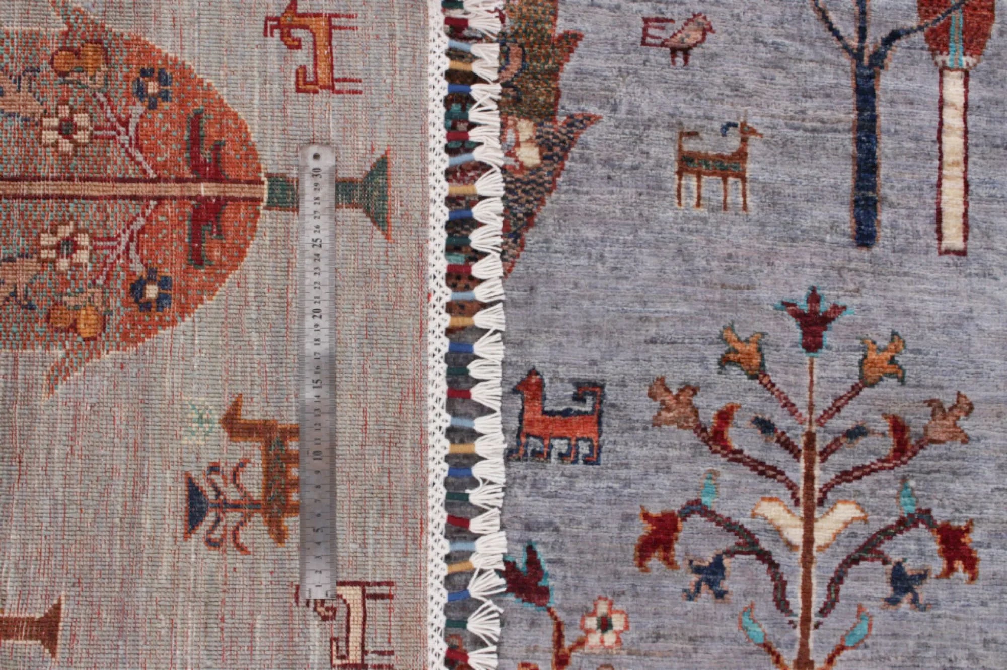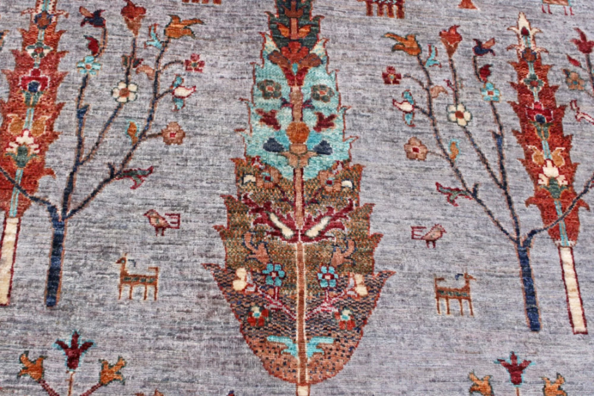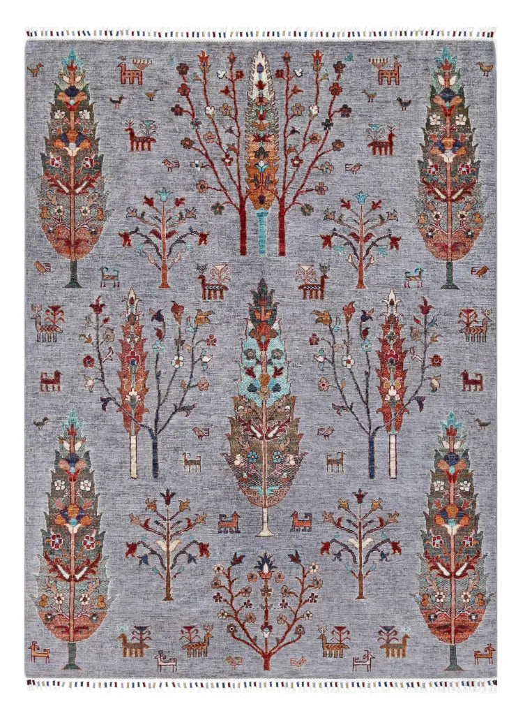 Gran is an exclusive, hand-knotted Khorjin-style rug from Afghanistan, featuring a design inspired by the organic patterns of pine wood grains. The bright, cheerful colors combined with the artistic composition make this rug ideal for anyone looking for a vibrant, modern and expressive interior piece. Made from 100% hand-spun wool and dyed entirely with natural vegetable dyes, this rug offers a warm, authentic look with a beautiful natural sheen. Every knot is tied by hand by skilled Afghan artisans, ensuring a dense, durable and long-lasting rug of superior quality. The Gran rug fits perfectly in modern and classic interiors alike and serves beautifully as a statement piece in living rooms, bedrooms or workspaces. A stunning blend of traditional craftsmanship and contemporary design — for those who want a rug that truly stands out.