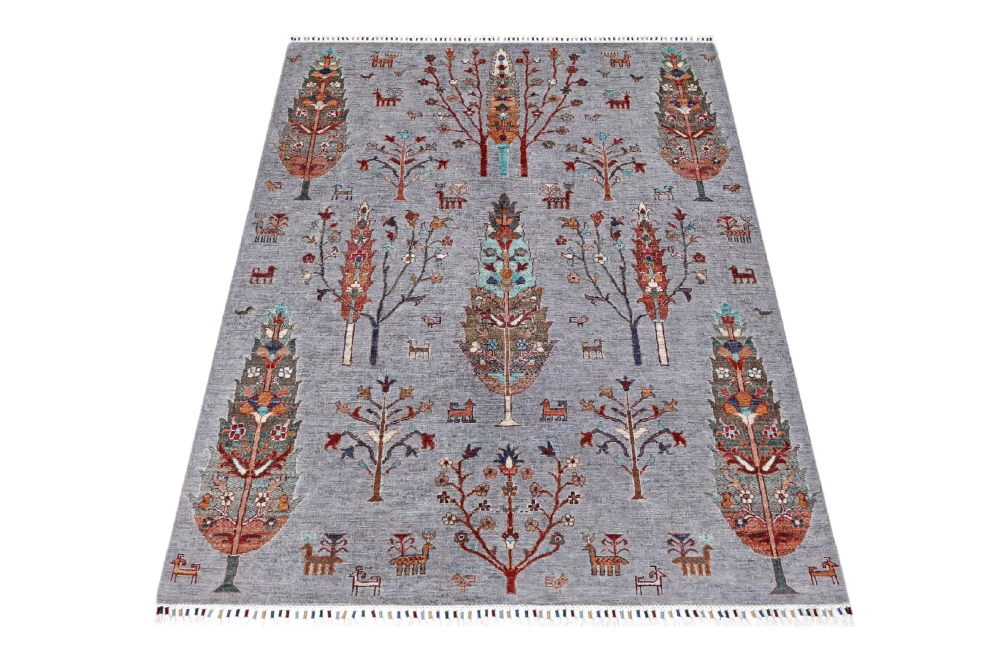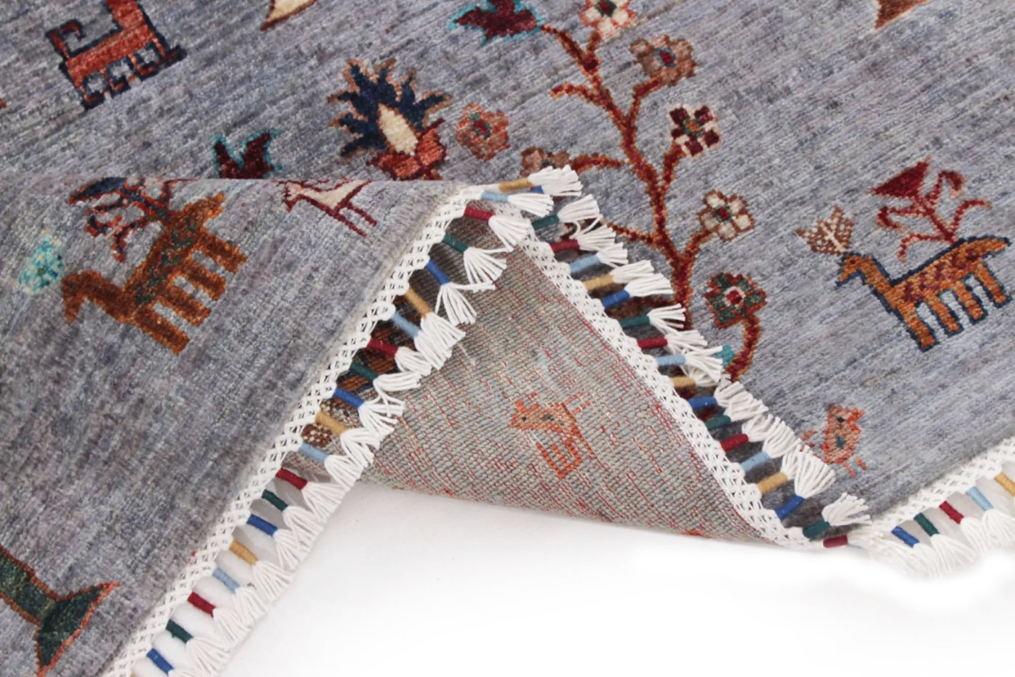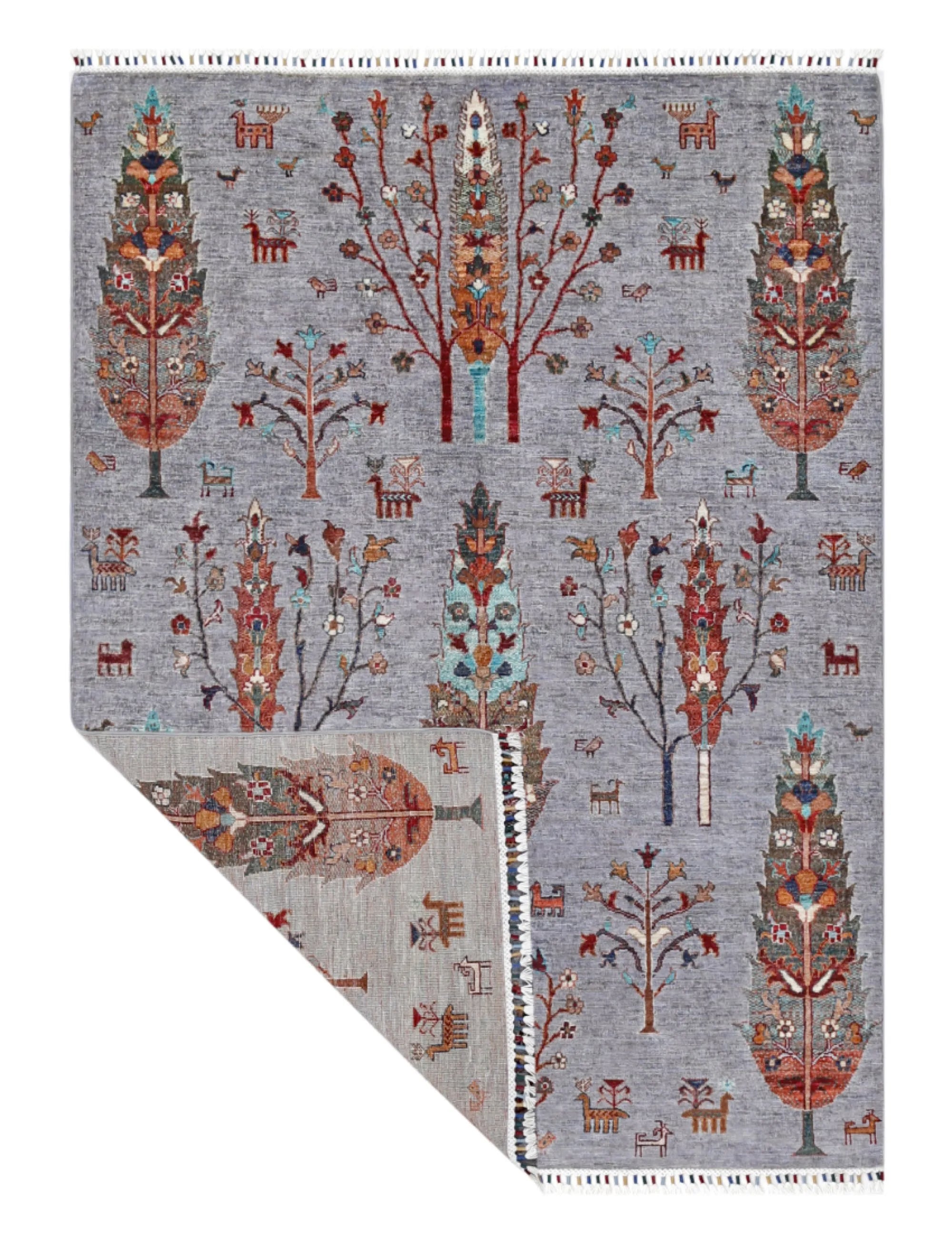 Gran is an exclusive, hand-knotted Khorjin-style rug from Afghanistan, featuring a design inspired by the organic patterns of pine wood grains. The bright, cheerful colors combined with the artistic composition make this rug ideal for anyone looking for a vibrant, modern and expressive interior piece. Made from 100% hand-spun wool and dyed entirely with natural vegetable dyes, this rug offers a warm, authentic look with a beautiful natural sheen. Every knot is tied by hand by skilled Afghan artisans, ensuring a dense, durable and long-lasting rug of superior quality. The Gran rug fits perfectly in modern and classic interiors alike and serves beautifully as a statement piece in living rooms, bedrooms or workspaces. A stunning blend of traditional craftsmanship and contemporary design — for those who want a rug that truly stands out.