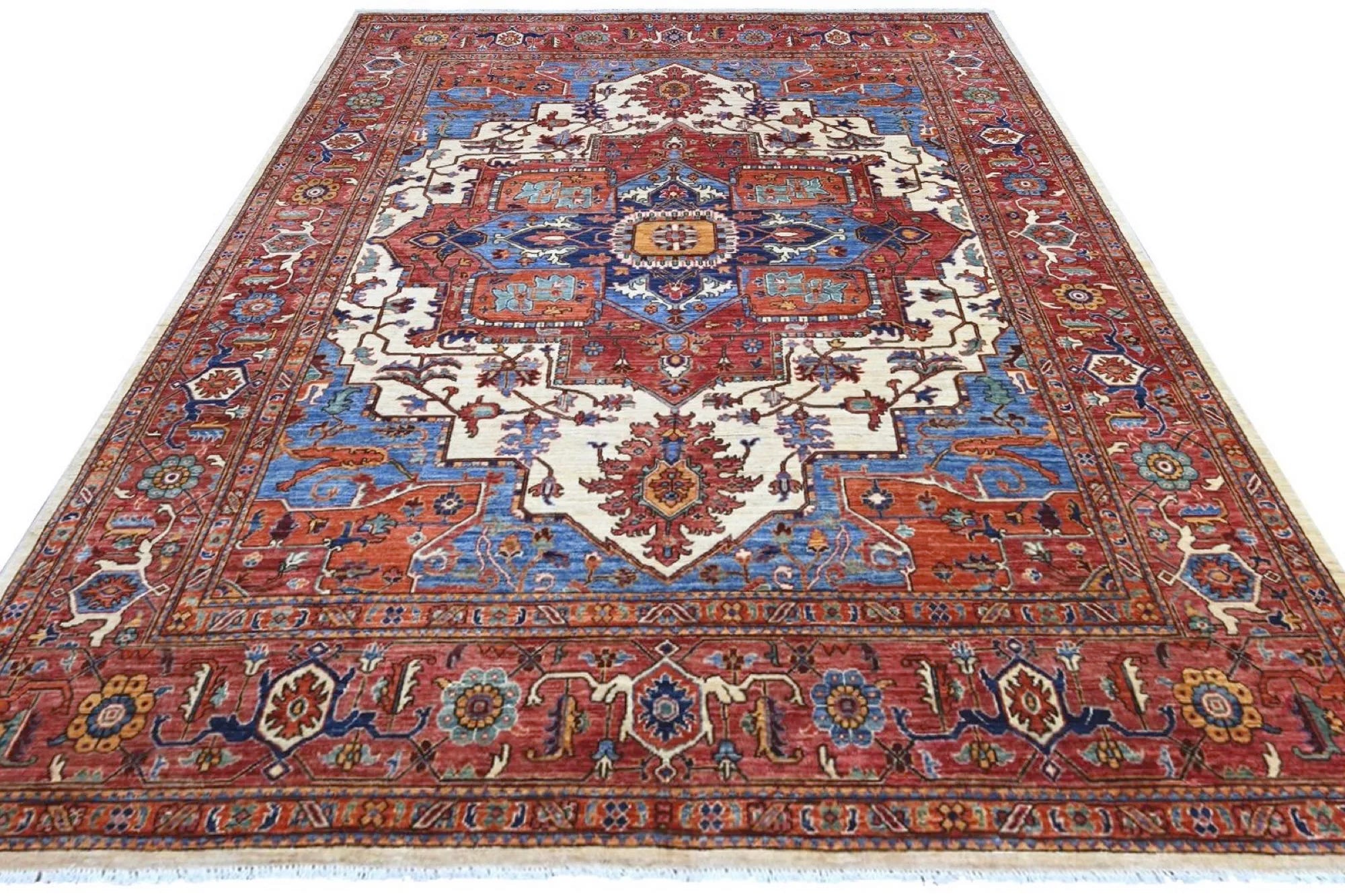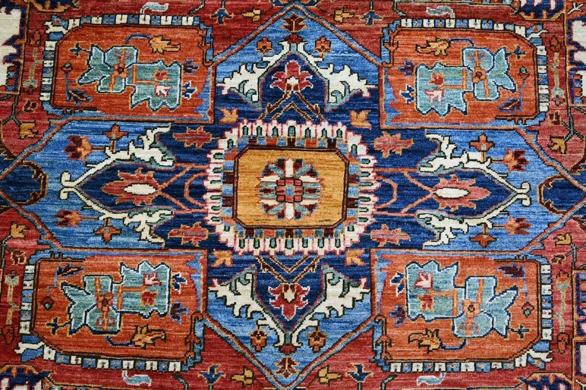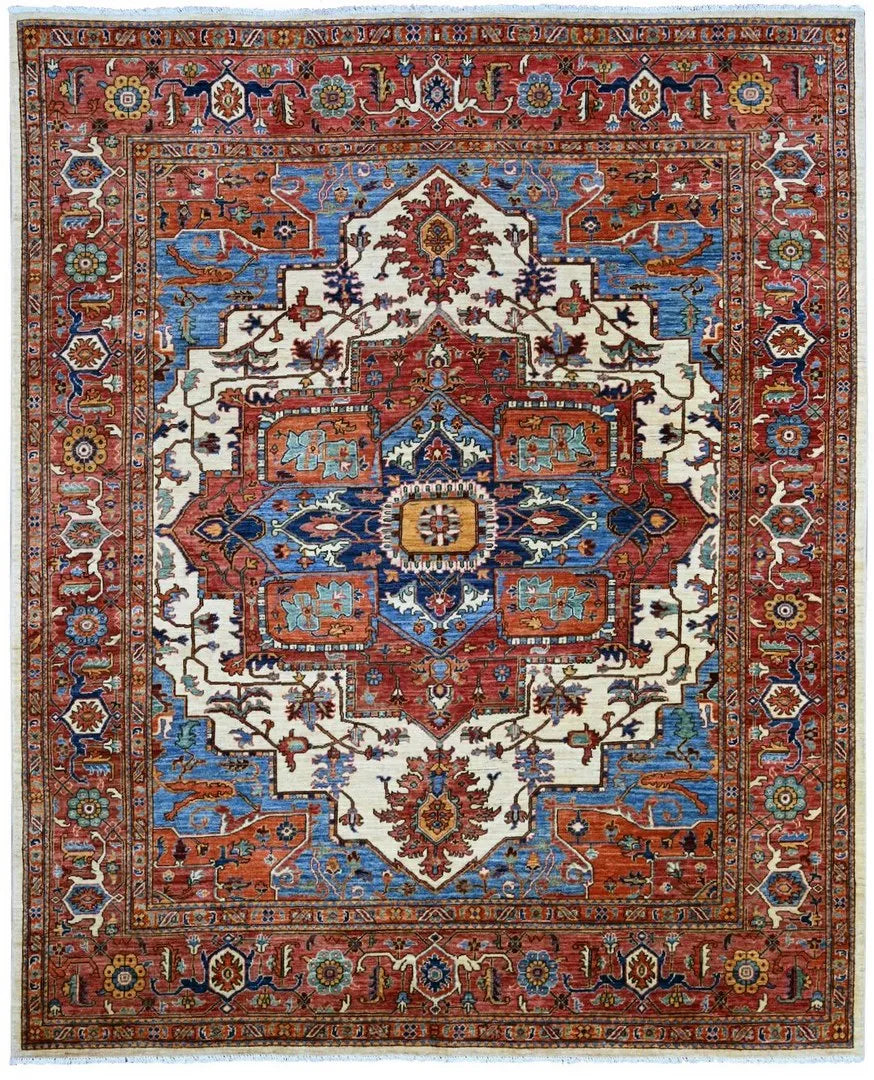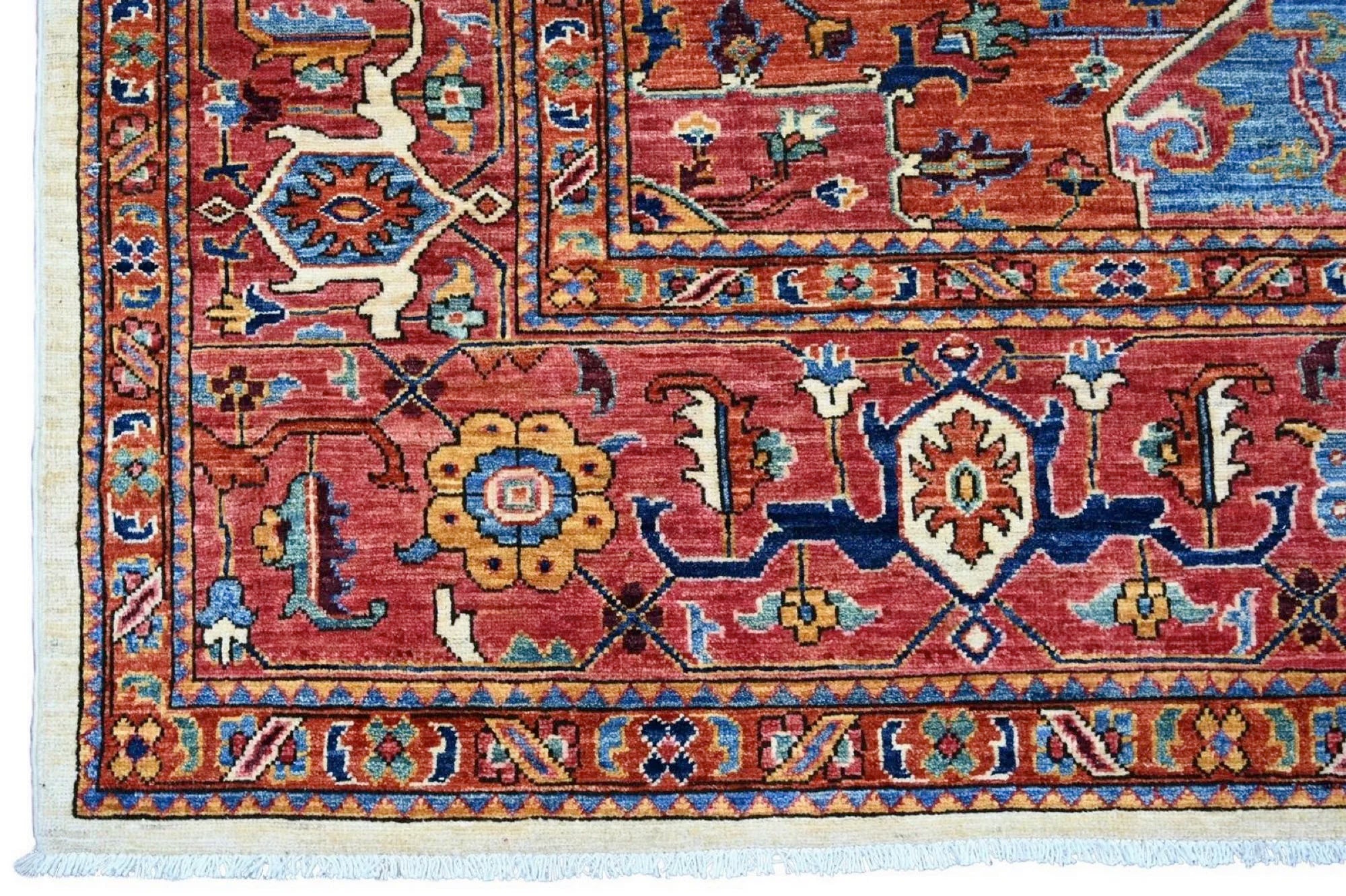This exclusive rug is inspired by traditional Persian Heriz patterns, reinterpreted in a more modern, softer style with brighter and more uplifting colors. Each piece is hand-knotted in Afghanistan using hand-spun wool and 100% natural vegetable dyes, giving the rug outstanding durability and a beautiful organic sheen. While classic Heriz rugs are known for bold geometric shapes and strong medallion designs, this modern interpretation features a calmer, more contemporary layout that blends effortlessly into both classic and modern interiors. If you're looking for a hand-knotted Heriz rug, a luxury oriental rug, or a rug dyed with authentic vegetable colors, this Afghan-knotted Heriz design is an exceptional choice- a refined artwork that elevates any space.