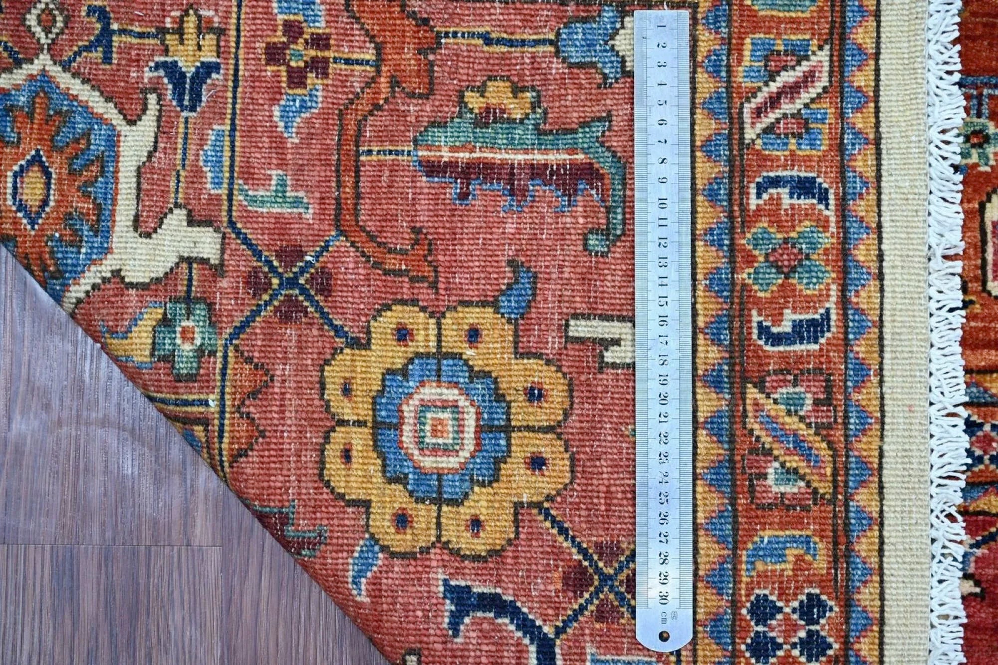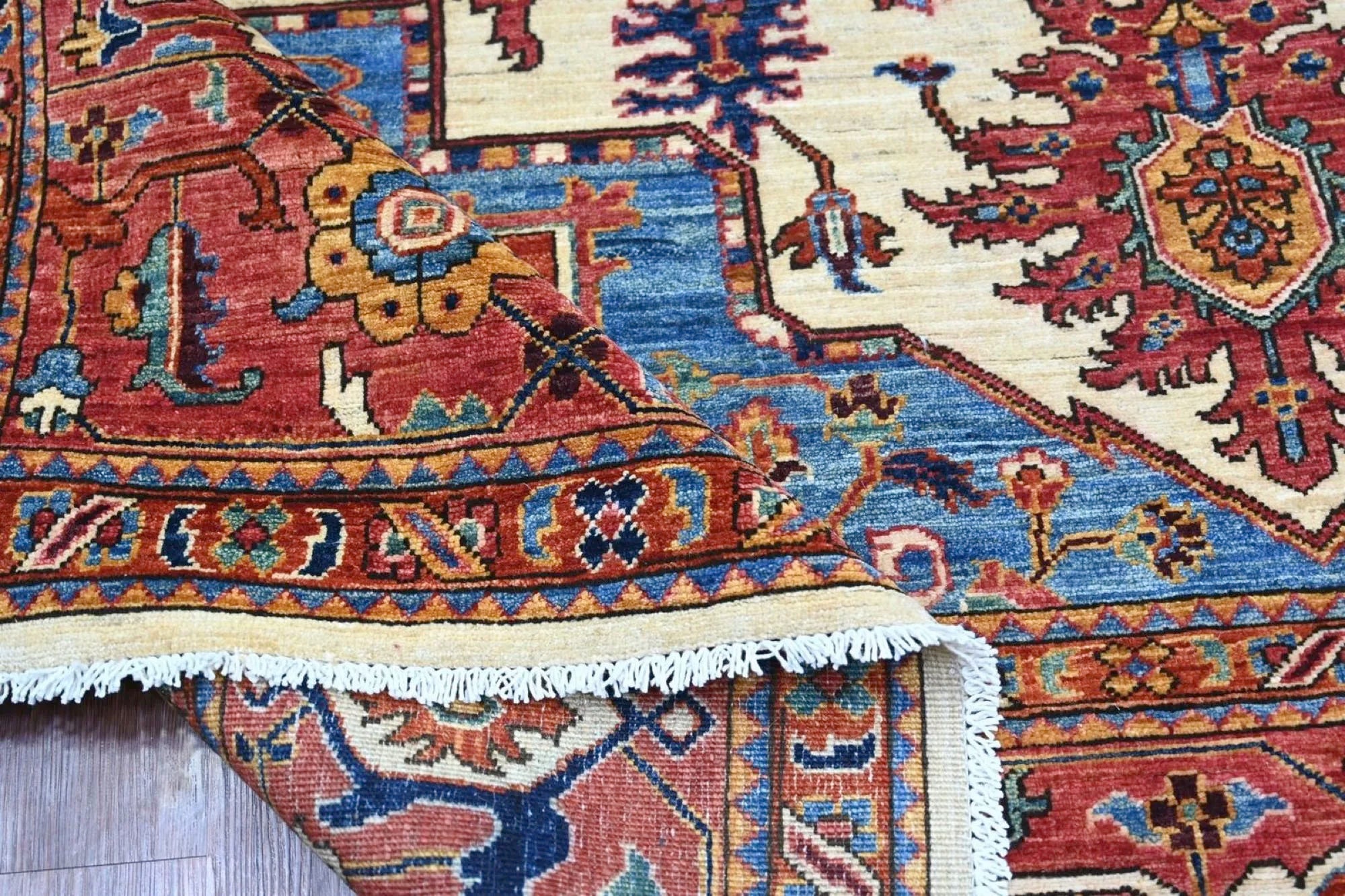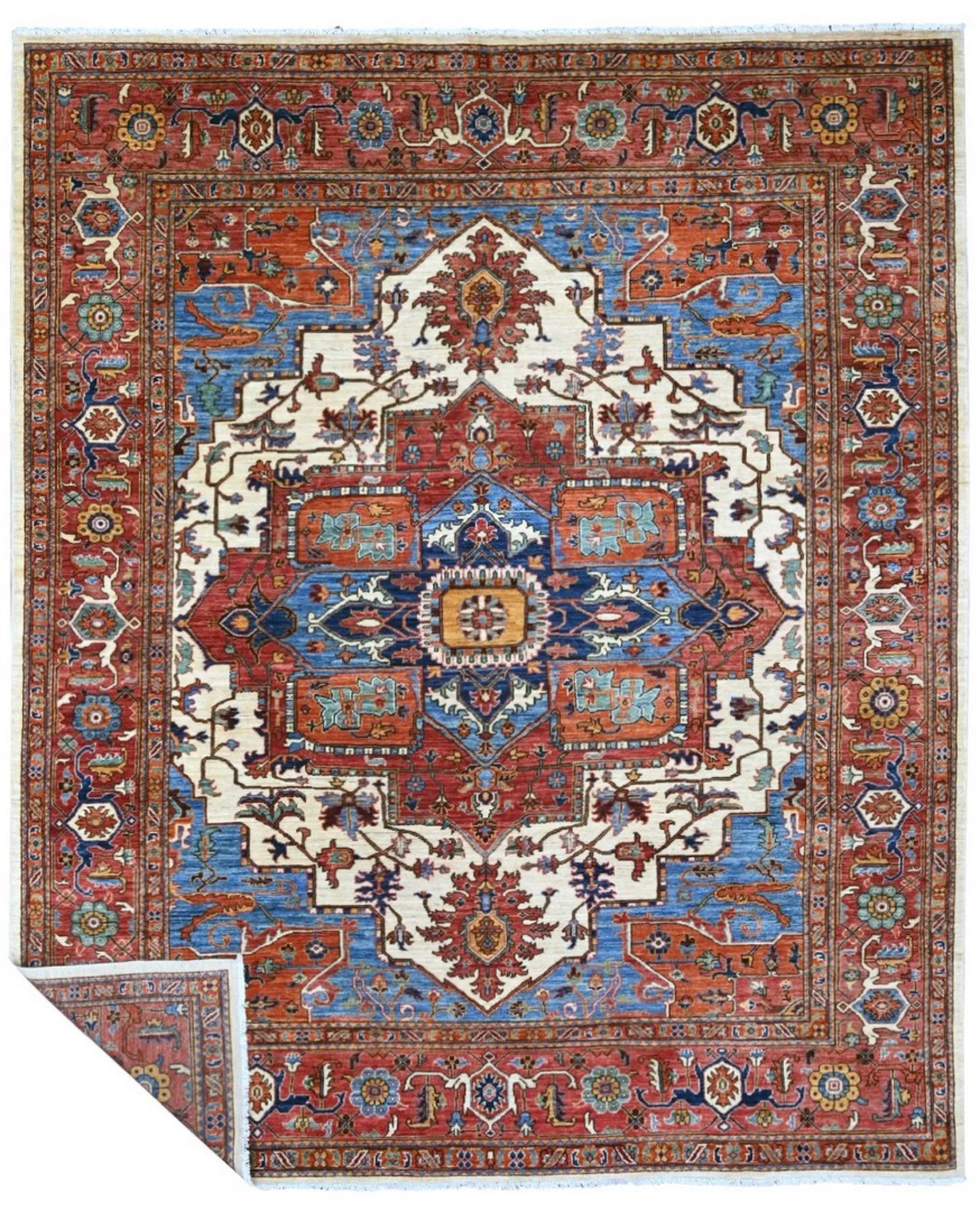 This exclusive rug is inspired by traditional Persian Heriz patterns, reinterpreted in a more modern, softer style with brighter and more uplifting colors. Each piece is hand-knotted in Afghanistan using hand-spun wool and 100% natural vegetable dyes, giving the rug outstanding durability and a beautiful organic sheen. While classic Heriz rugs are known for bold geometric shapes and strong medallion designs, this modern interpretation features a calmer, more contemporary layout that blends effortlessly into both classic and modern interiors. If you're looking for a hand-knotted Heriz rug, a luxury oriental rug, or a rug dyed with authentic vegetable colors, this Afghan-knotted Heriz design is an exceptional choice- a refined artwork that elevates any space.