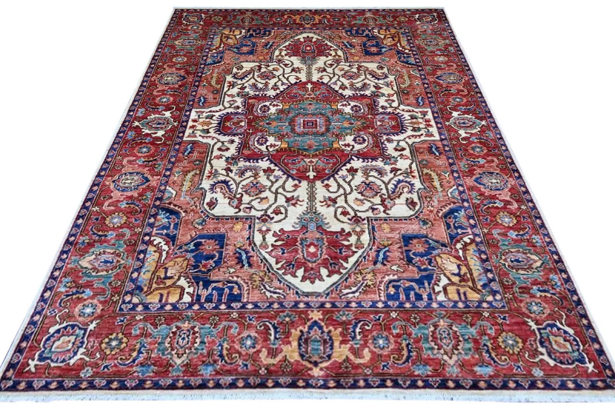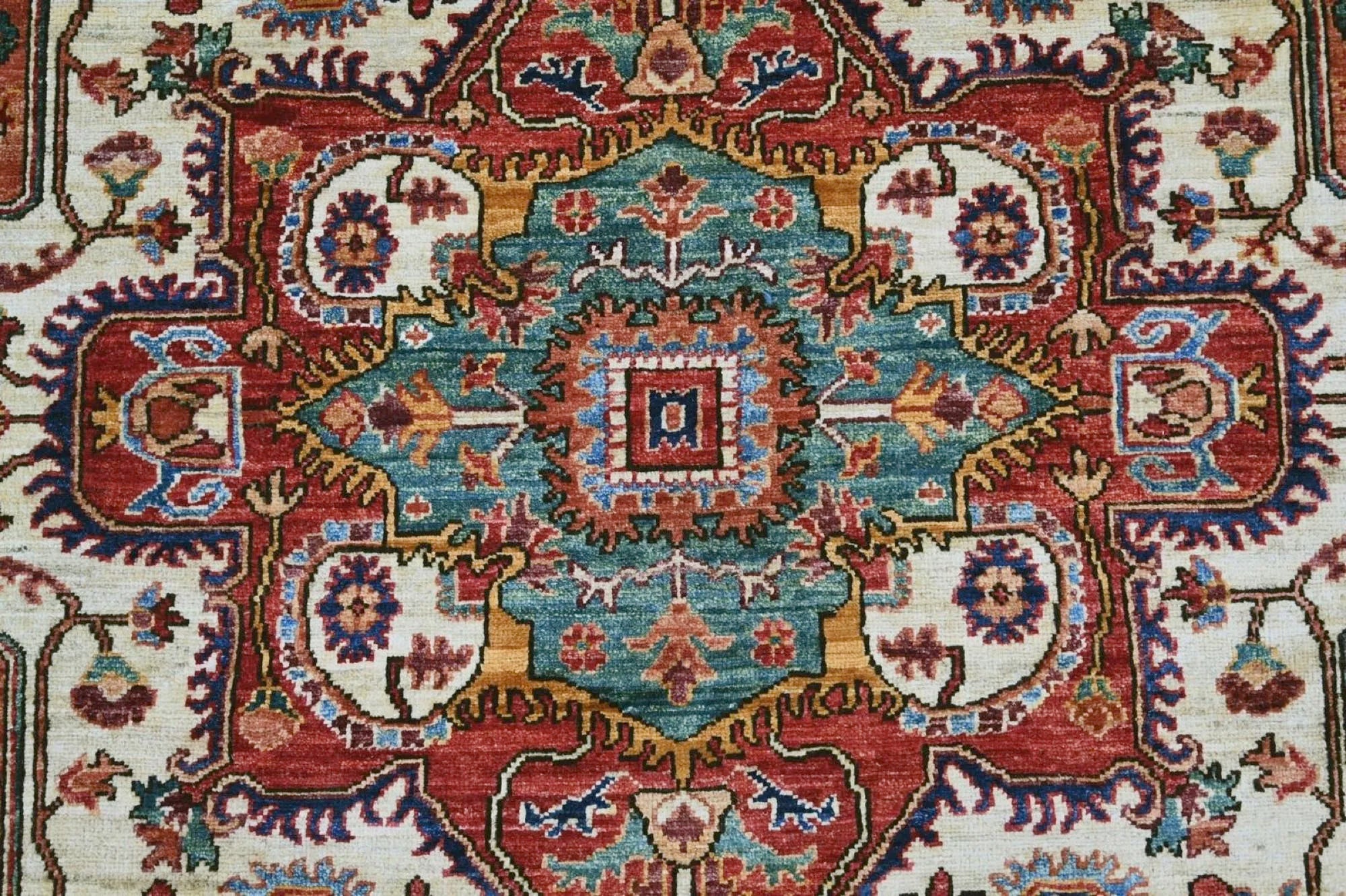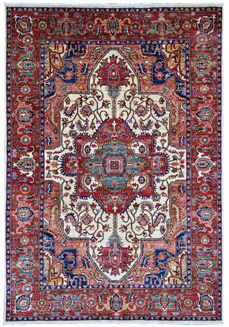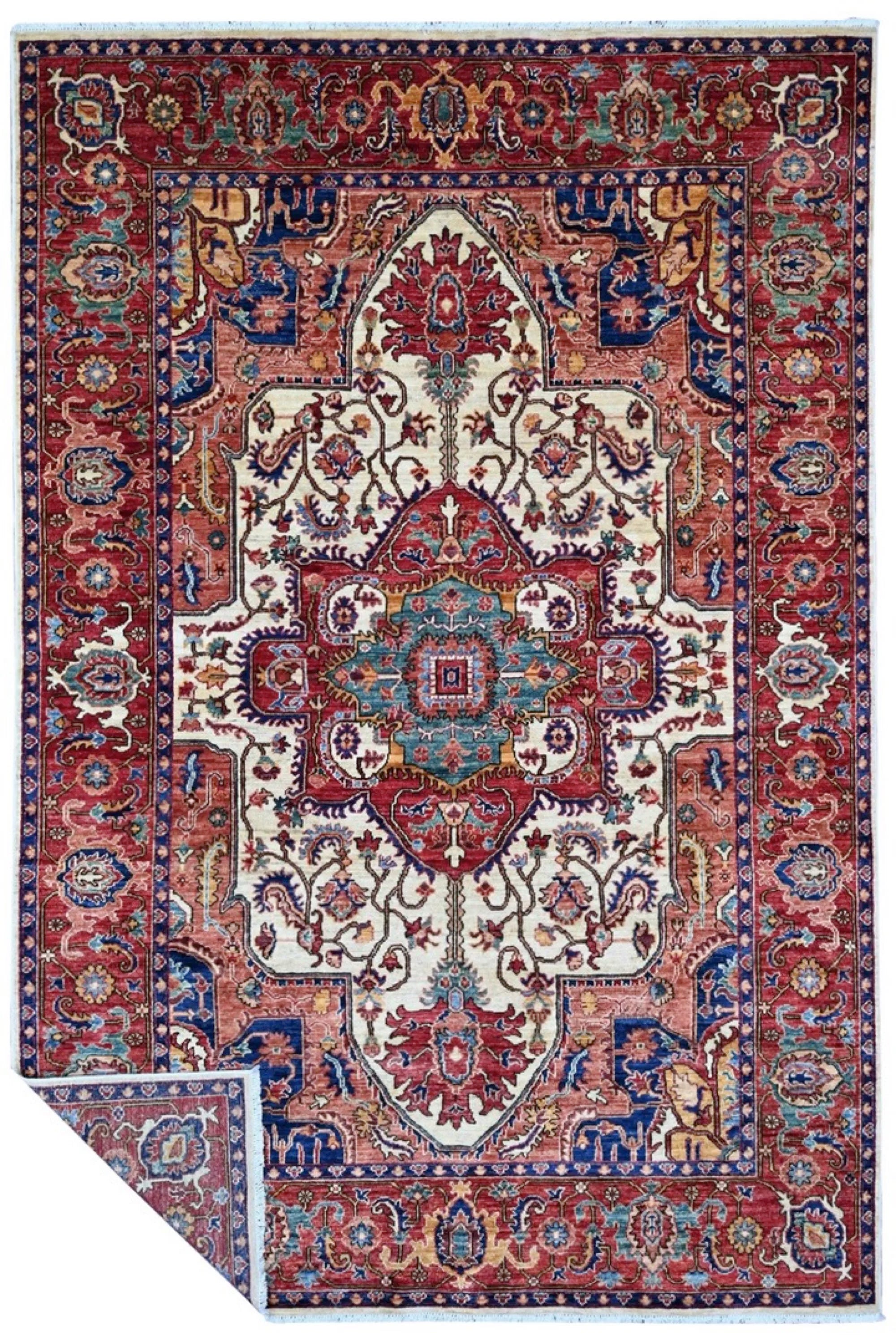 This exclusive rug is inspired by traditional Persian Heriz patterns, reinterpreted in a more modern, softer style with brighter and more uplifting colors. Each piece is hand-knotted in Afghanistan using hand-spun wool and 100% natural vegetable dyes, giving the rug outstanding durability and a beautiful organic sheen. While classic Heriz rugs are known for bold geometric shapes and strong medallion designs, this modern interpretation features a calmer, more contemporary layout that blends effortlessly into both classic and modern interiors. If you're looking for a hand-knotted Heriz rug, a luxury oriental rug, or a rug dyed with authentic vegetable colors, this Afghan-knotted Heriz design is an exceptional choice- a refined artwork that elevates any space.