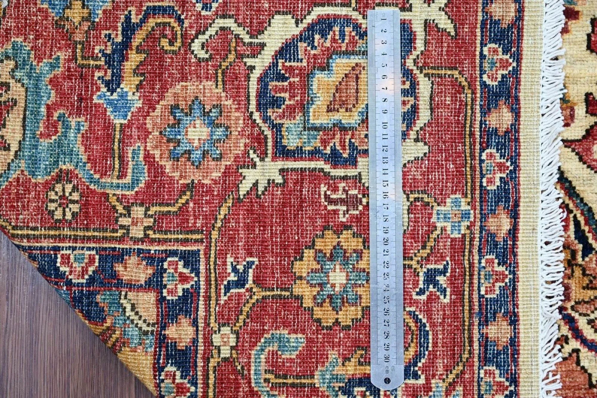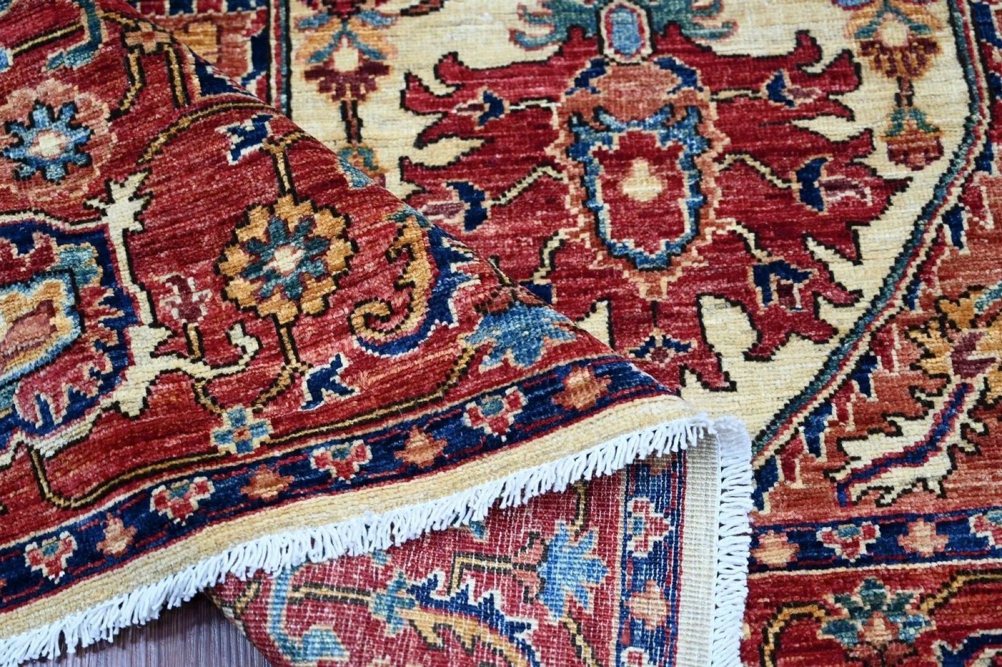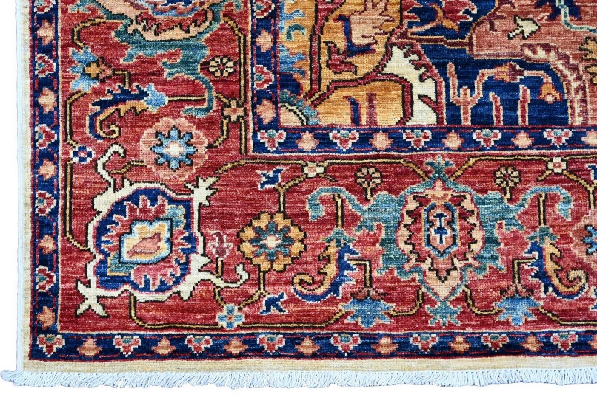 This exclusive rug is inspired by traditional Persian Heriz patterns, reinterpreted in a more modern, softer style with brighter and more uplifting colors. Each piece is hand-knotted in Afghanistan using hand-spun wool and 100% natural vegetable dyes, giving the rug outstanding durability and a beautiful organic sheen. While classic Heriz rugs are known for bold geometric shapes and strong medallion designs, this modern interpretation features a calmer, more contemporary layout that blends effortlessly into both classic and modern interiors. If you're looking for a hand-knotted Heriz rug, a luxury oriental rug, or a rug dyed with authentic vegetable colors, this Afghan-knotted Heriz design is an exceptional choice- a refined artwork that elevates any space.