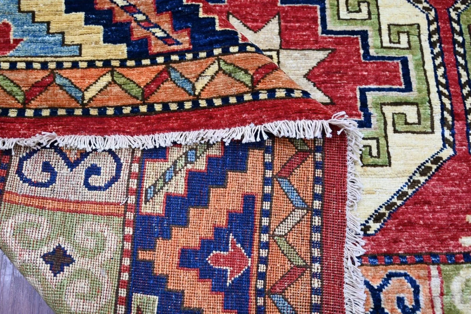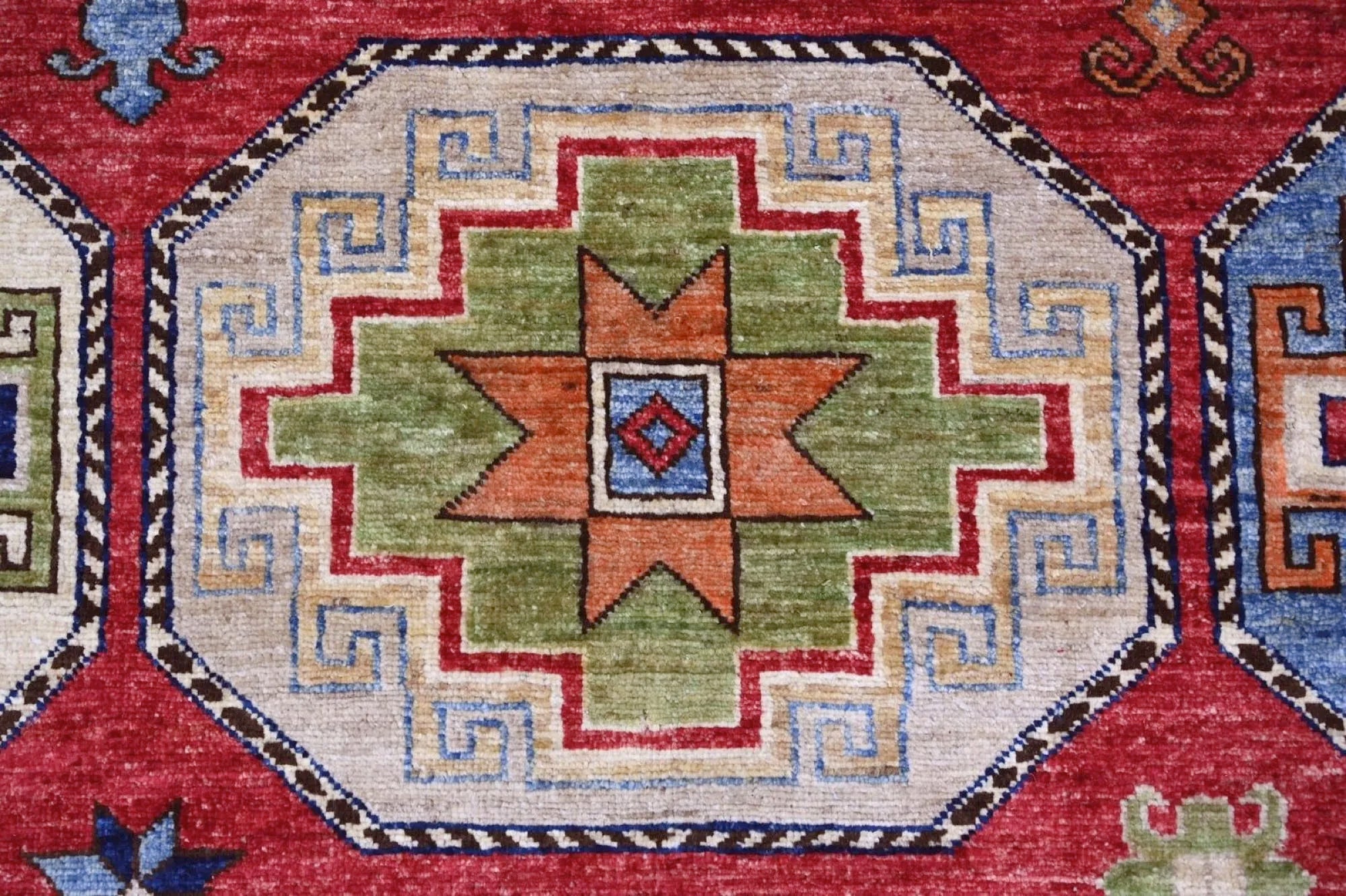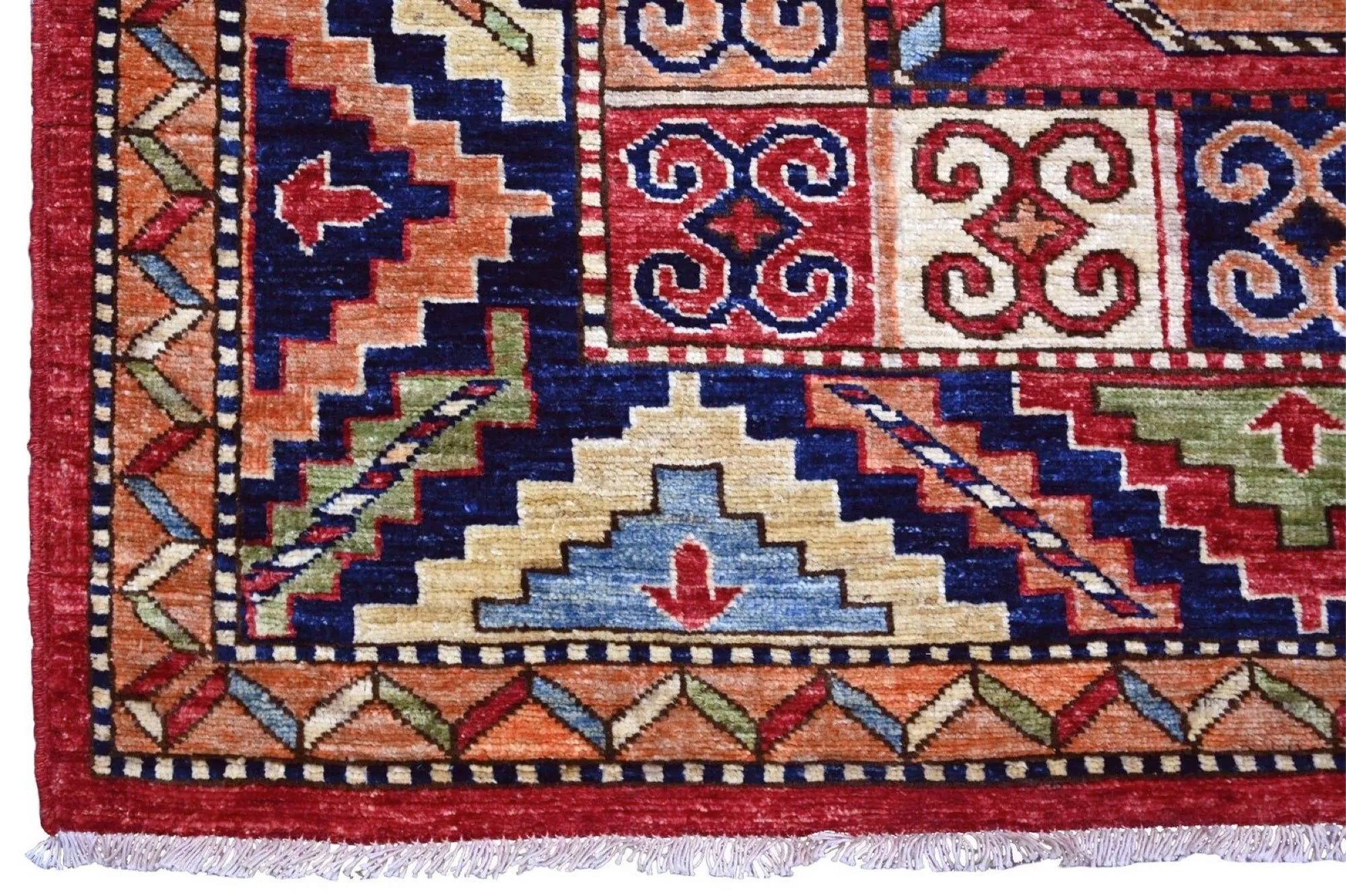 Kazak rugs from Afghanistan are well-known and appreciated for their rich history, unique design, and high quality. They are a part of Afghanistan's rich te x tile tradition and hold a special place in the hearts of rug enthusiasts worldwide. Kazak rugs (or Qazak) have their origins in the Caucasus region, but they are also popular and made in Afghanistan. Originally from the Caucasus regions, they have influenced and become a significant part of the rug-weaving tradition in Afghanistan. These rugs have a long history spanning centuries. Traditionally made by nomadic tribes and village communities, they carry a rich cultural heritage and unique stories. Kazak rugs are known for their geometric patterns and bold design, often featuring large medallions in the center, repeated smaller geometric shapes, and sometimes stylized flowers and animals. The patterns can range from simple to very comple x and detailed. Typical colors include deep reds, blues, and greens, often combined with white and gold accents. Many of the patterns and symbols on Kazak rugs have traditional and cultural meanings, often related to protection, strength, and luck. Thanks to the dense knotting and high-quality wool, Kazak rugs are e x tremely durable and can last for many years, even under heavy use. They are ideal for use in various rooms, from living rooms to bedrooms, and can also be used as wall hangings. Their timeless design makes them suitable for both traditional and modern interiors.
