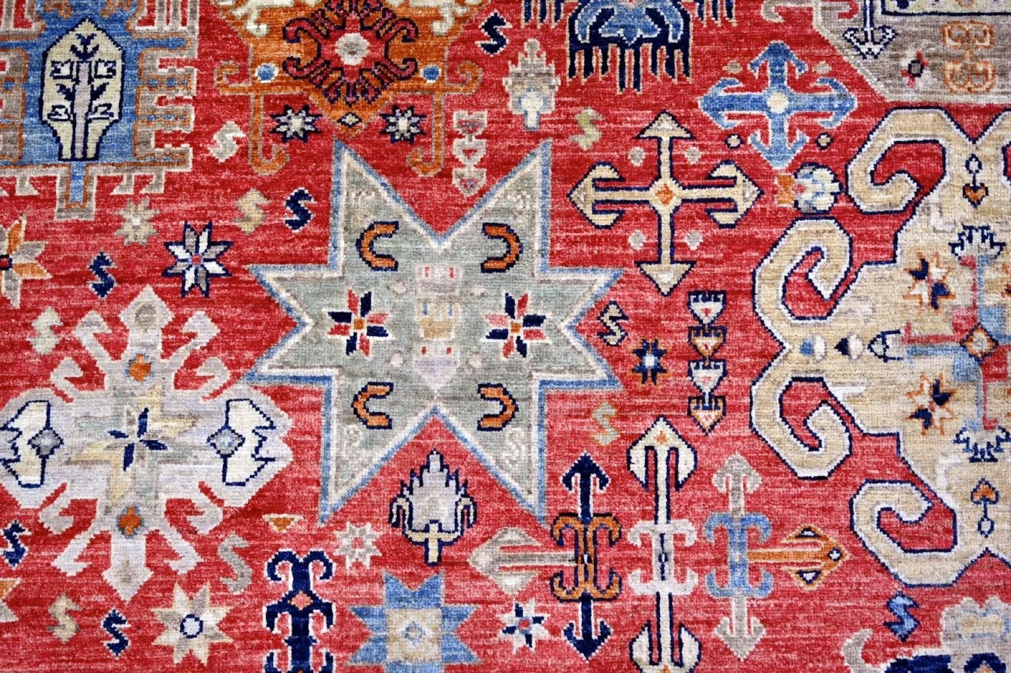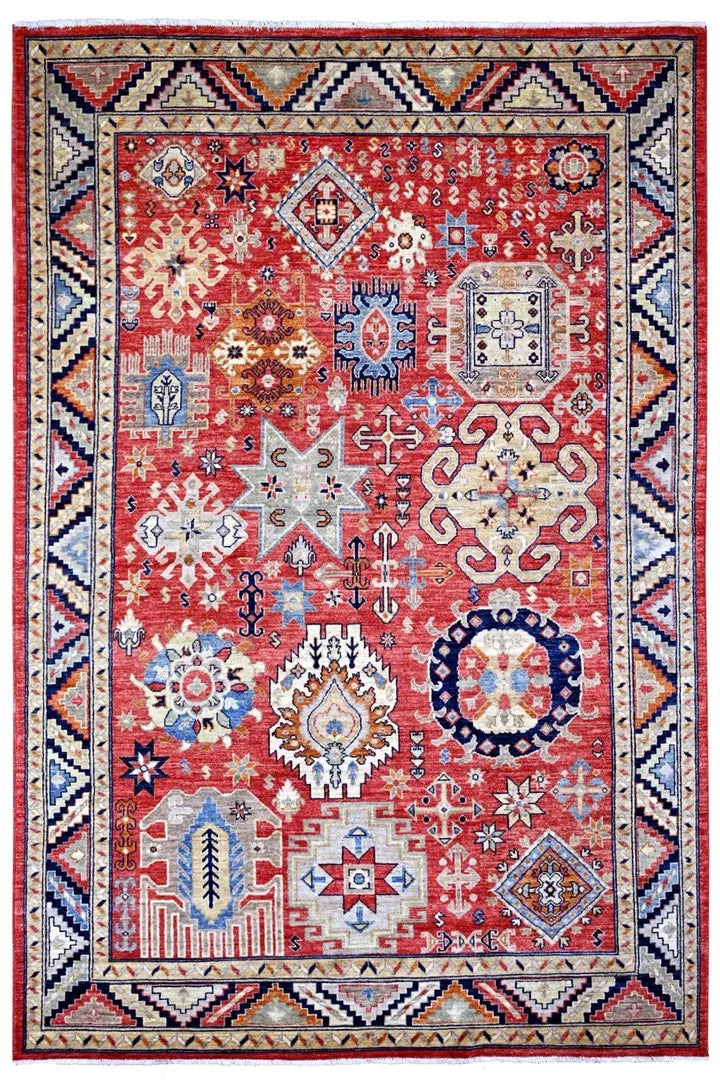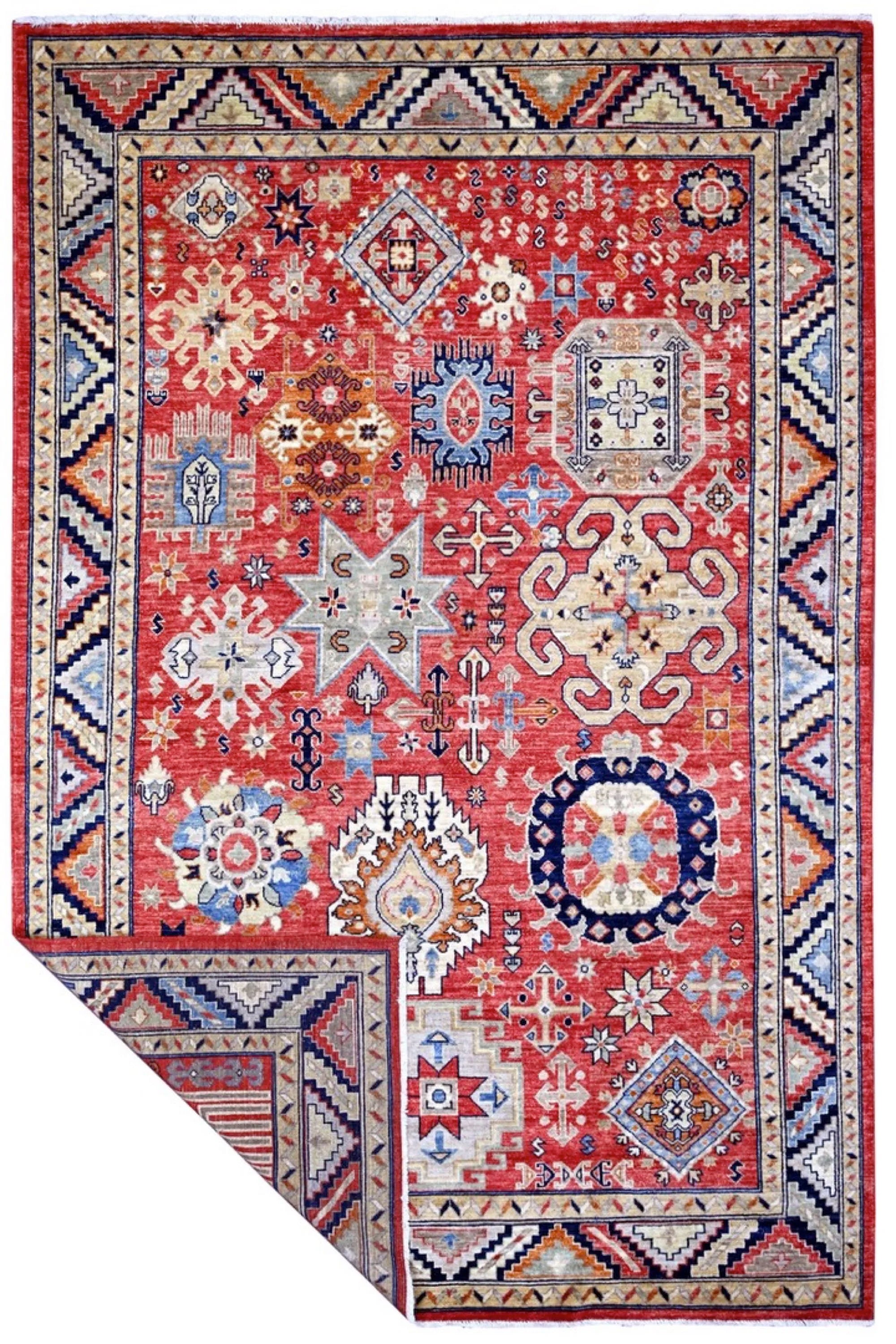 Kazak rugs from Afghanistan are well-known and appreciated for their rich history, unique design, and high quality. They are a part of Afghanistan's rich te x tile tradition and hold a special place in the hearts of rug enthusiasts worldwide. Kazak rugs (or Qazak) have their origins in the Caucasus region, but they are also popular and made in Afghanistan. Originally from the Caucasus regions, they have influenced and become a significant part of the rug-weaving tradition in Afghanistan. These rugs have a long history spanning centuries. Traditionally made by nomadic tribes and village communities, they carry a rich cultural heritage and unique stories. Kazak rugs are known for their geometric patterns and bold design, often featuring large medallions in the center, repeated smaller geometric shapes, and sometimes stylized flowers and animals. The patterns can range from simple to very comple x and detailed. Typical colors include deep reds, blues, and greens, often combined with white and gold accents. Many of the patterns and symbols on Kazak rugs have traditional and cultural meanings, often related to protection, strength, and luck. Thanks to the dense knotting and high-quality wool, Kazak rugs are e x tremely durable and can last for many years, even under heavy use. They are ideal for use in various rooms, from living rooms to bedrooms, and can also be used as wall hangings. Their timeless design makes them suitable for both traditional and modern interiors.