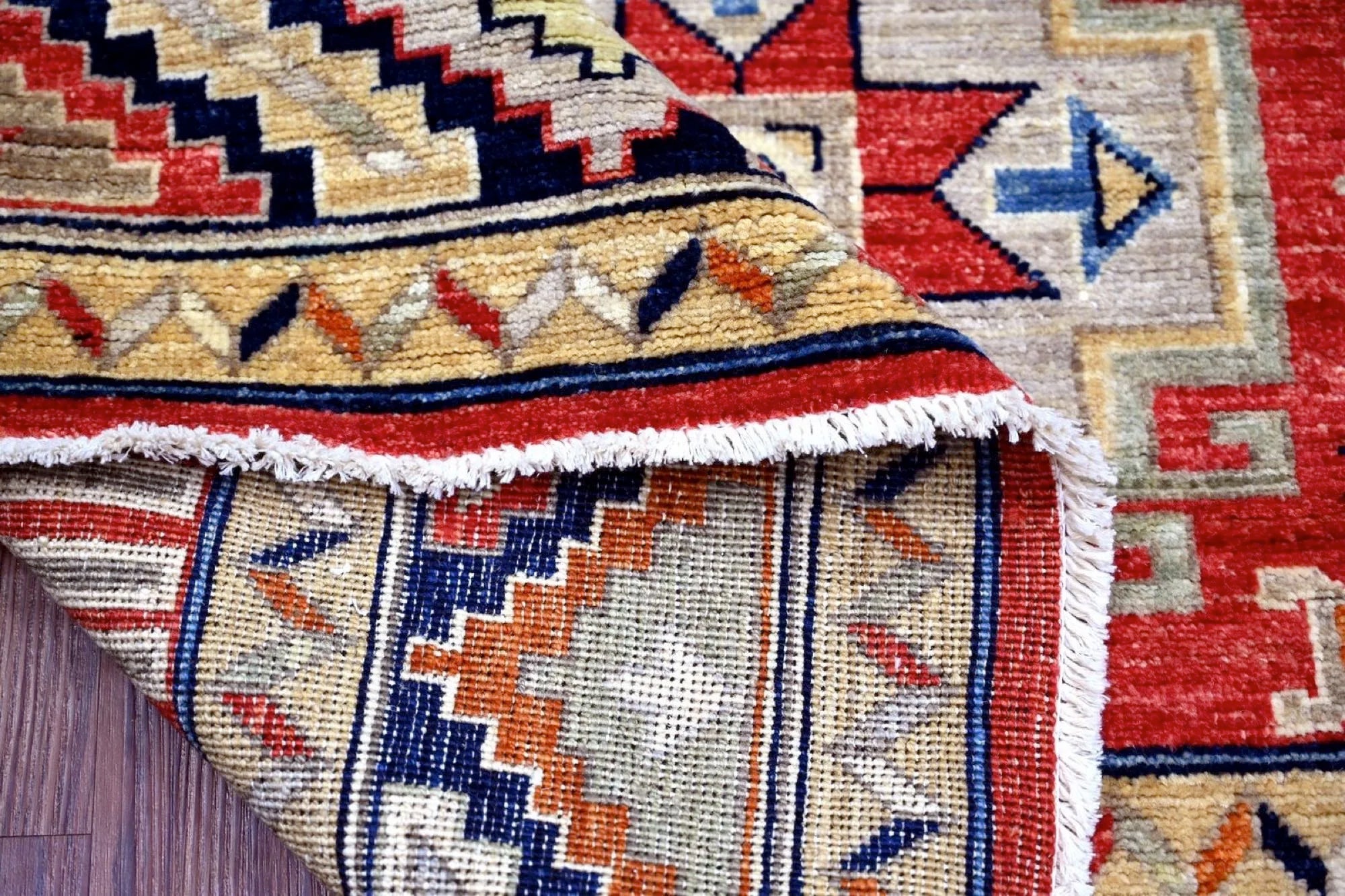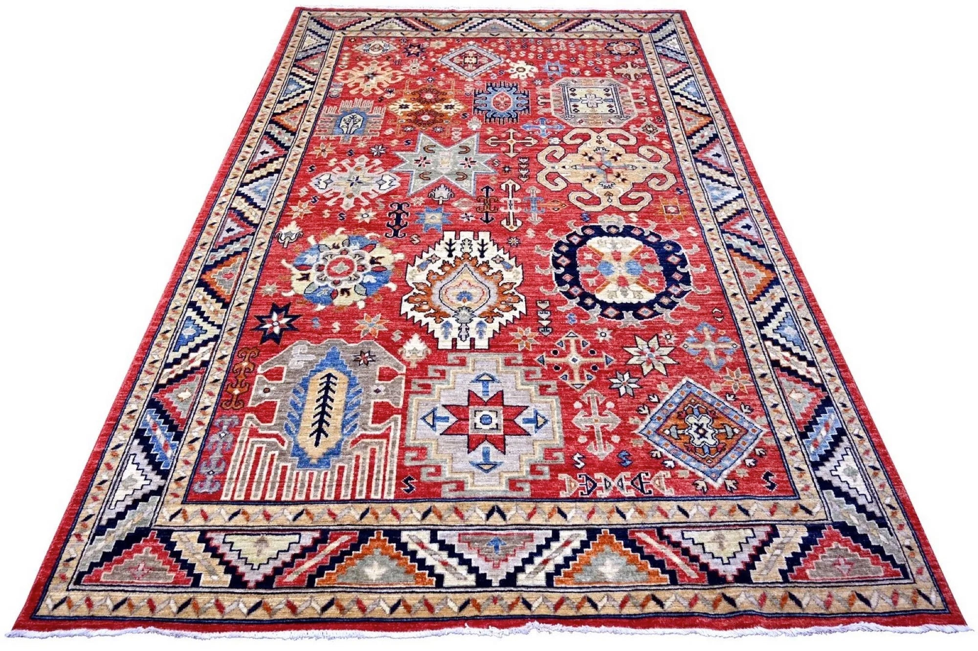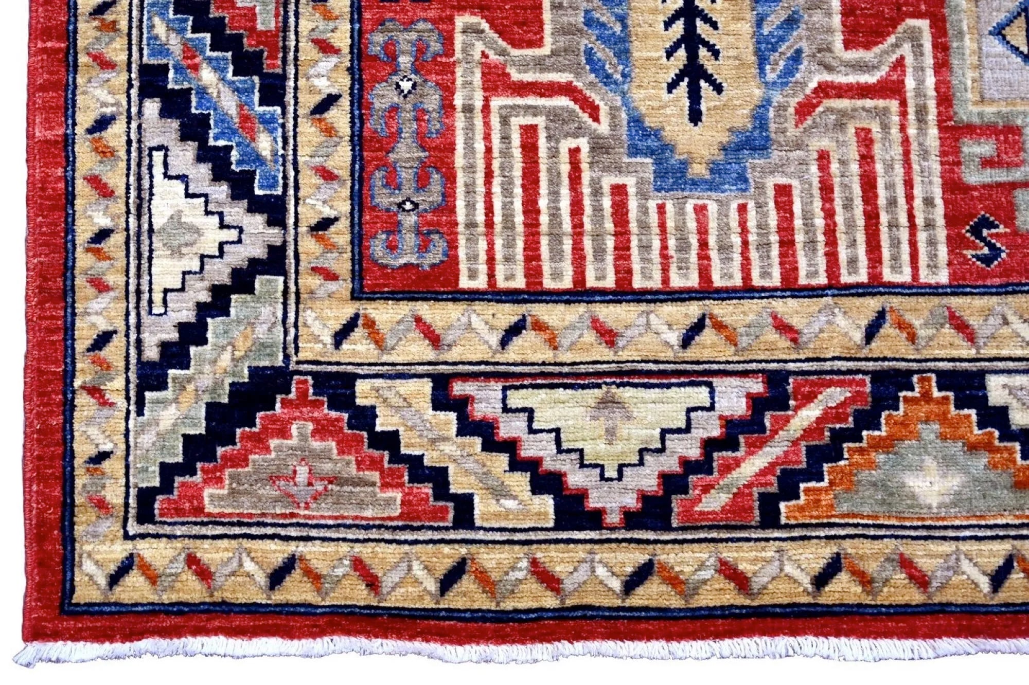 Kazak rugs from Afghanistan are well-known and appreciated for their rich history, unique design, and high quality. They are a part of Afghanistan's rich te x tile tradition and hold a special place in the hearts of rug enthusiasts worldwide. Kazak rugs (or Qazak) have their origins in the Caucasus region, but they are also popular and made in Afghanistan. Originally from the Caucasus regions, they have influenced and become a significant part of the rug-weaving tradition in Afghanistan. These rugs have a long history spanning centuries. Traditionally made by nomadic tribes and village communities, they carry a rich cultural heritage and unique stories. Kazak rugs are known for their geometric patterns and bold design, often featuring large medallions in the center, repeated smaller geometric shapes, and sometimes stylized flowers and animals. The patterns can range from simple to very comple x and detailed. Typical colors include deep reds, blues, and greens, often combined with white and gold accents. Many of the patterns and symbols on Kazak rugs have traditional and cultural meanings, often related to protection, strength, and luck. Thanks to the dense knotting and high-quality wool, Kazak rugs are e x tremely durable and can last for many years, even under heavy use. They are ideal for use in various rooms, from living rooms to bedrooms, and can also be used as wall hangings. Their timeless design makes them suitable for both traditional and modern interiors.