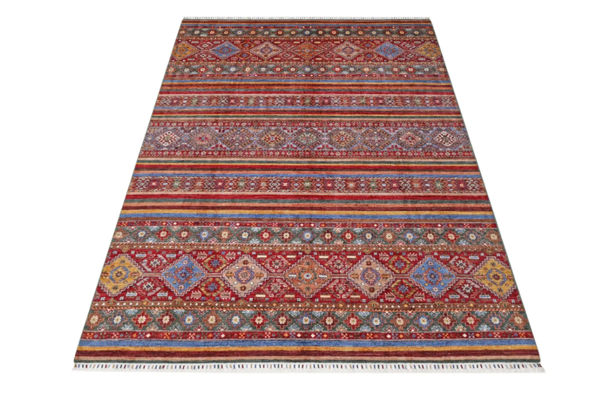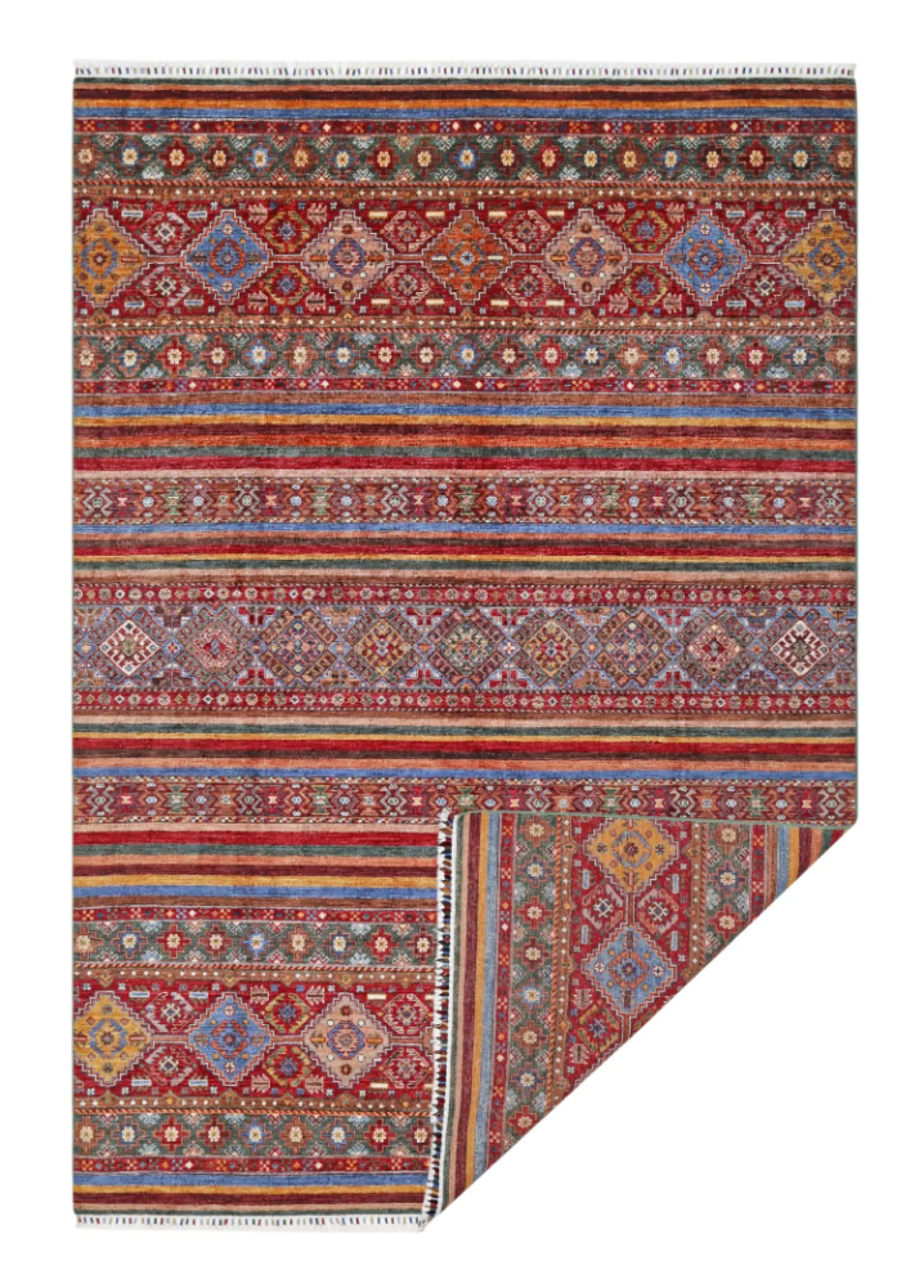 Khorjin rugs from Afghanistan are a type of traditional te x tile often used as bags or saddlebags by nomadic tribes in the region. These rugs are known for their practical uses and beautiful patterns. Originally created to be used as pack bags by nomadic people, Khorjin rugs are often designed with functionality in mind. The patterns on Khorjin rugs are often geometric and colorful, with symbolic motifs representing the tribe's culture and traditions. Common motifs include diamonds, rhombuses, and other geometric shapes, often in a rich color palette. Khorjin rugs are typically woven from wool, which makes them durable and tough enough for nomadic life. The colors in Khorjin rugs are usually natural, produced from plant dyes, giving them a warm and earthy color palette. Typical colors include red, blue, brown, and beige, but there may also be touches of green and yellow. Khorjin rugs are not just practical, but they are also artworks that tell stories about the tribe's life and culture. Each rug is unique and reflects the weaver's skill and creativity. High-quality materials and craftsmanship make Khorjin rugs long-lasting and valuable investments for customers.