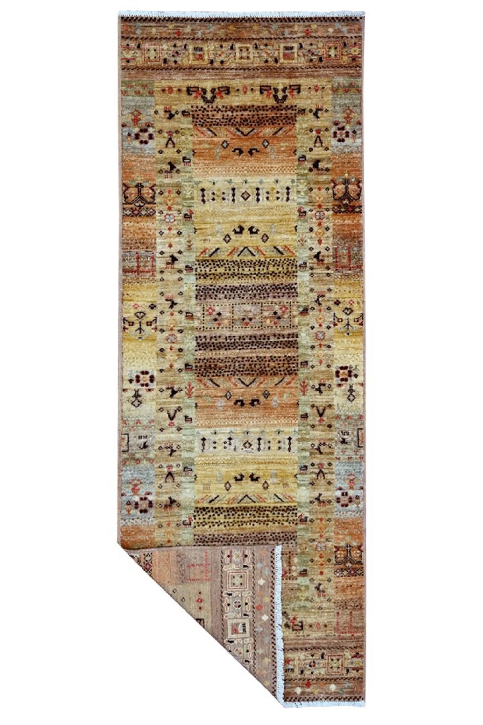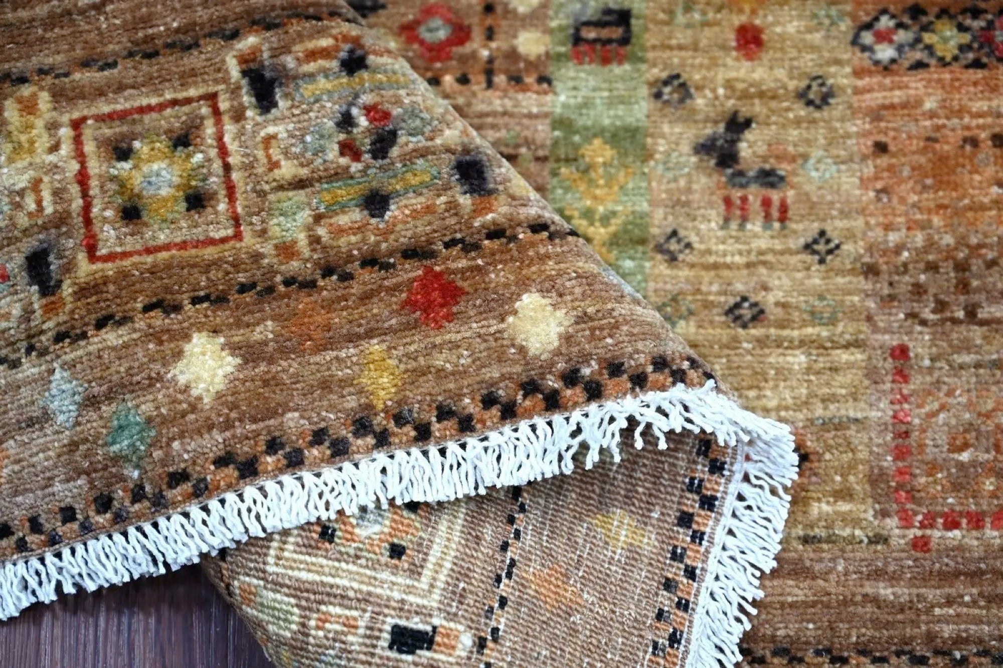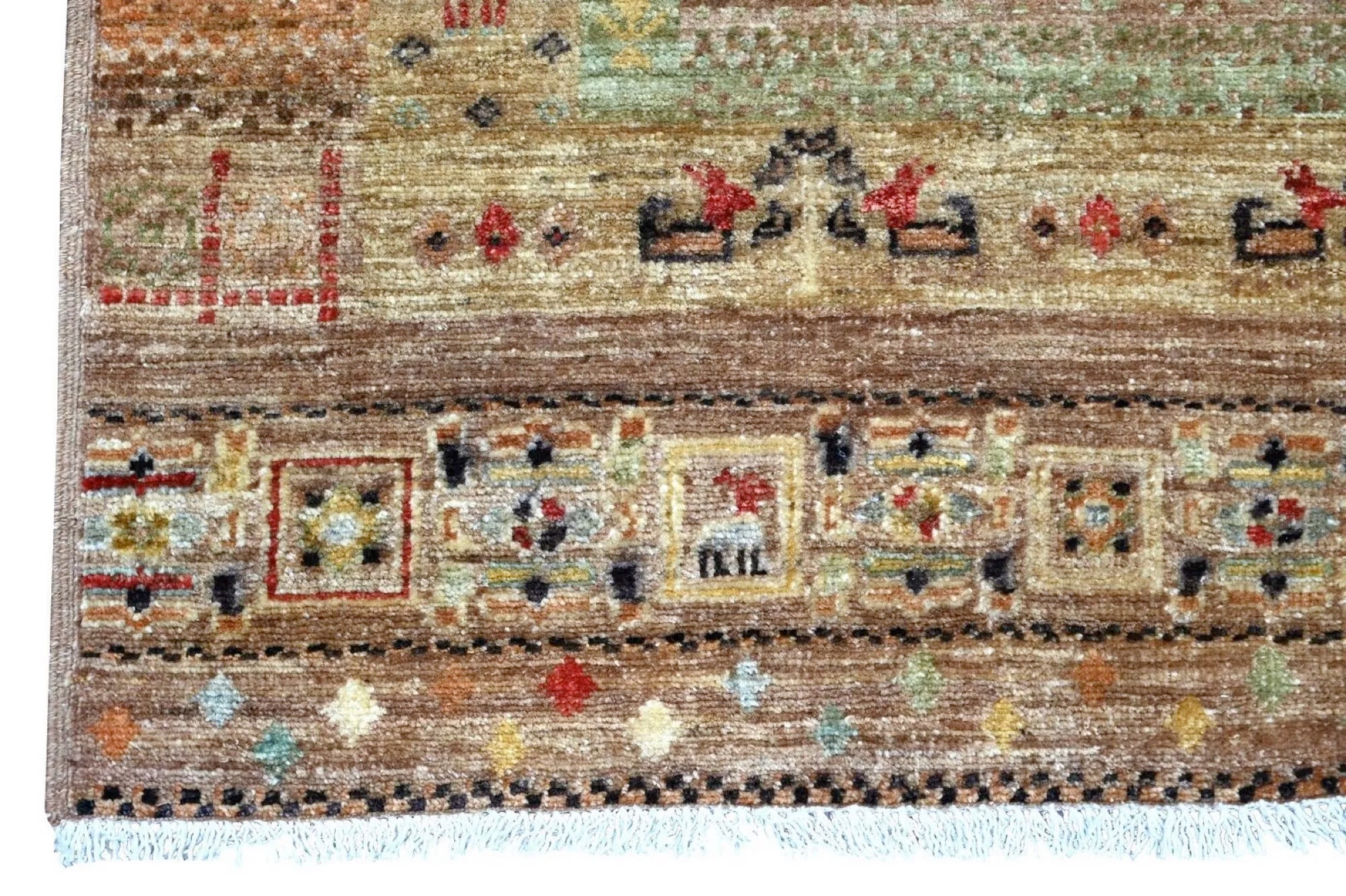 Khorjin rugs from Afghanistan are a type of traditional te x tile often used as bags or saddlebags by nomadic tribes in the region. These rugs are known for their practical uses and beautiful patterns. Originally created to be used as pack bags by nomadic people, Khorjin rugs are often designed with functionality in mind. The patterns on Khorjin rugs are often geometric and colorful, with symbolic motifs representing the tribe's culture and traditions. Common motifs include diamonds, rhombuses, and other geometric shapes, often in a rich color palette. Khorjin rugs are typically woven from wool, which makes them durable and tough enough for nomadic life. The colors in Khorjin rugs are usually natural, produced from plant dyes, giving them a warm and earthy color palette. Typical colors include red, blue, brown, and beige, but there may also be touches of green and yellow. Khorjin rugs are not just practical, but they are also artworks that tell stories about the tribe's life and culture. Each rug is unique and reflects the weaver's skill and creativity. High-quality materials and craftsmanship make Khorjin rugs long-lasting and valuable investments for customers.