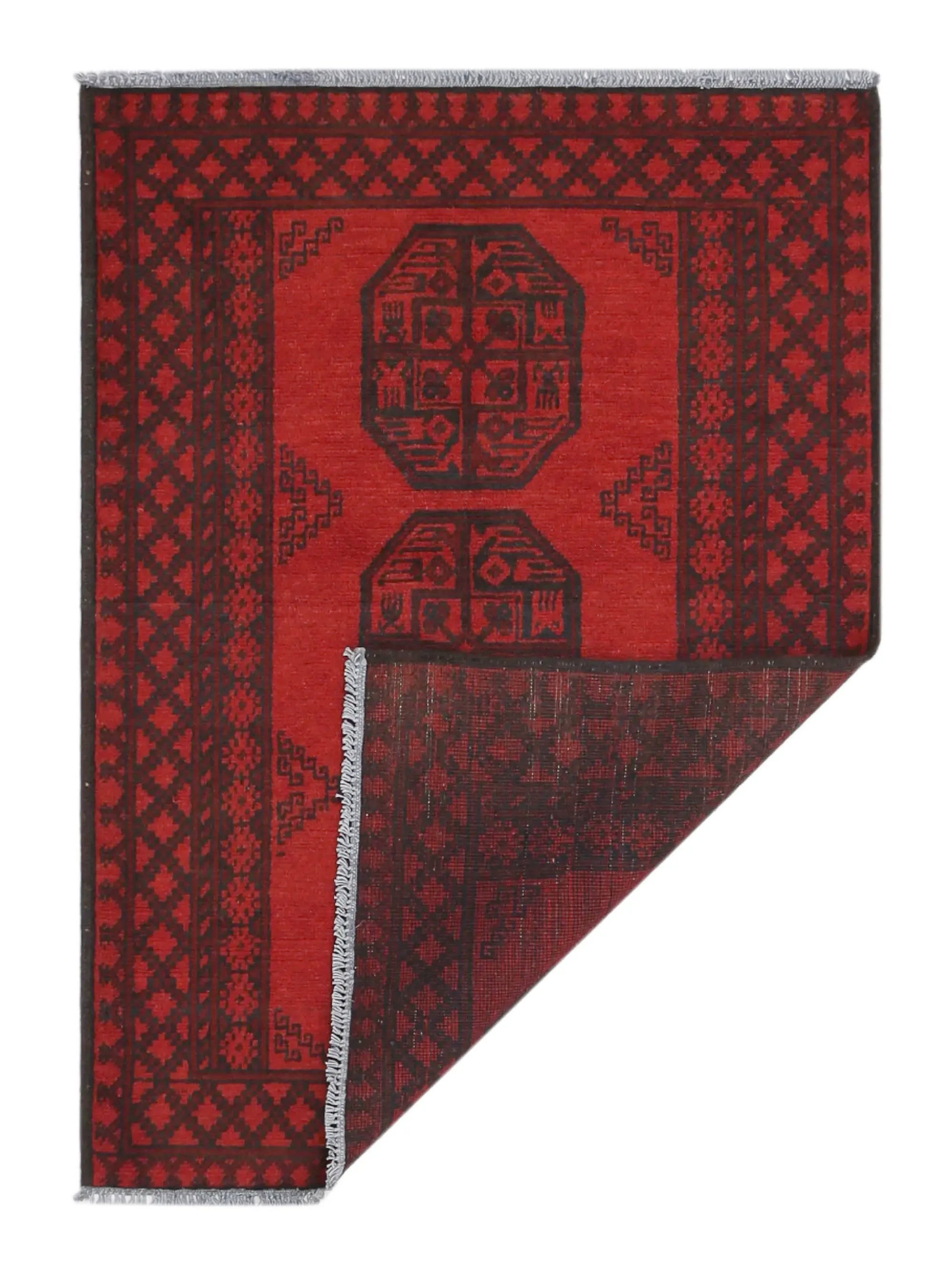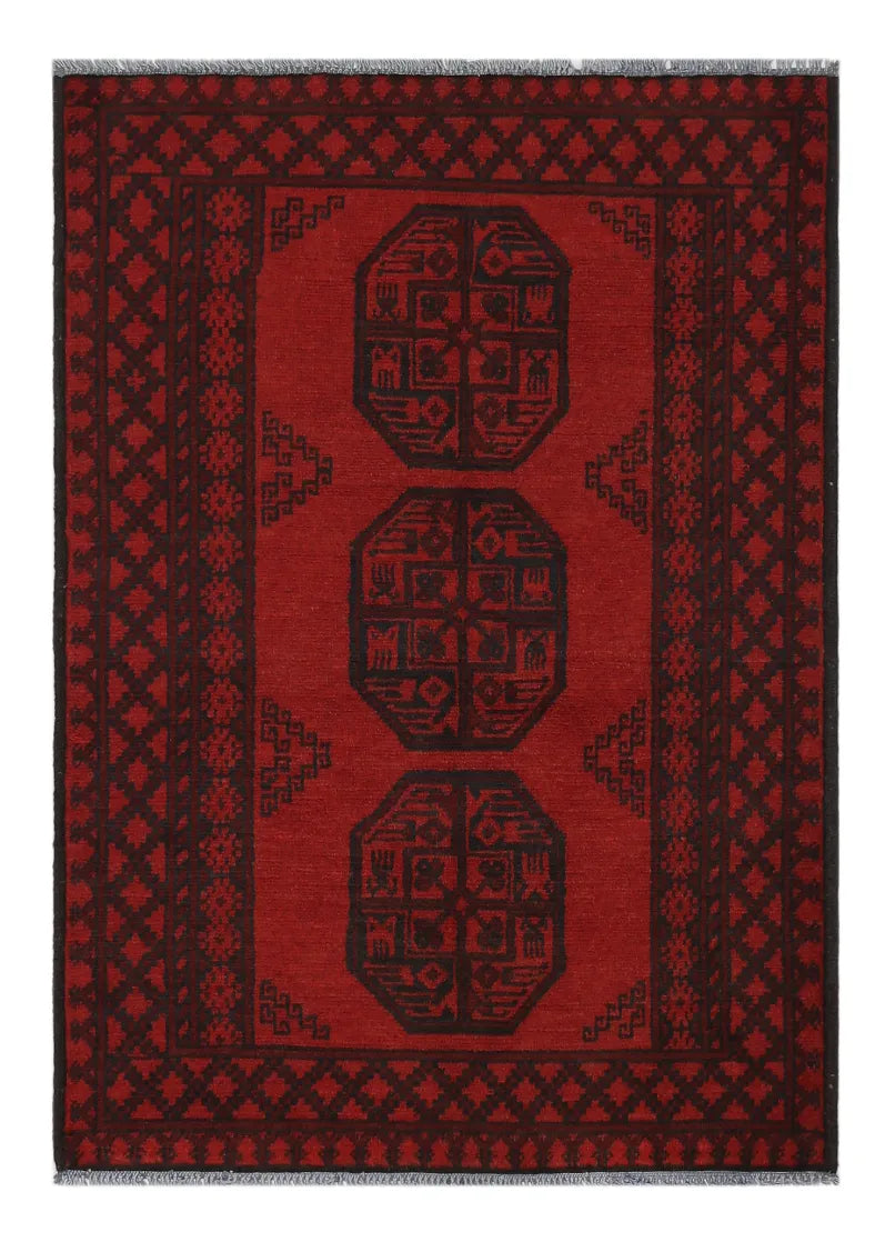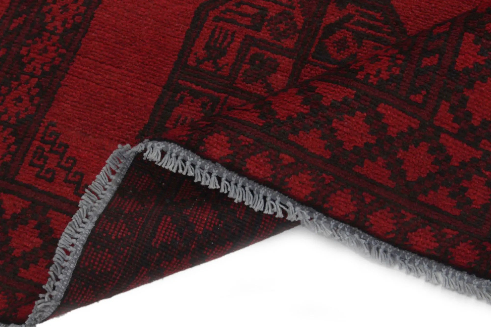 Discover this exquisite hand-knotted Akche rug from Afghanistan, crafted in rich, deep red and black tones that bring warmth and elegance to any interior. Made from 100% pure wool, including the fringes, it contains no synthetic materials, giving it a naturally soft, durable, and authentic feel. The traditional “elephant foot” motif, characteristic of Akche rugs, adds a timeless and culturally rich expression. A perfect choice for anyone seeking a rug that unites craftsmanship, character, and classic oriental beauty.