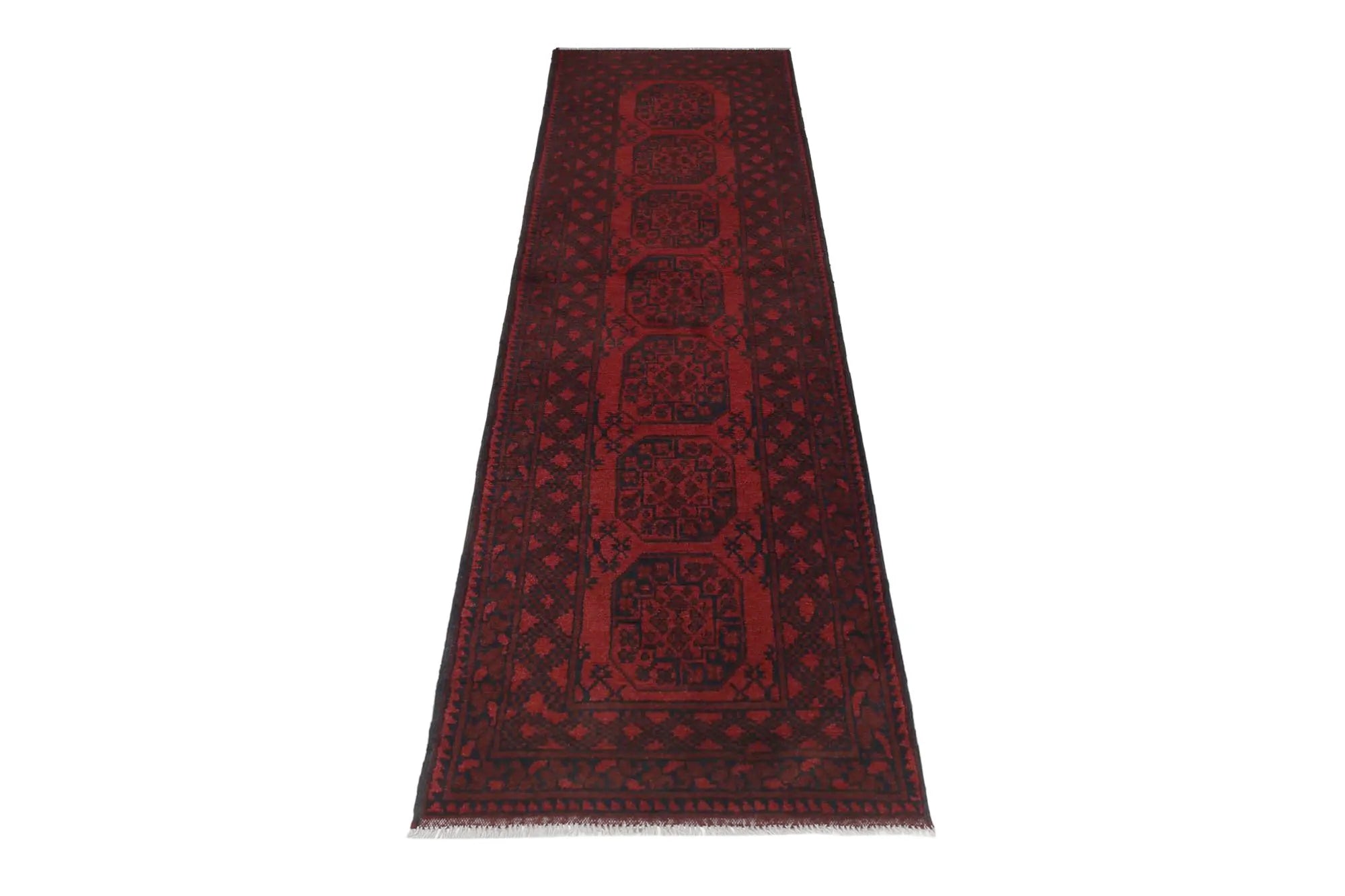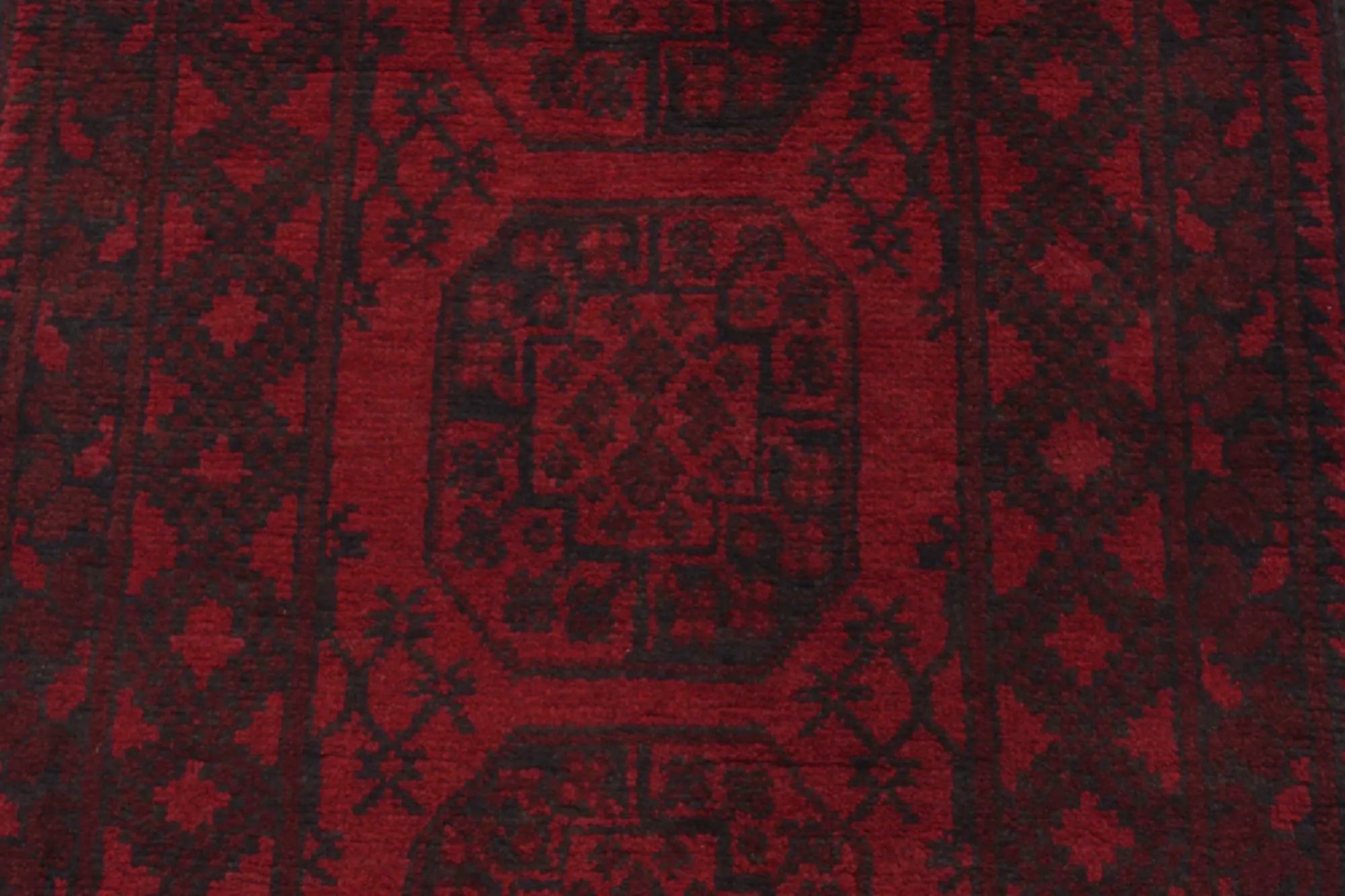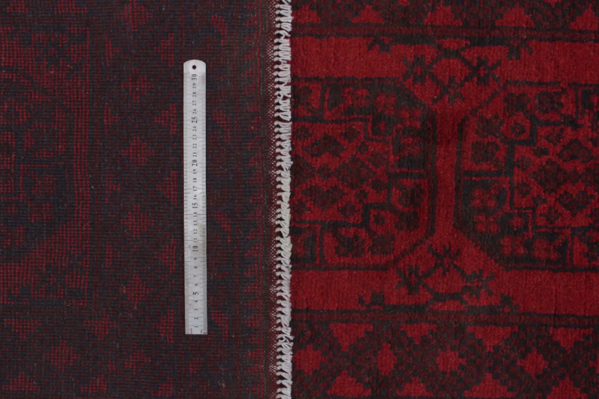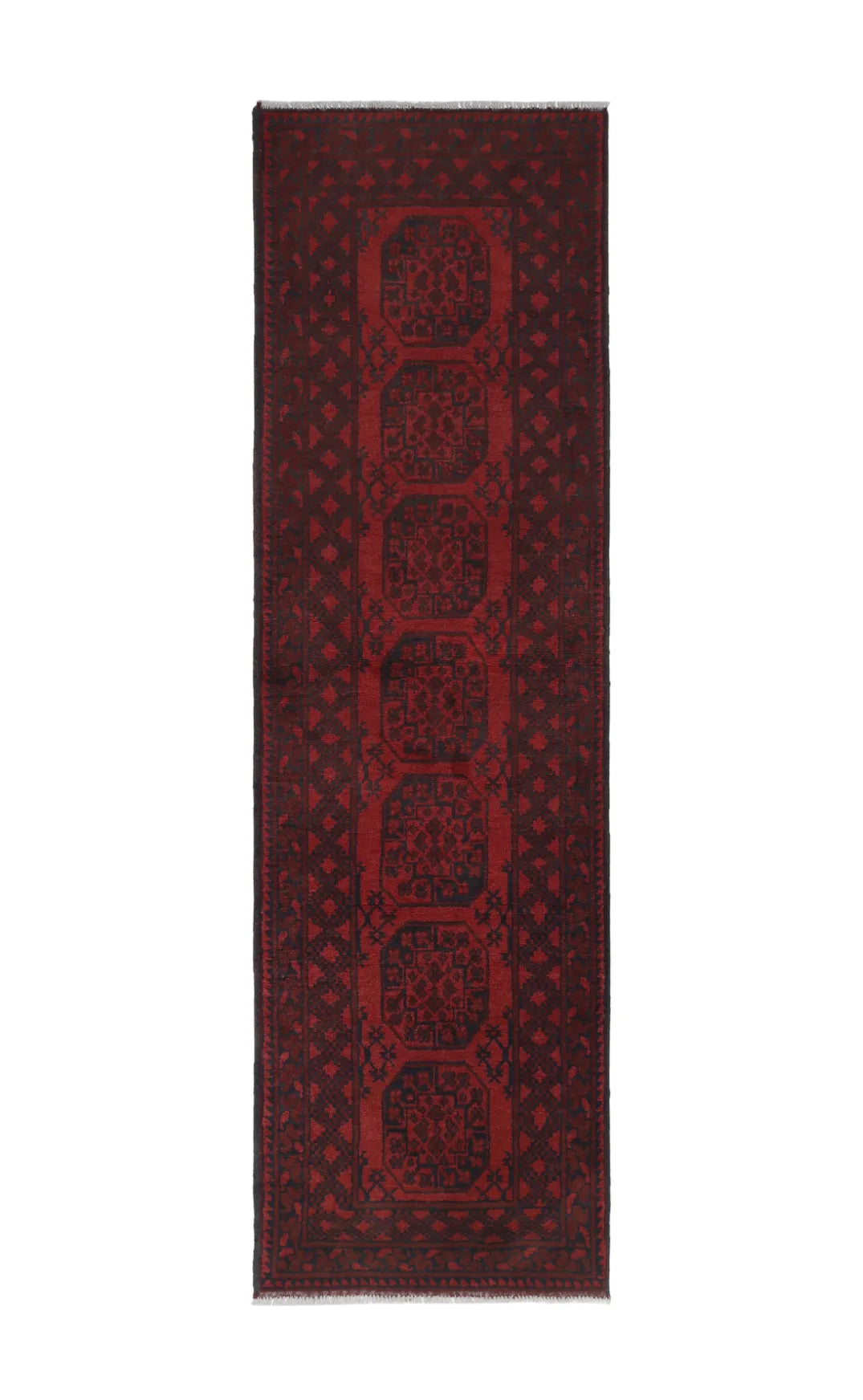 Discover this exquisite hand-knotted Akche rug from Afghanistan, crafted in rich, deep red and black tones that bring warmth and elegance to any interior. Made from 100% pure wool, including the fringes, it contains no synthetic materials, giving it a naturally soft, durable, and authentic feel. The traditional “elephant foot” motif, characteristic of Akche rugs, adds a timeless and culturally rich expression. A perfect choice for anyone seeking a rug that unites craftsmanship, character, and classic oriental beauty.