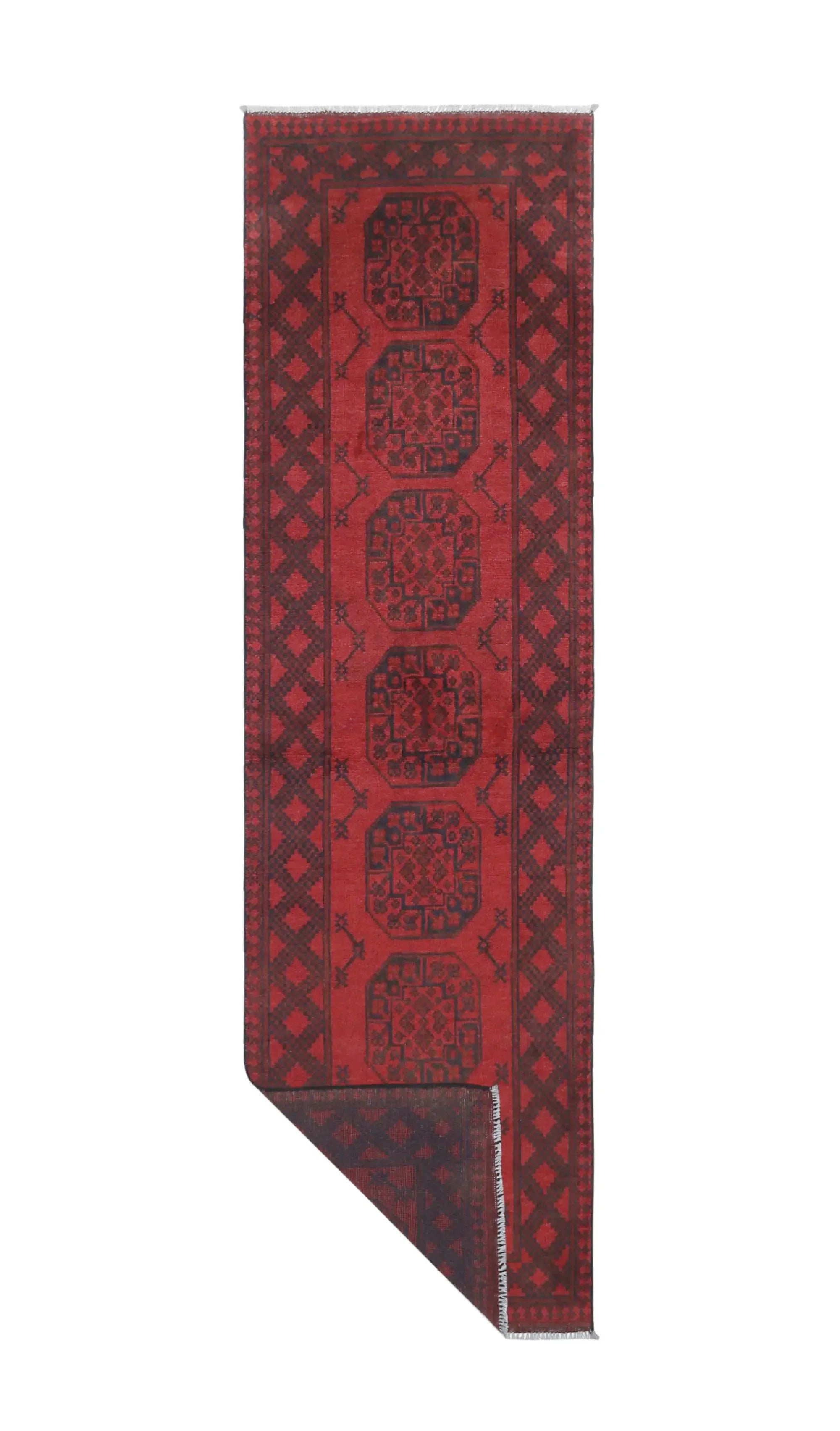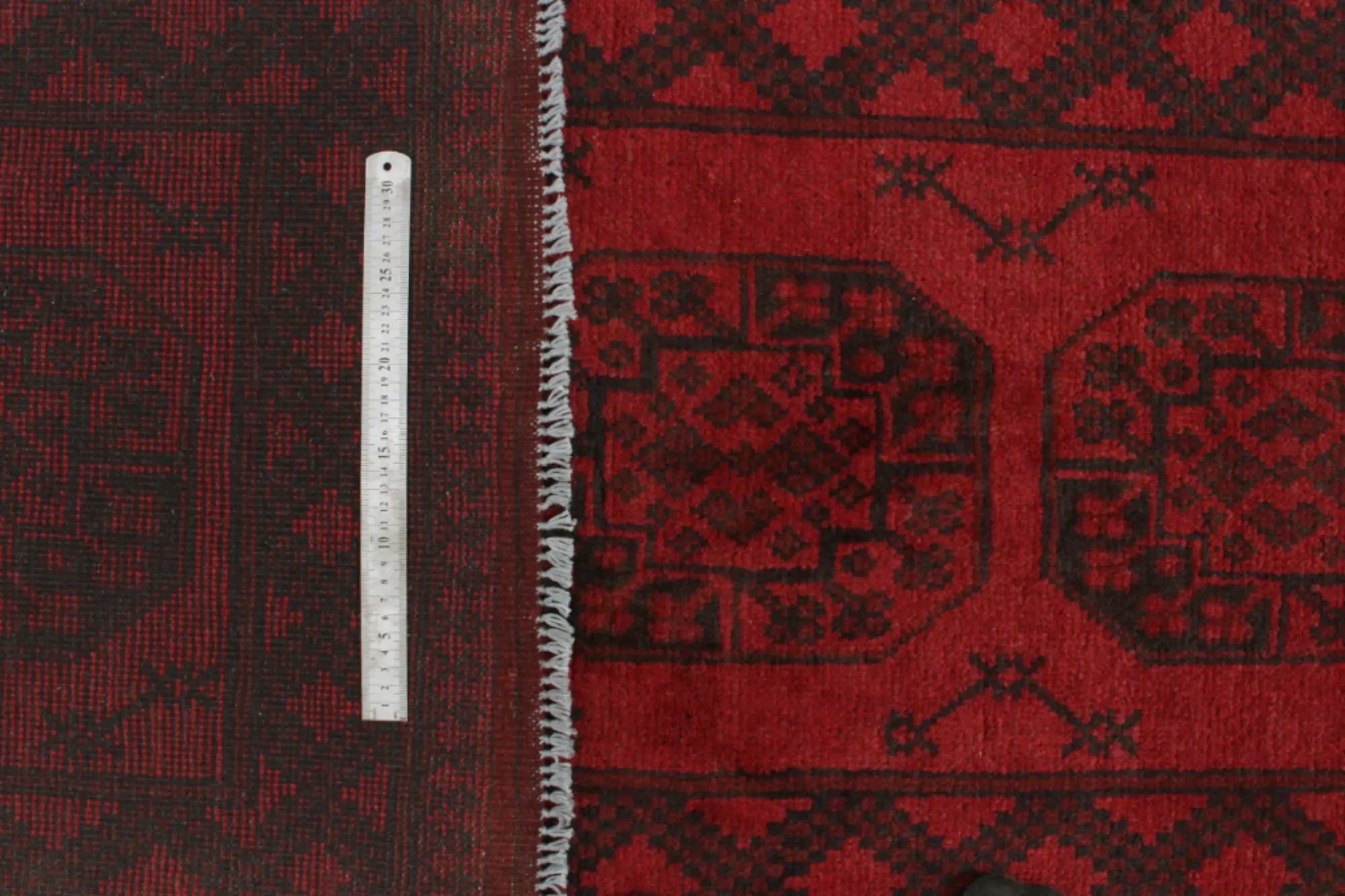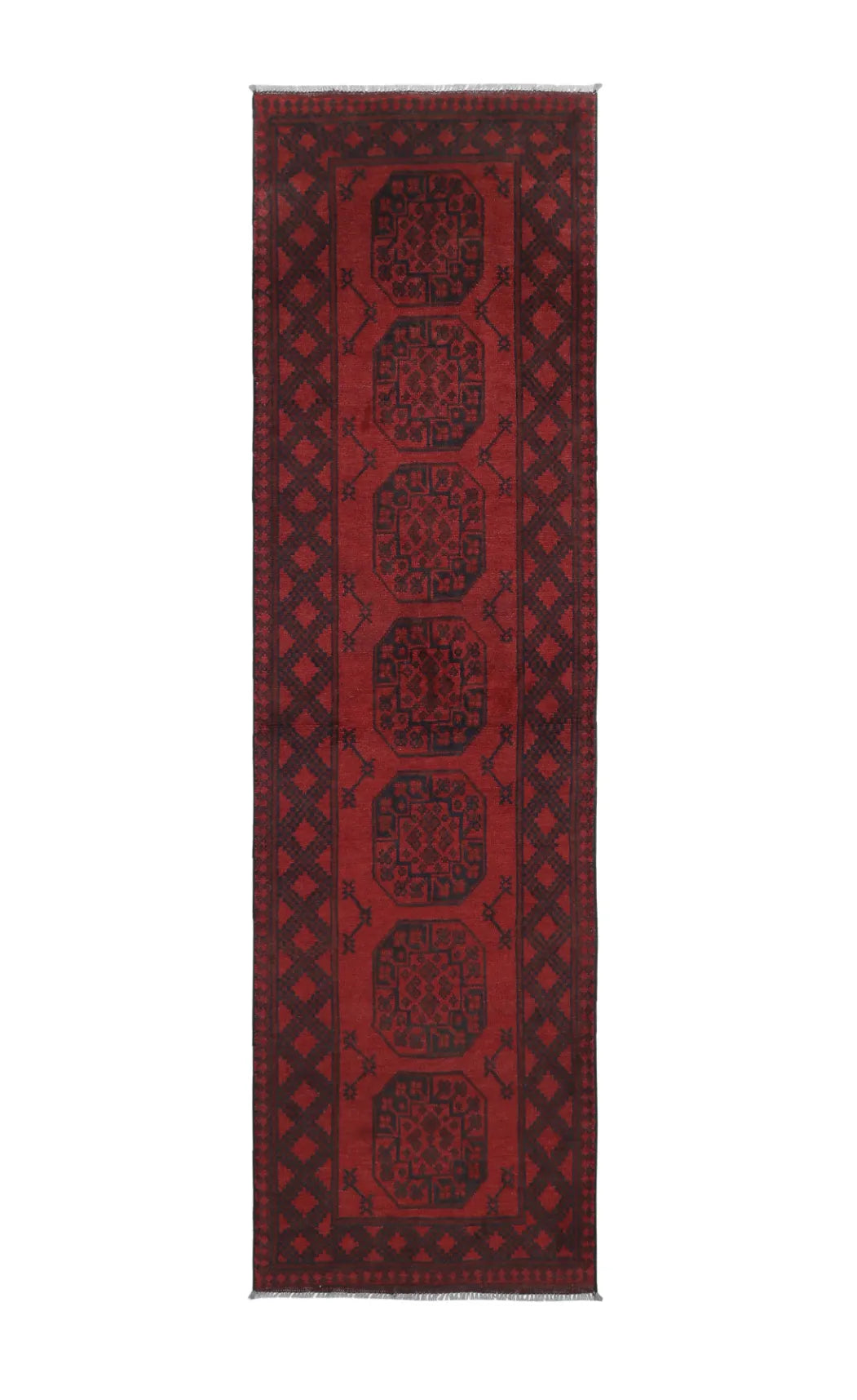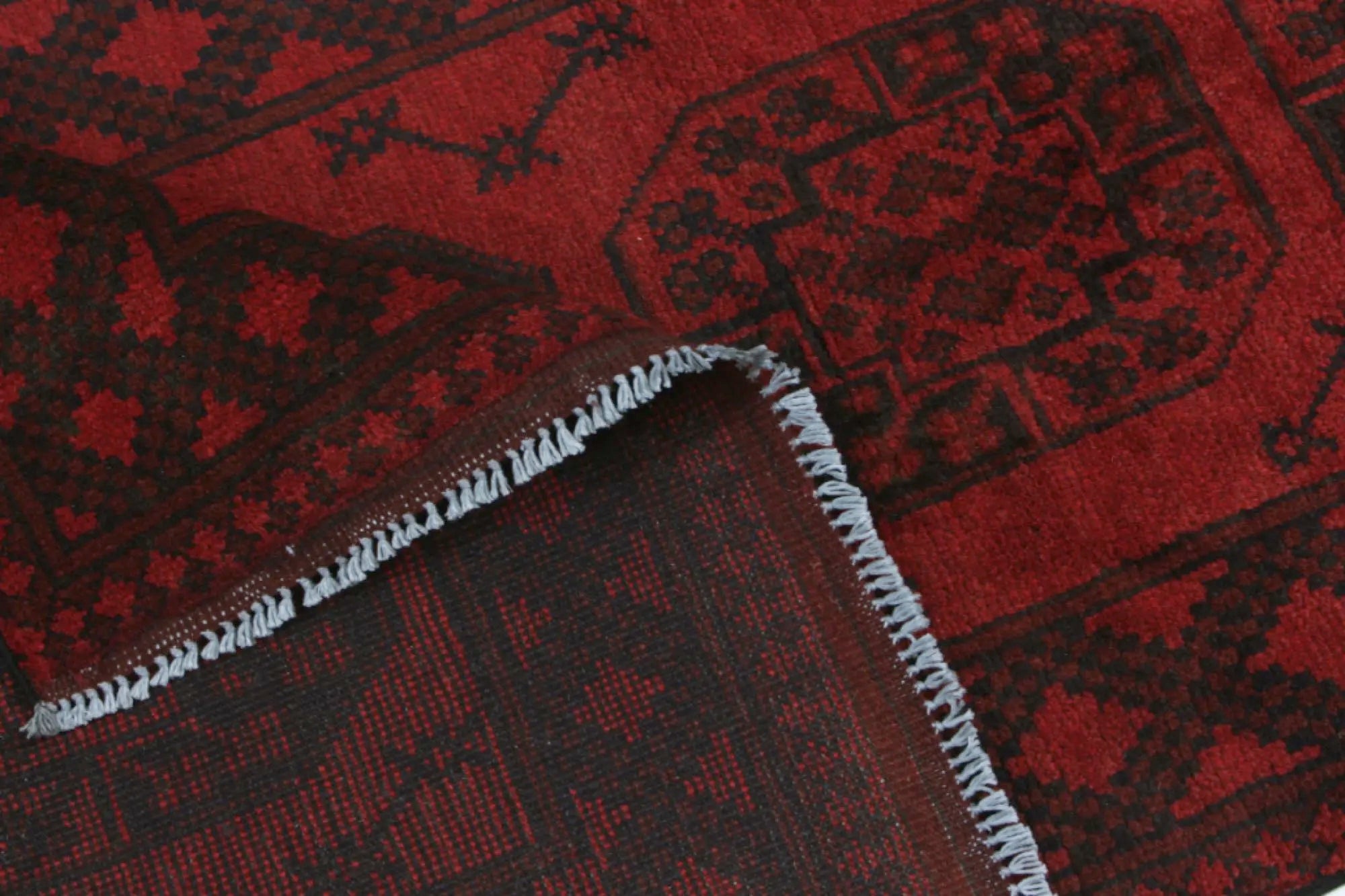 Discover this exquisite hand-knotted Akche rug from Afghanistan, crafted in rich, deep red and black tones that bring warmth and elegance to any interior. Made from 100% pure wool, including the fringes, it contains no synthetic materials, giving it a naturally soft, durable, and authentic feel. The traditional “elephant foot” motif, characteristic of Akche rugs, adds a timeless and culturally rich expression. A perfect choice for anyone seeking a rug that unites craftsmanship, character, and classic oriental beauty.