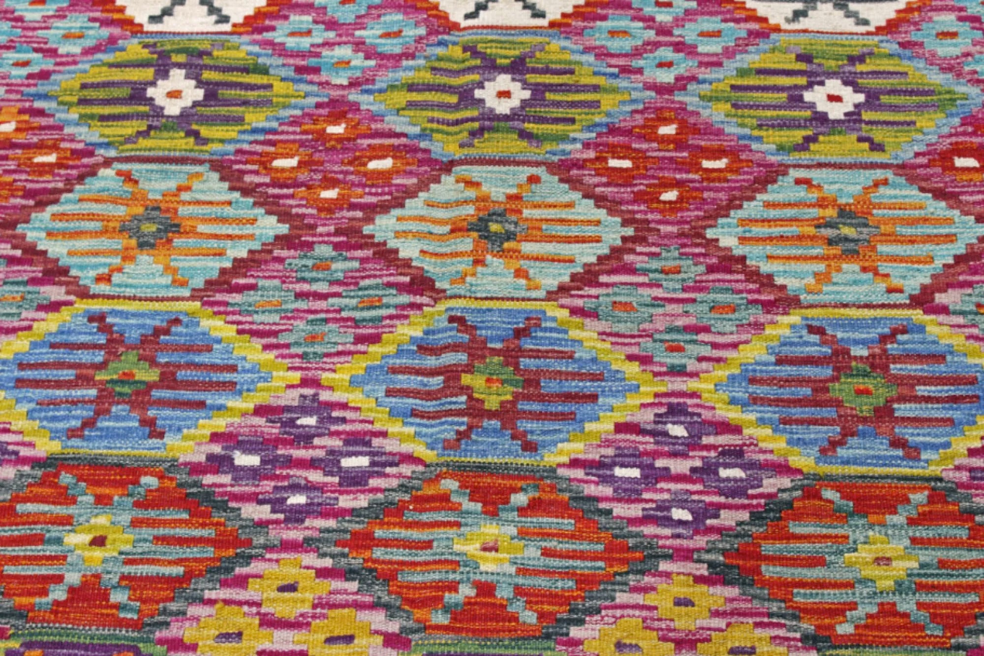 A Masterpiece of Afghan Craftsmanship with Caucasian Inspiration. Kelim Chobi rugs are a brilliant e x ample of traditional Afghan craftsmanship, combining both quality and aesthetic finesse. These rugs are uniquely handwoven in Afghanistan and carry a rich history of craftsmanship, where traditional techniques have been passed down through generations. What makes Kelim Chobi rugs particularly remarkable is their distinct design, heavily influenced by Caucasian patterns. The geometric shapes and symmetrical patterns, typical of Caucasian rugs, give Kelim Chobi rugs their unique and timeless character. The colors used in Kelim Chobi rugs are often subdued and natural, providing them with an elegant and sophisticated look. These colors are derived from natural dyes, which not only provide a durable and authentic color palette but also reflect a deep respect for nature and traditional methods. Each Kelim Chobi rug is handwoven with the utmost care and precision, ensuring high quality and durability. The rugs are flat-woven, giving them a smooth surface and making them both practical and easy to maintain. Thanks to their combination of Afghan craftsmanship and Caucasian design, Kelim Chobi rugs are a popular choice for those looking for a beautiful and timeless decorative element that can enhance any room. These rugs are not only practical floor coverings but also artworks that tell a story of tradition and culture. If you are looking for a rug that combines traditional craftsmanship with stylish design, Kelim Chobi rugs are an e x cellent choice. Their timeless beauty and durable quality make them a perfect investment for your home.
