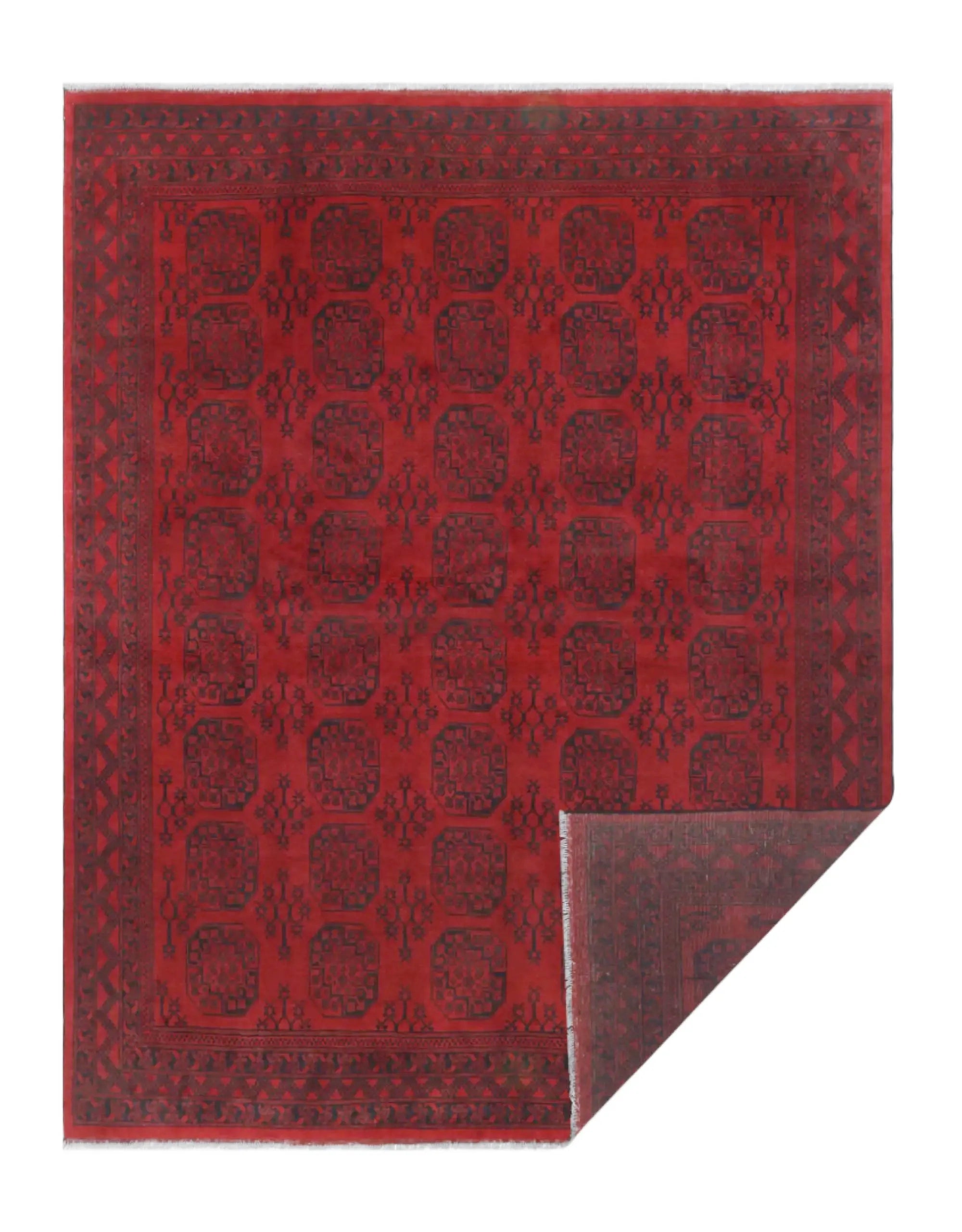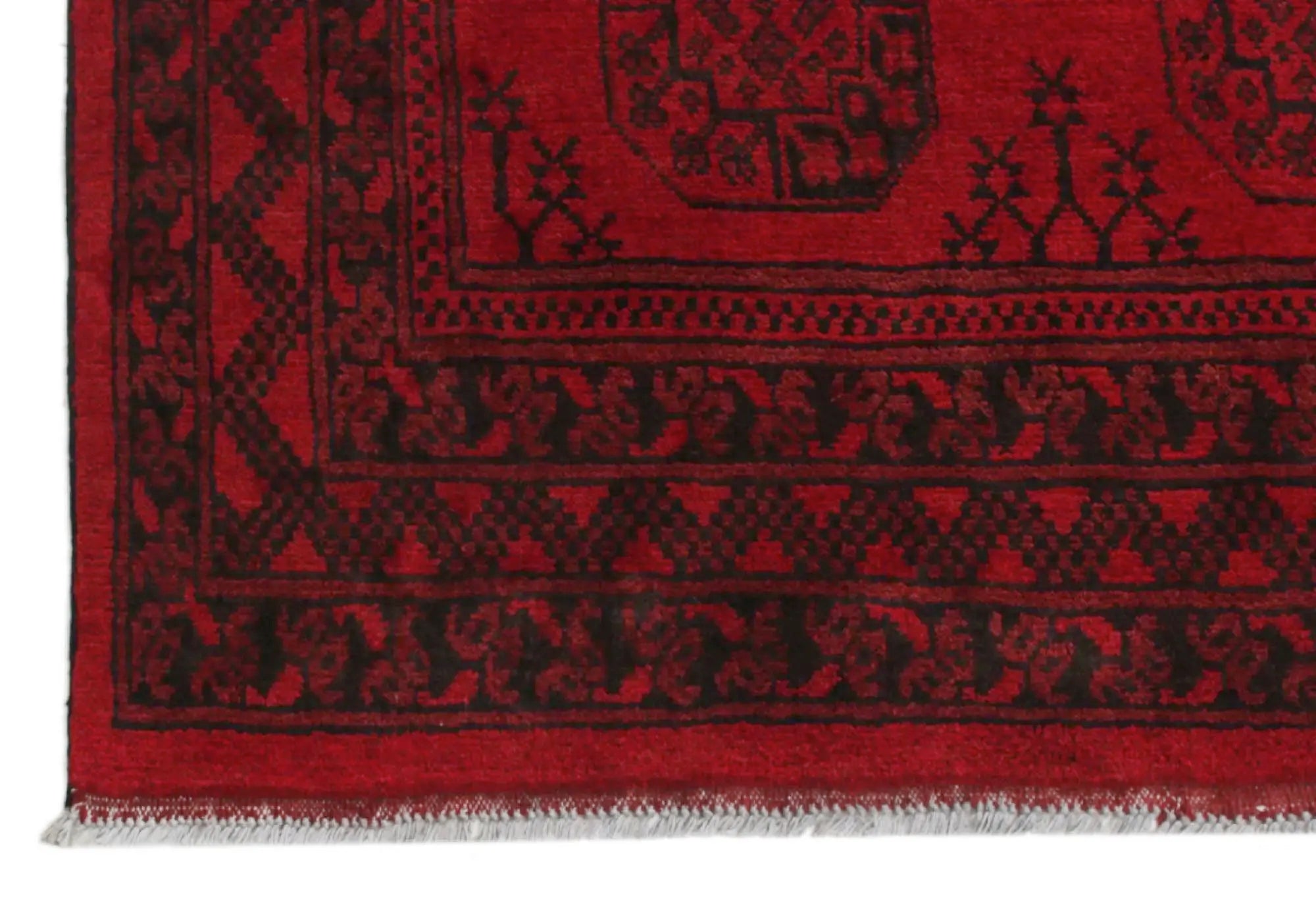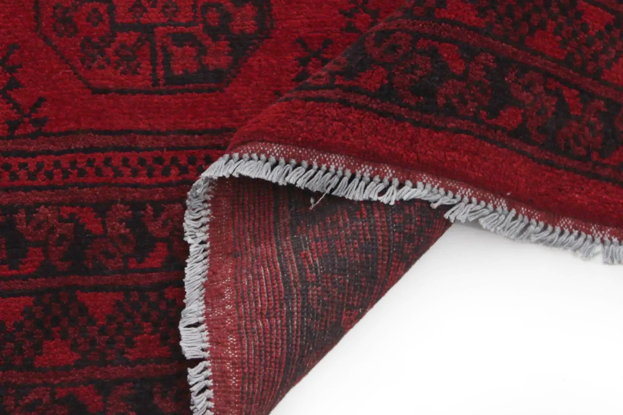 Discover this exquisite hand-knotted Akche rug from Afghanistan, crafted in rich, deep red and black tones that bring warmth and elegance to any interior. Made from 100% pure wool, including the fringes, it contains no synthetic materials, giving it a naturally soft, durable, and authentic feel. The traditional “elephant foot” motif, characteristic of Akche rugs, adds a timeless and culturally rich expression. A perfect choice for anyone seeking a rug that unites craftsmanship, character, and classic oriental beauty.